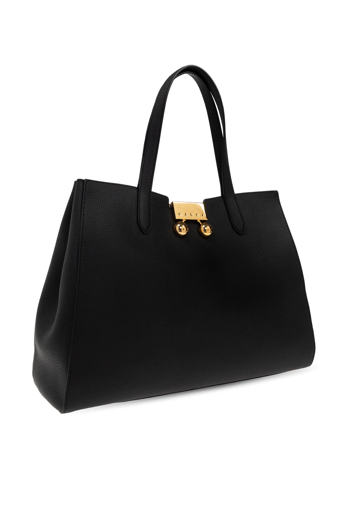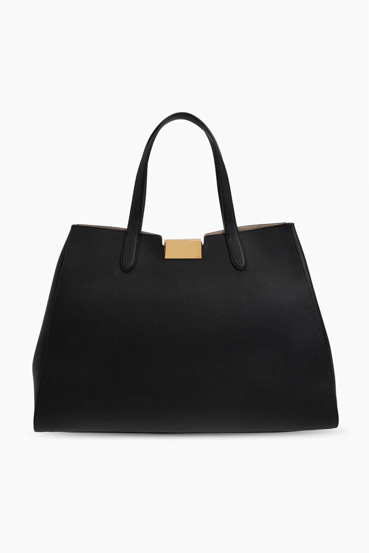 Torba zachwyca klasycznym prostokątnym kształtem z delikatnie zaokrąglonymi krawędziami, a jej głęboki czarny kolor dodaje jej ponadczasowej elegancji. Złote elementy metalowe, w tym unikalne zamknięcie z dwoma kulkami oraz logo marki na metalowej płytce, podkreślają ekskluzywny charakter produktu.