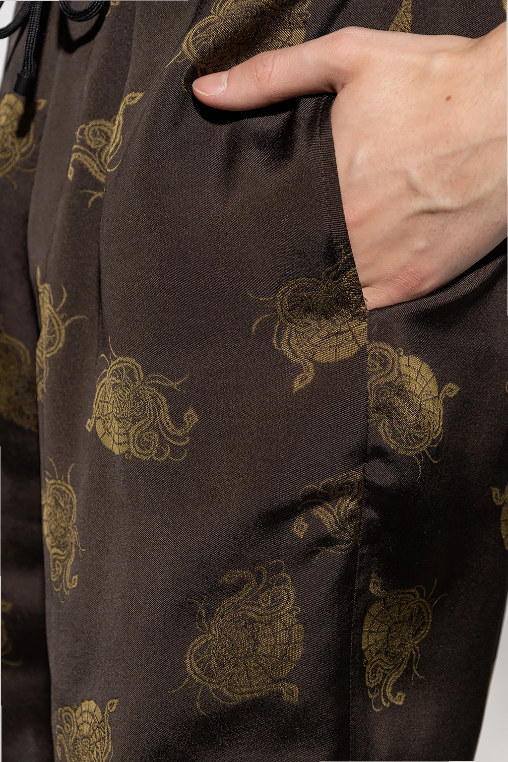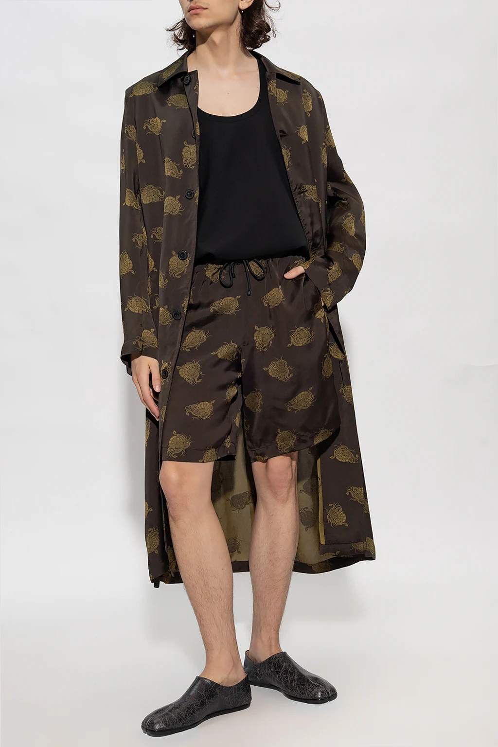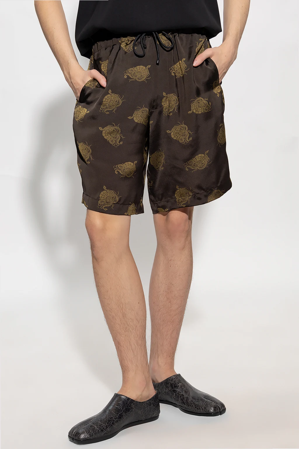 Szorty w kolorze khaki Dries Van Noten. W pasie ściągane trokami. Ozdobione wyszytym dekoracyjnym wzorem. Trzy kieszenie: dwie z przodu i jedna z tyłu.