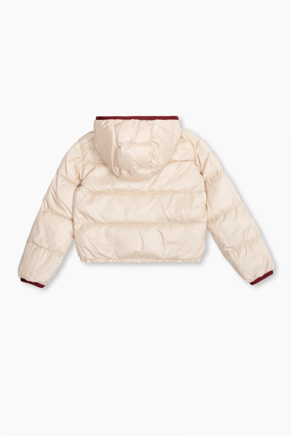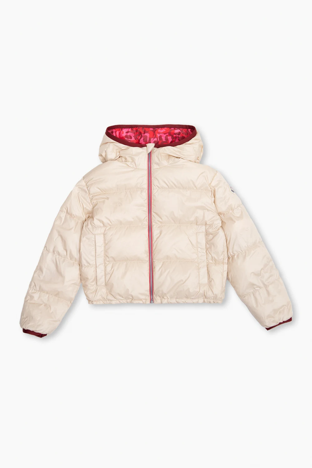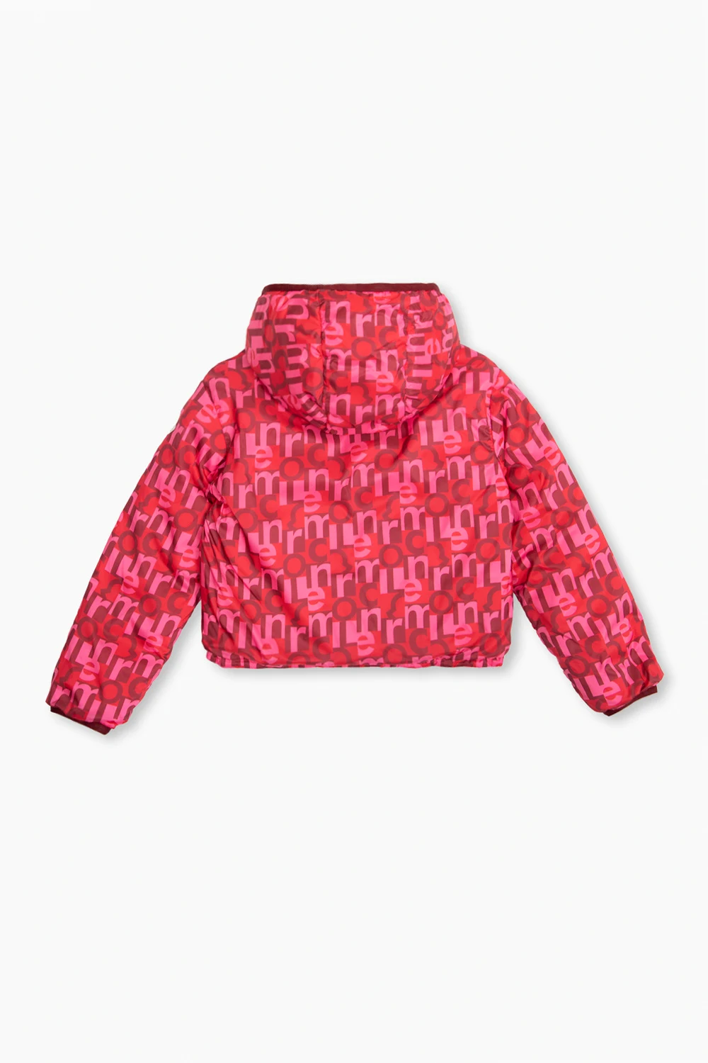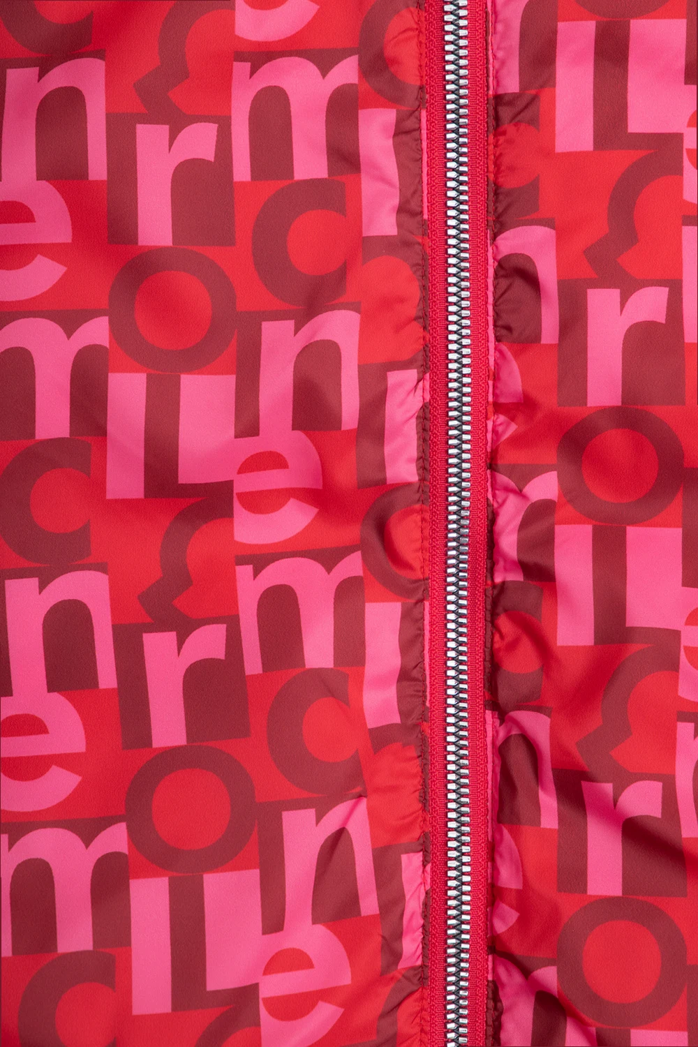 Dwustronna kurtka z kapturem, model ‘Aillis’ Moncler Enfant. Zapinana na zamek. Długie rękawy, na jednym kolorowa naszywka z logo. Z jednej strony czerwono-różowo-bordowa z monogramem. Z przodu dwie kieszenie. Z drugiej strony gładka, pikowana w kolorze beżowym. Z przodu dwie kieszenie zapinane na zatrzask.