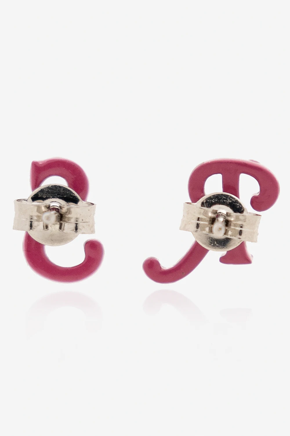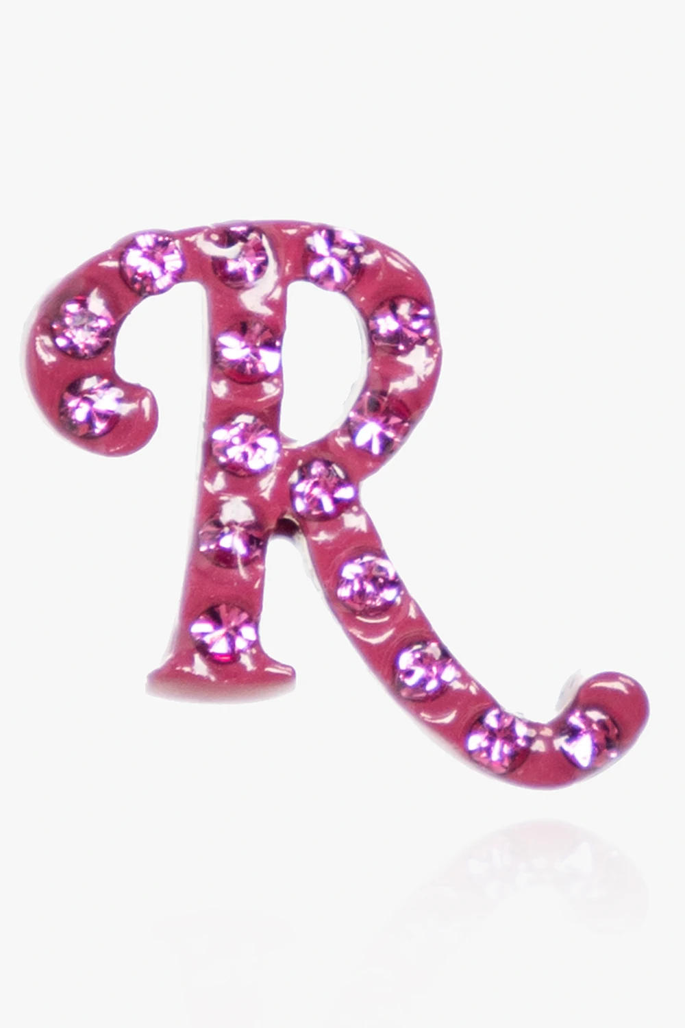 Różowe kolczyki w kształcie logo Raf Simons. Wykonane z mosiądzu. Wykończone połyskującymi kryształami. Zapięcie na sztyft.