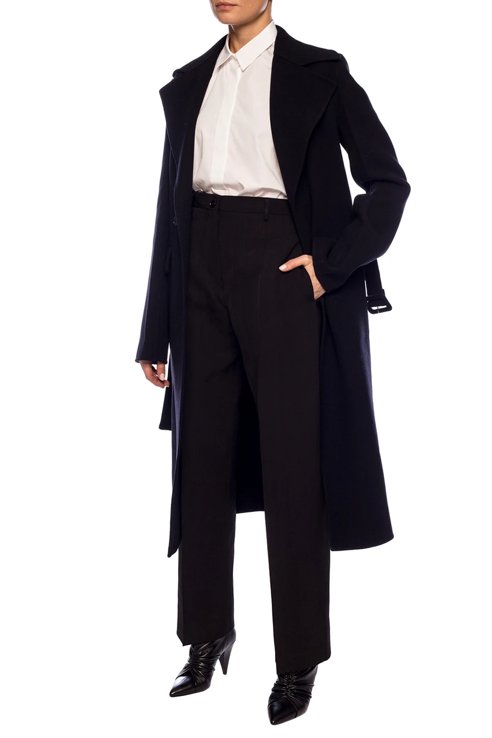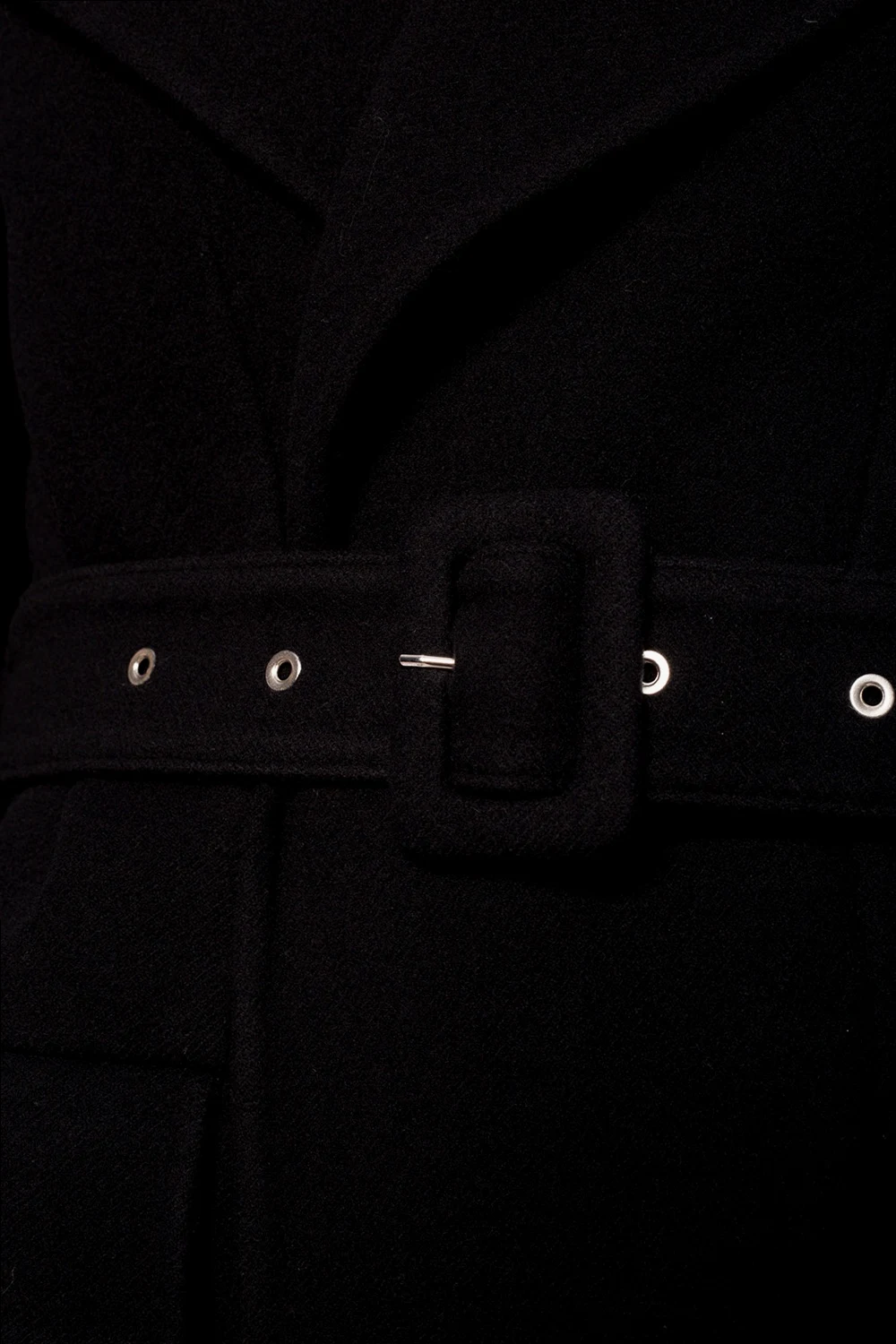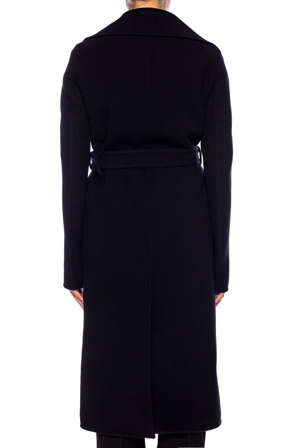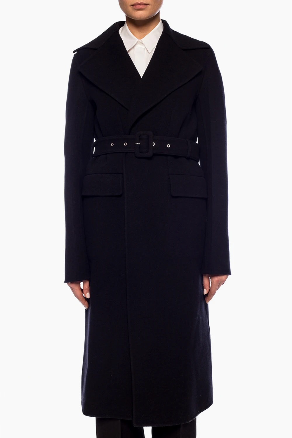 Czarny płaszcz z otwartymi klapami Jil Sander. Wykonany z wełny polarowej. Zapinany na guzik. Dwie wsuwane kieszenie z patką. W pasie dołączony regulowany pasek. Z tyłu rozcięcie.