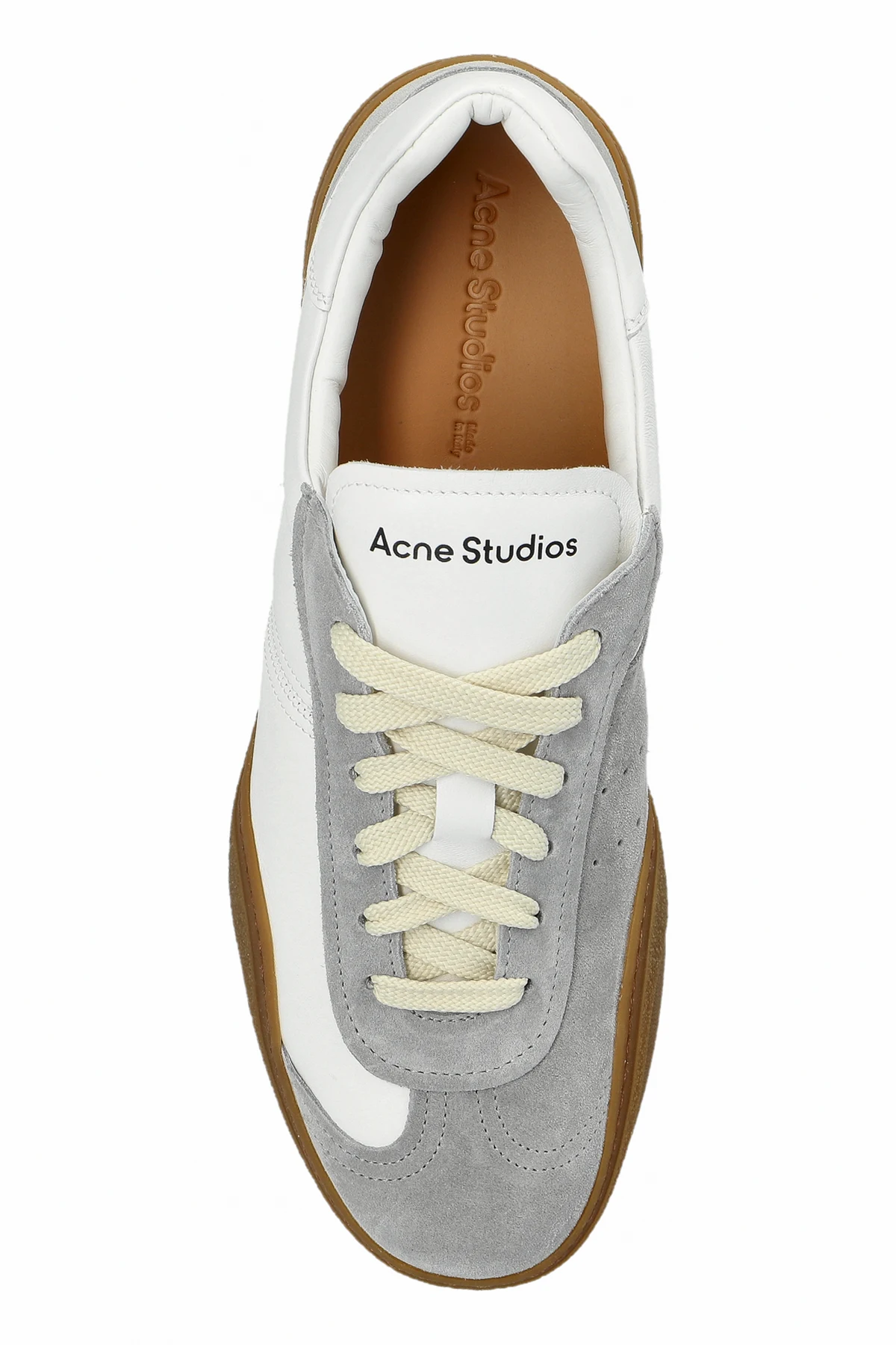 Dominujący biały kolor z subtelnymi szarymi akcentami zamszu na przodzie i wokół pięty podkreśla ich unikalny charakter. Brązowa gumowa podeszwa dodaje kontrastu, zapewniając jednocześnie doskonałą przyczepność i komfort. Detal w postaci napisu "Acne Studios" na języku buta jest subtelnym nawiązaniem do wyjątkowego rodowodu marki.