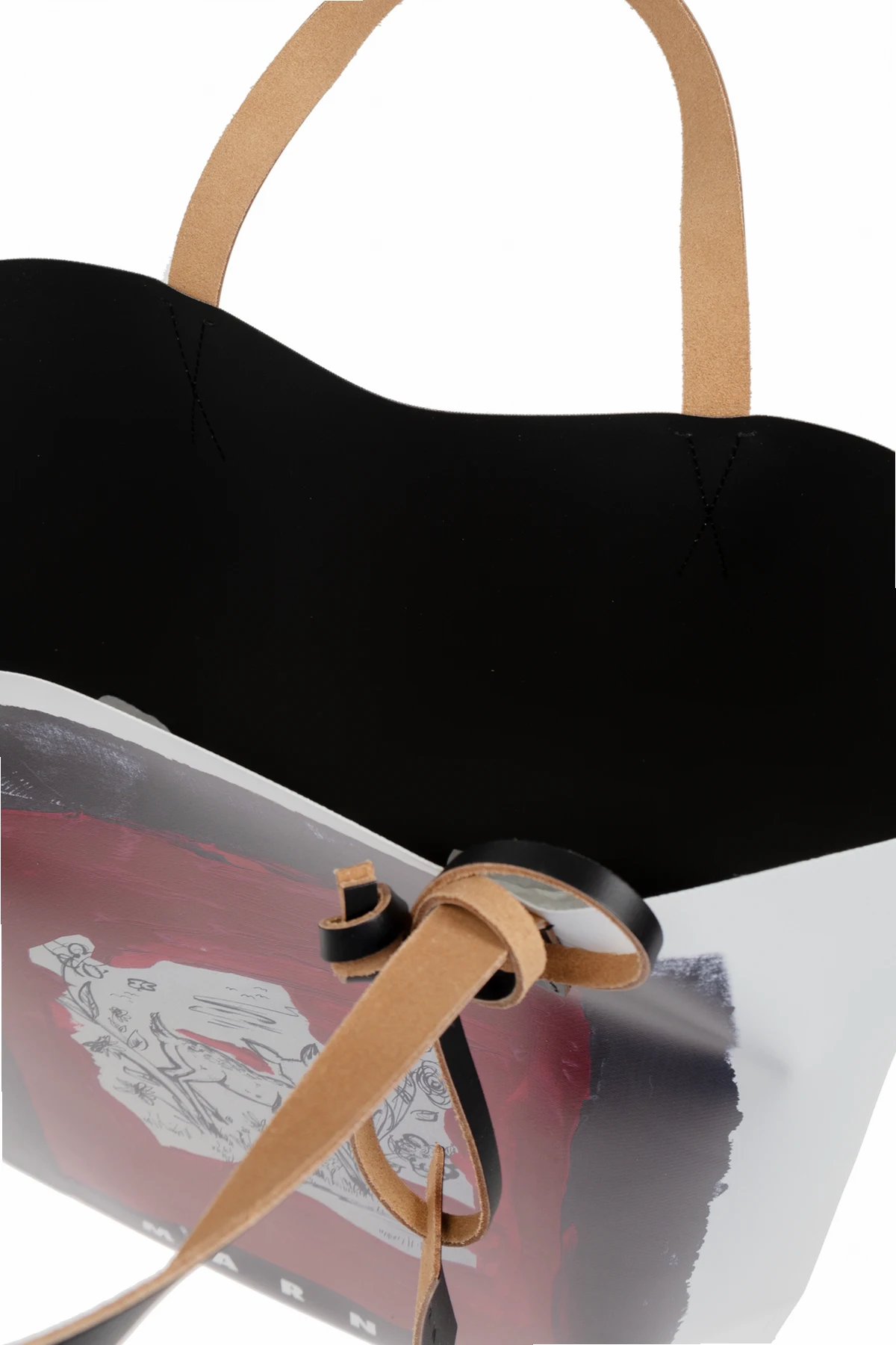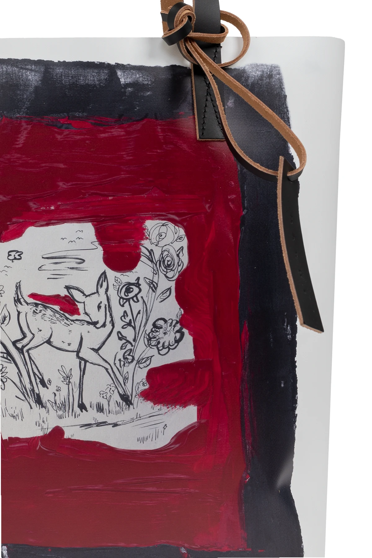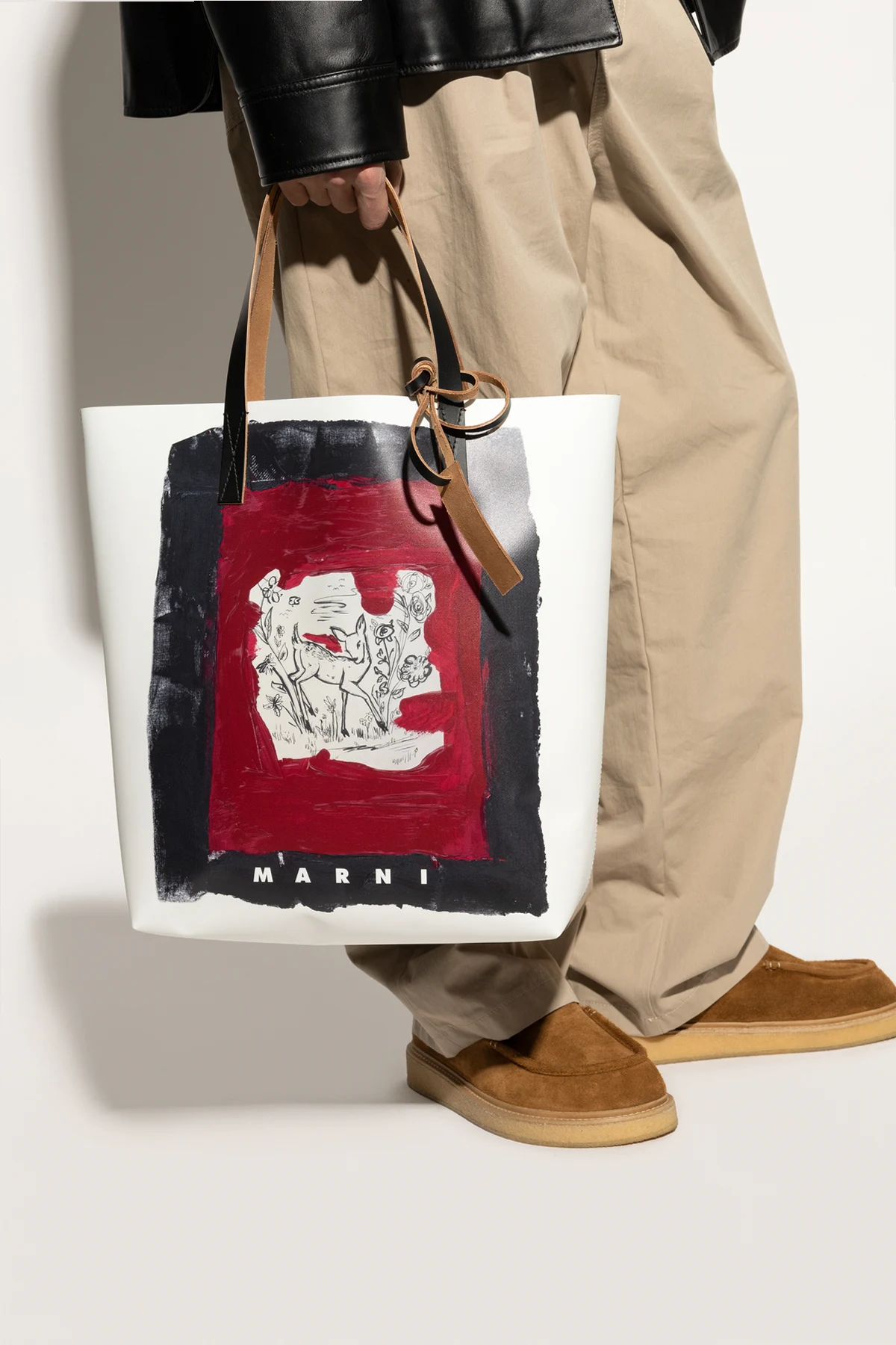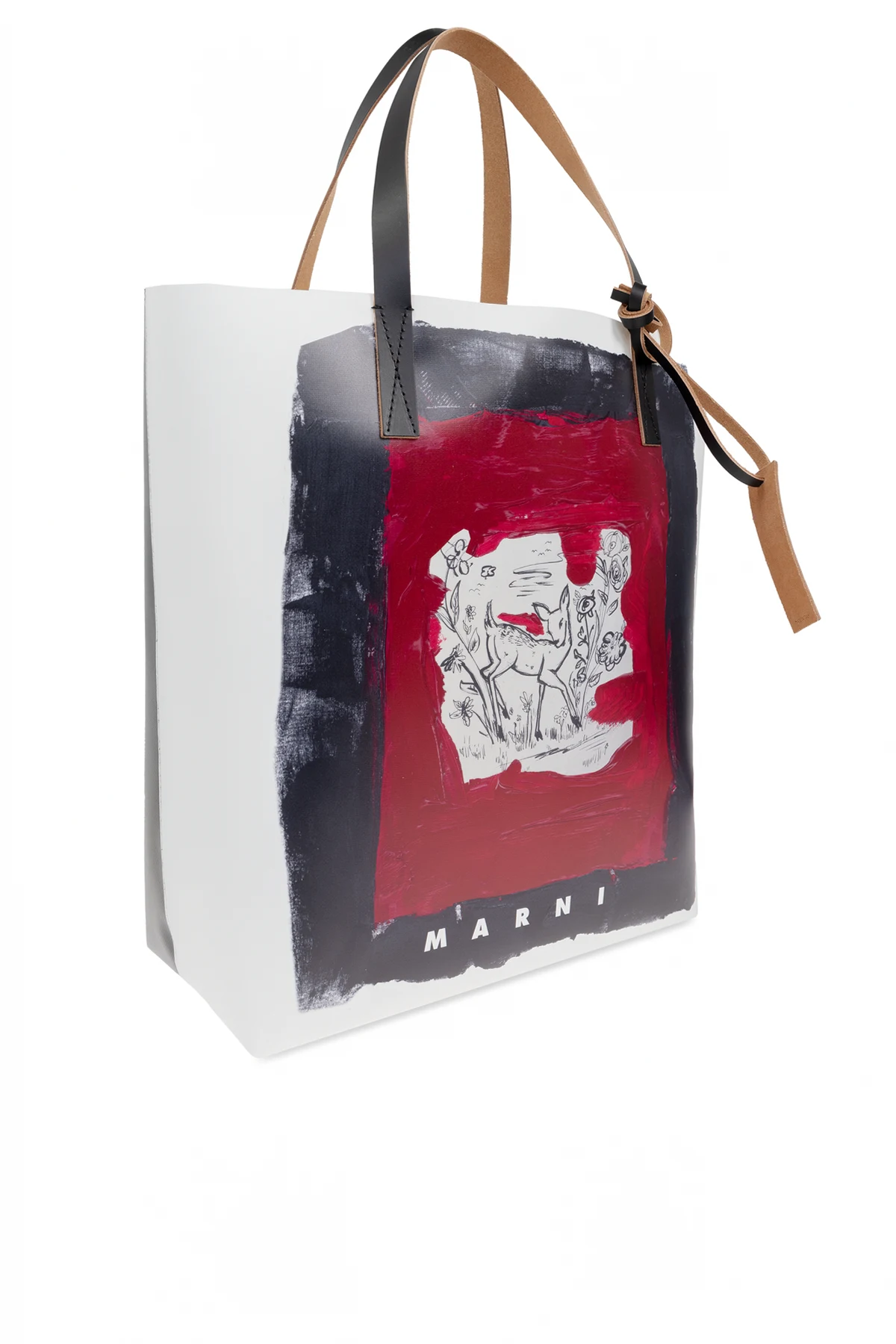 Na froncie torby widnieje unikalna grafika z motywem leśnym, przedstawiająca jelenia i kwiaty. Dominujące barwy to czerwień, czerń i biel, które harmonijnie współgrają z kontrastującymi brązowymi uchwytami. Całość dopełnia napis "MARNI".