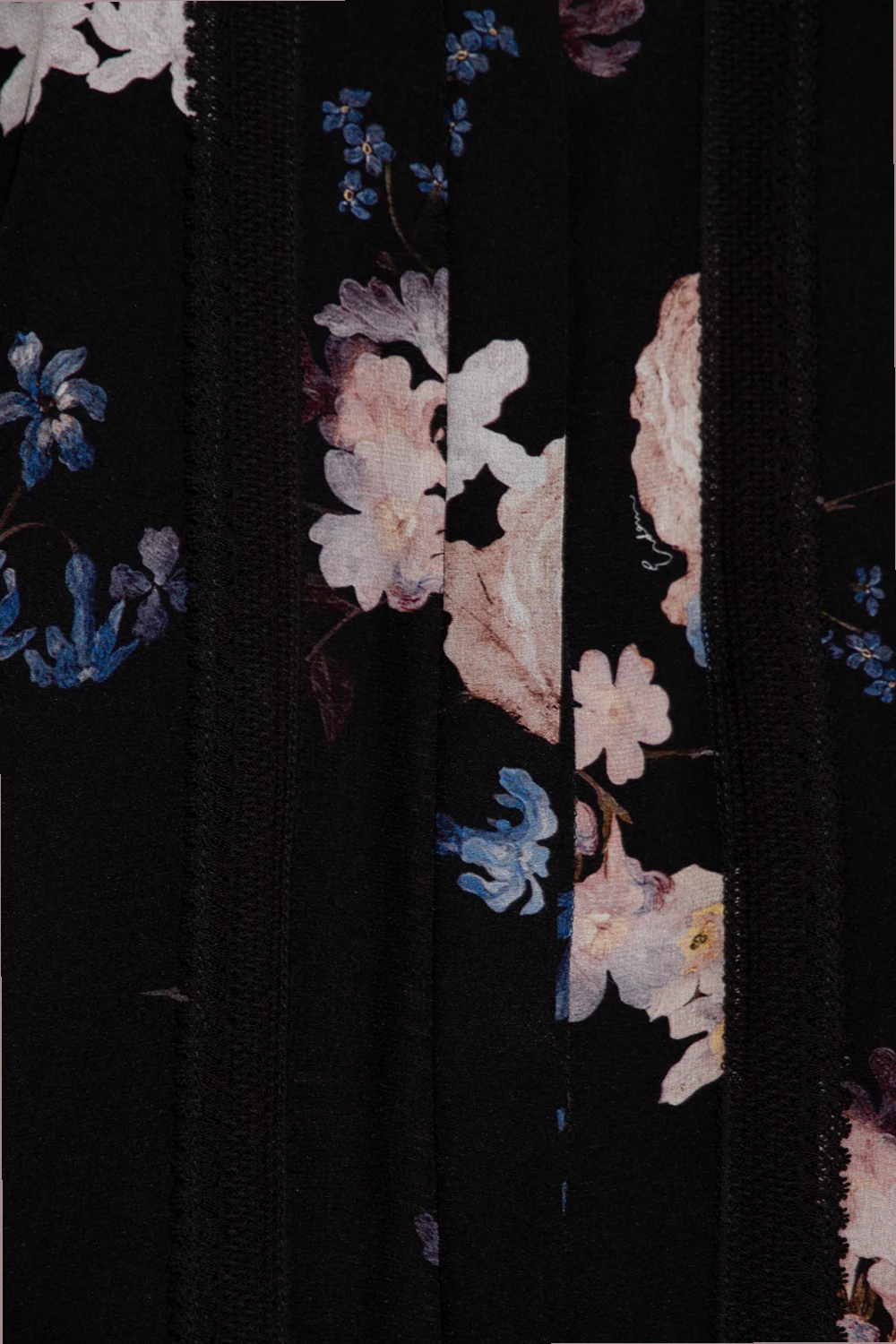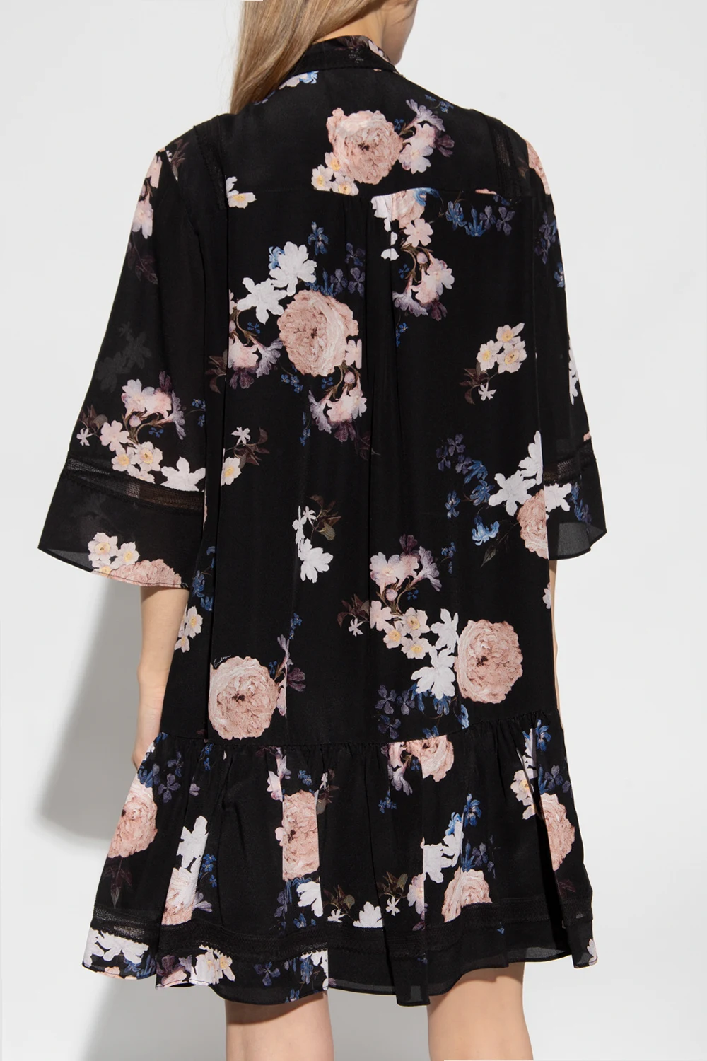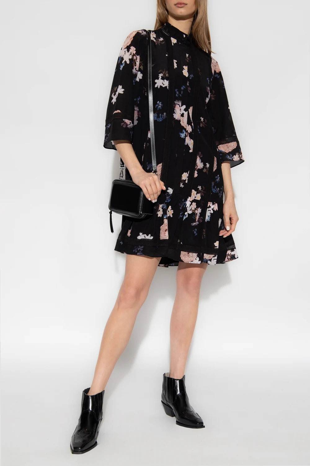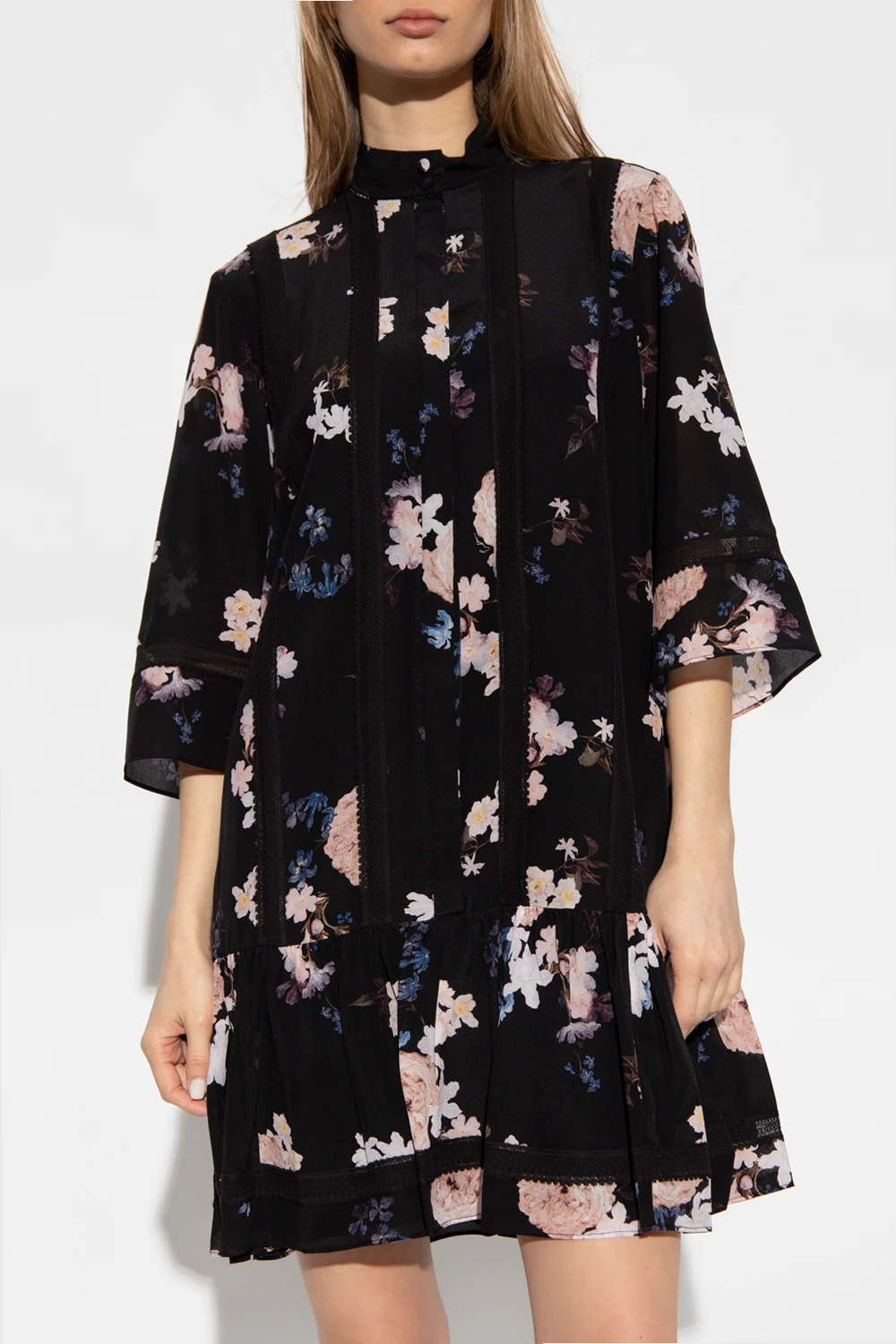 Czarna, krótka sukienka, model ‘Bertram’ Erdem. Wykonana z jedwabiu. Luźny krój zapinany z przodu na guziki z krytą plisą. Ozdobiona kolorowym wzorem z motywem kwiatowym ‘Beatriz Garden’, czerpiącym inspirację z holenderskich obrazów olejnych. Wykończona czarnymi, koronkowymi taśmami. Dekolt ze stójką. Krótkie rękawy. Dół zakończony falbaną.