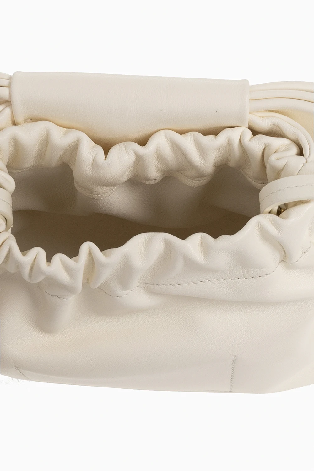 Kremowa torba na ramię, model ‘Bow Small’ Jil Sander. Wykonana ze skóry. Na górze wszyty ściągacz. Z przodu wytłoczone logo i dekoracyjna kokarda. Odpinany pas na ramię. Wewnątrz komora i kieszeń zamykana na zamek. Metalowe elementy w kolorze złotym.