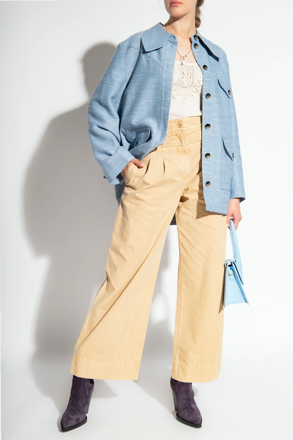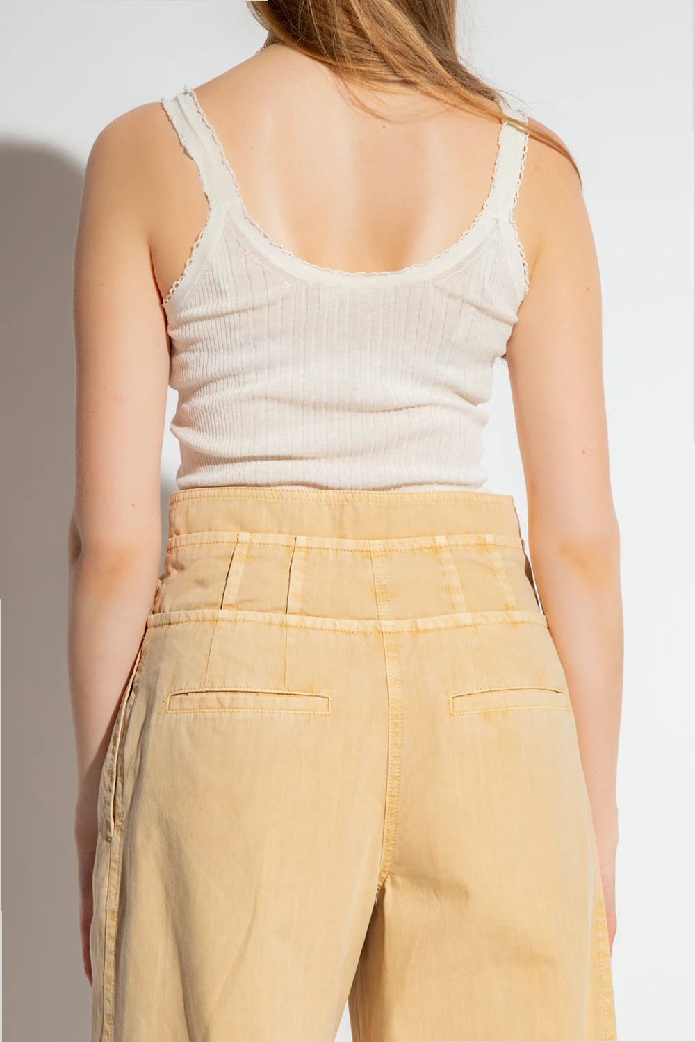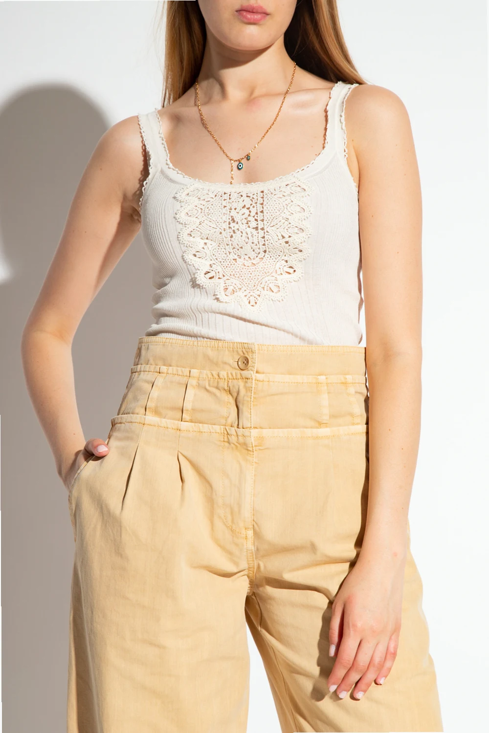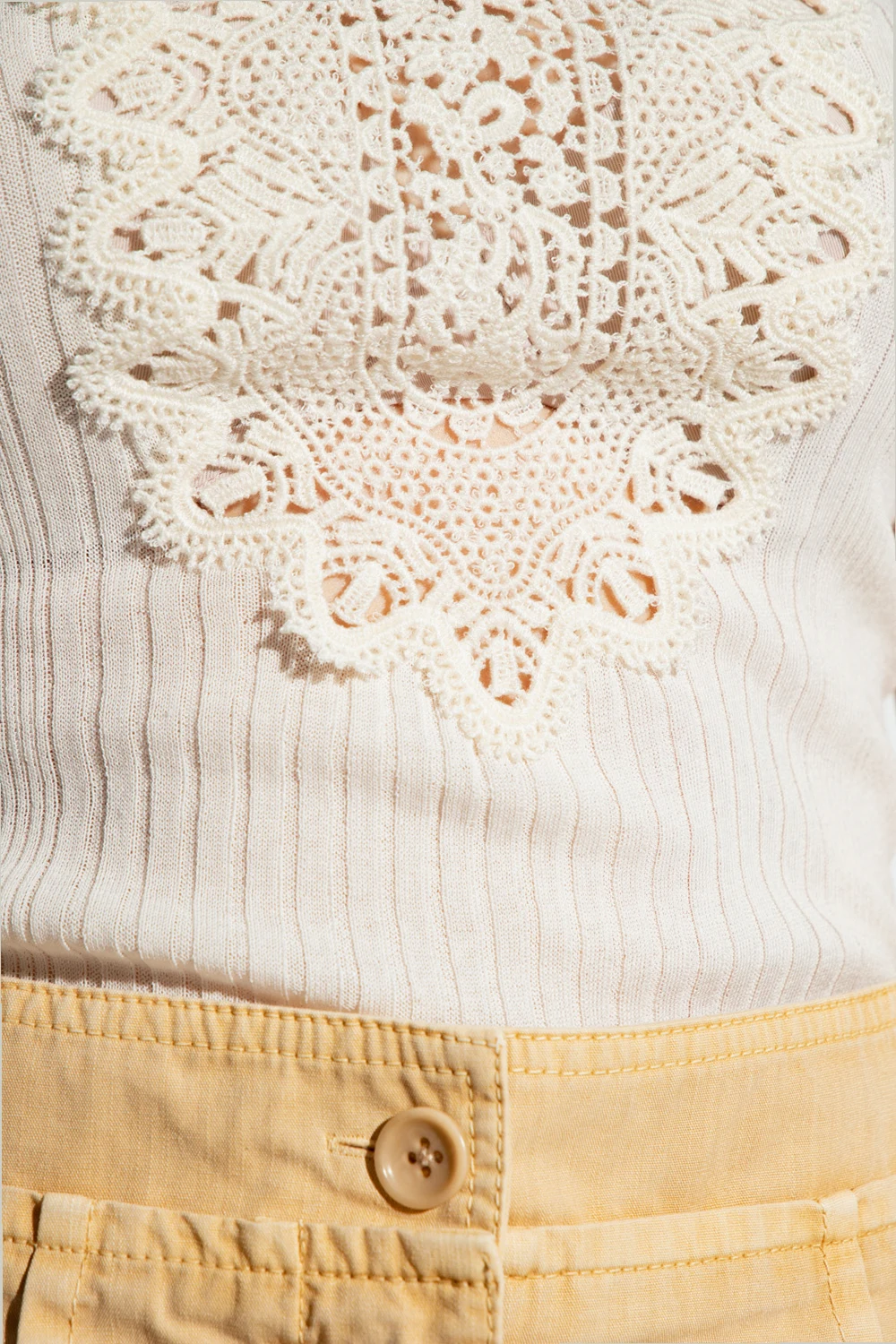 Kremowy, prążkowany top na ramiączkach, model ‘Ameline’ Ulla Johnson. Wykonany z mieszanki bawełny, lnu i jedwabiu. Dopasowany krój z przodu ozdobiony szydełkową wstawką. Dekolt i ramiona dekoracyjnie wykończone.