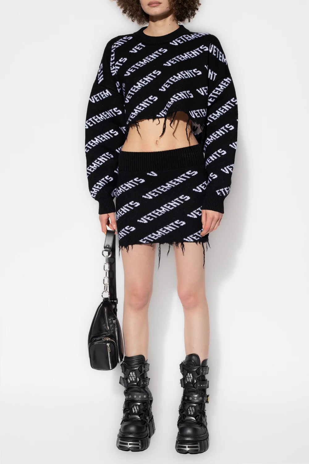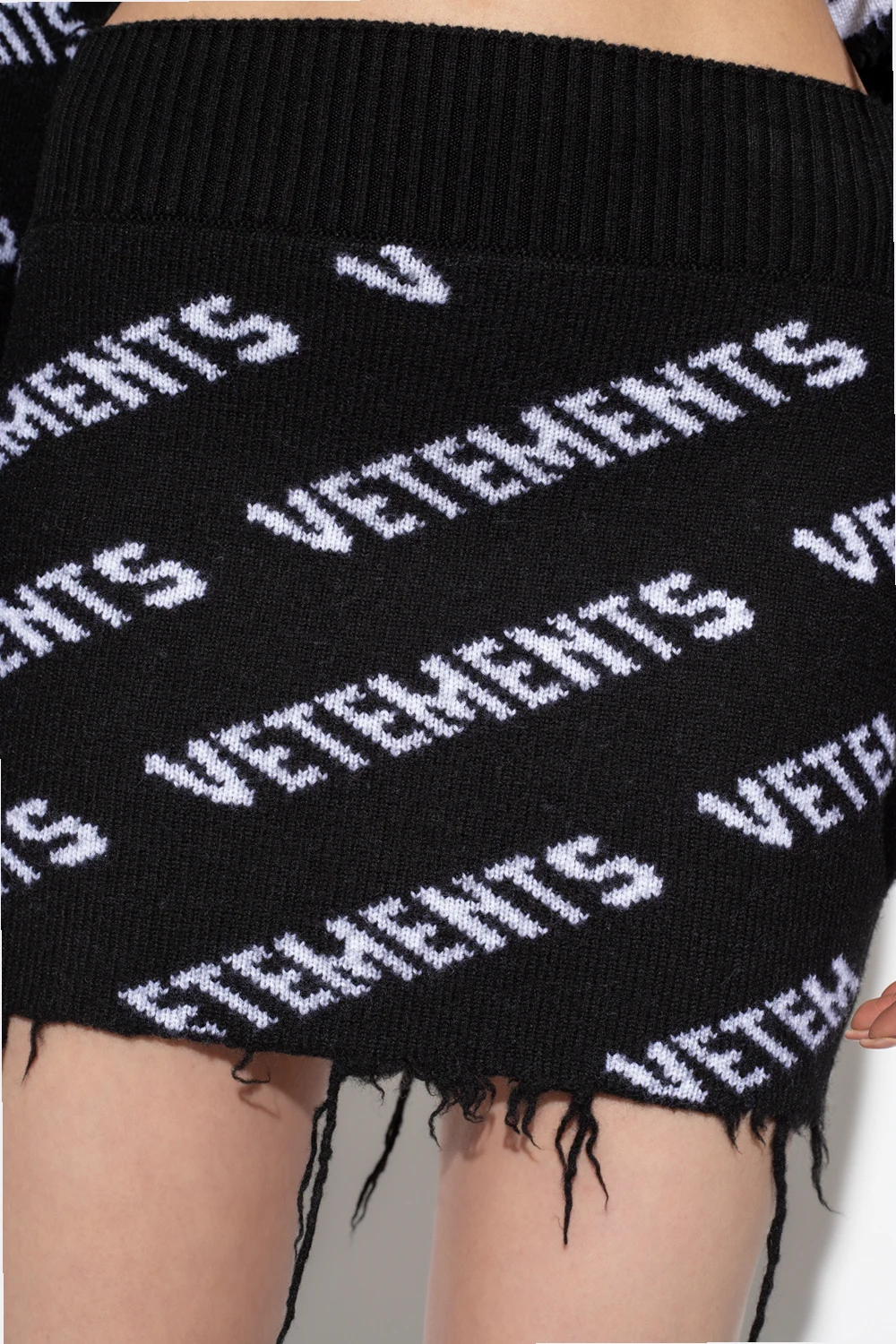Czarna, krótka spódnica VETEMENTS. Wykonana z wełny merino. W pasie wszyty ściągacz. Ozdobiona wzorem z logo w kolorze białym. Surowo wykończony dół.
