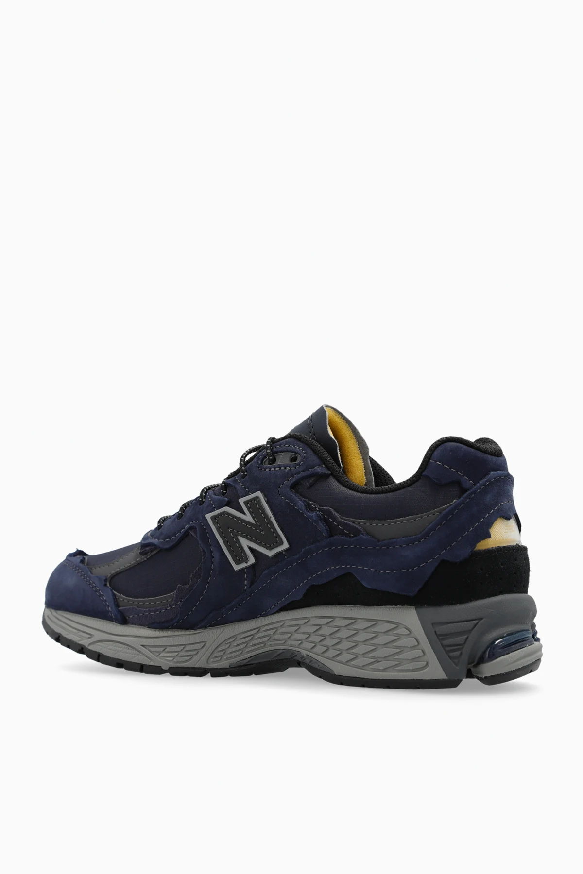 Sznurowane buty sportowe w kolorze granatowym, model ‘M2002RDO’ New Balance. Wykonane ze skóry i materiału. Ozdobione nakładającymi się na siebie szorstkimi, zamszowymi elementami oraz logo. Wyposażone w systemy amortyzacji N–Durance i N-Ergy. Dodatkowe wsparcie śródstopia technologią Stability Web. Gumowa podeszwa w kolorze szaro-granatowym.