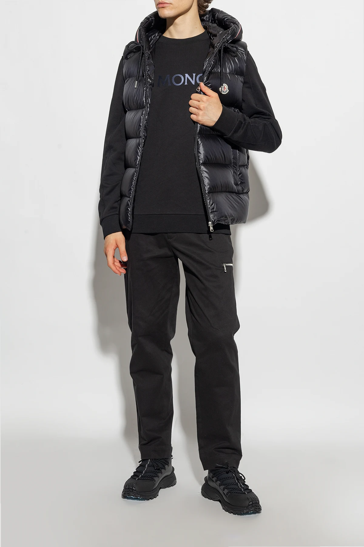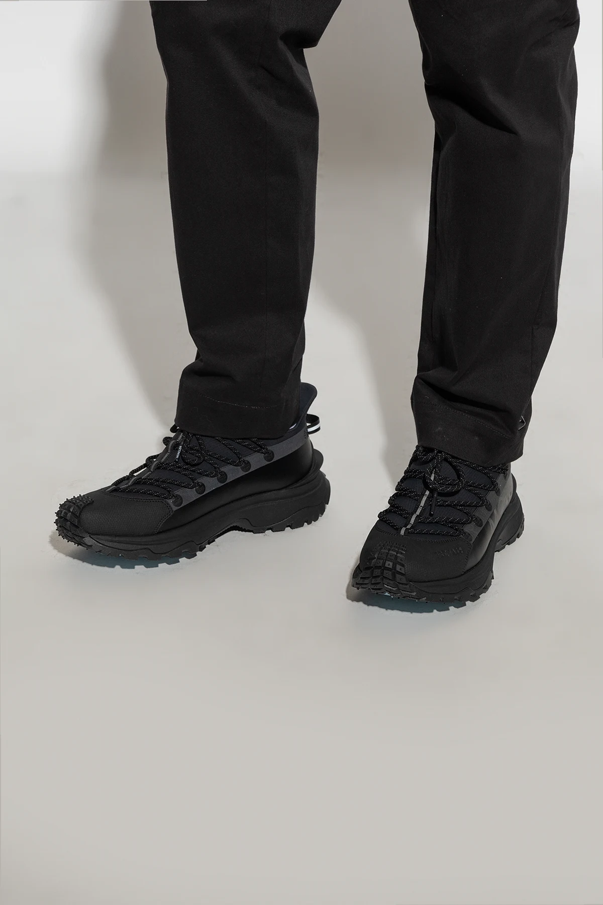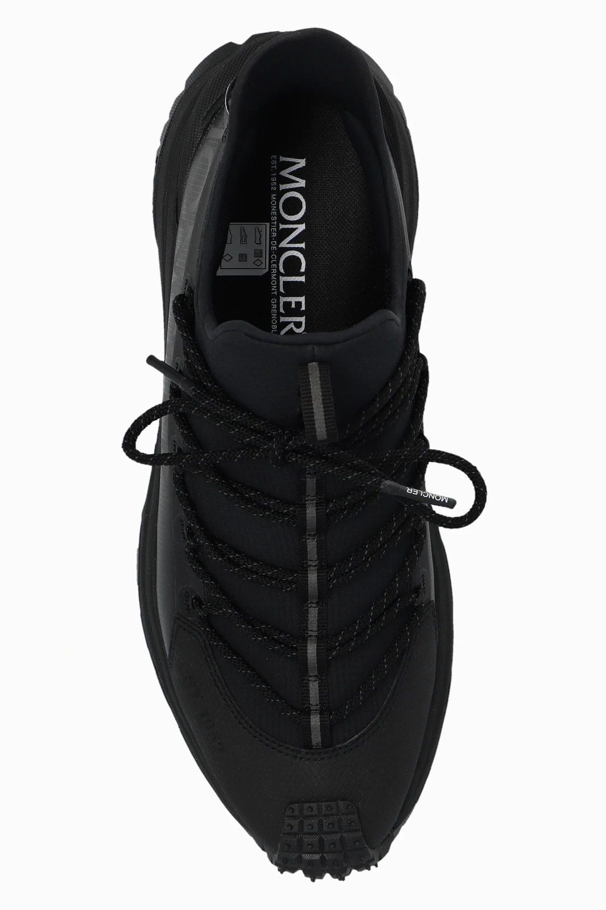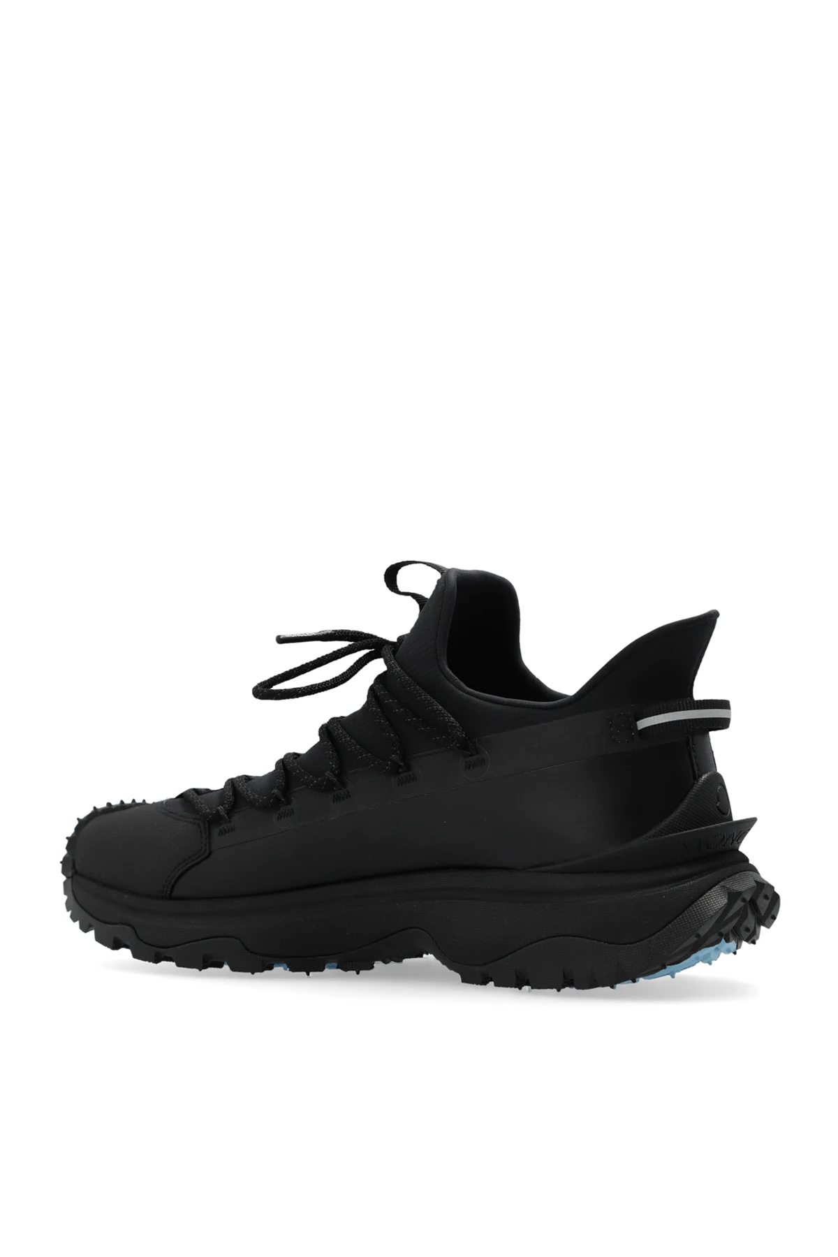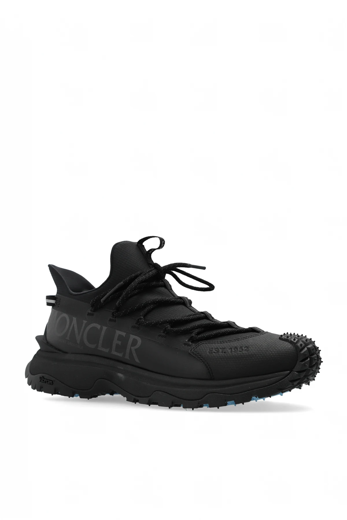 Czarne, sznurowane buty sportowe, model 'Trailgrip Lite2' Moncler. Wykonane z materiału typu ‘ripstop’ i gumy. Ozdobione logo na języku, z boku i z tyłu. Czarno-jasnoniebieska, gumowa podeszwa Vibram MEGAGRIP zwiększająca przyczepność i odporność na poślizg.