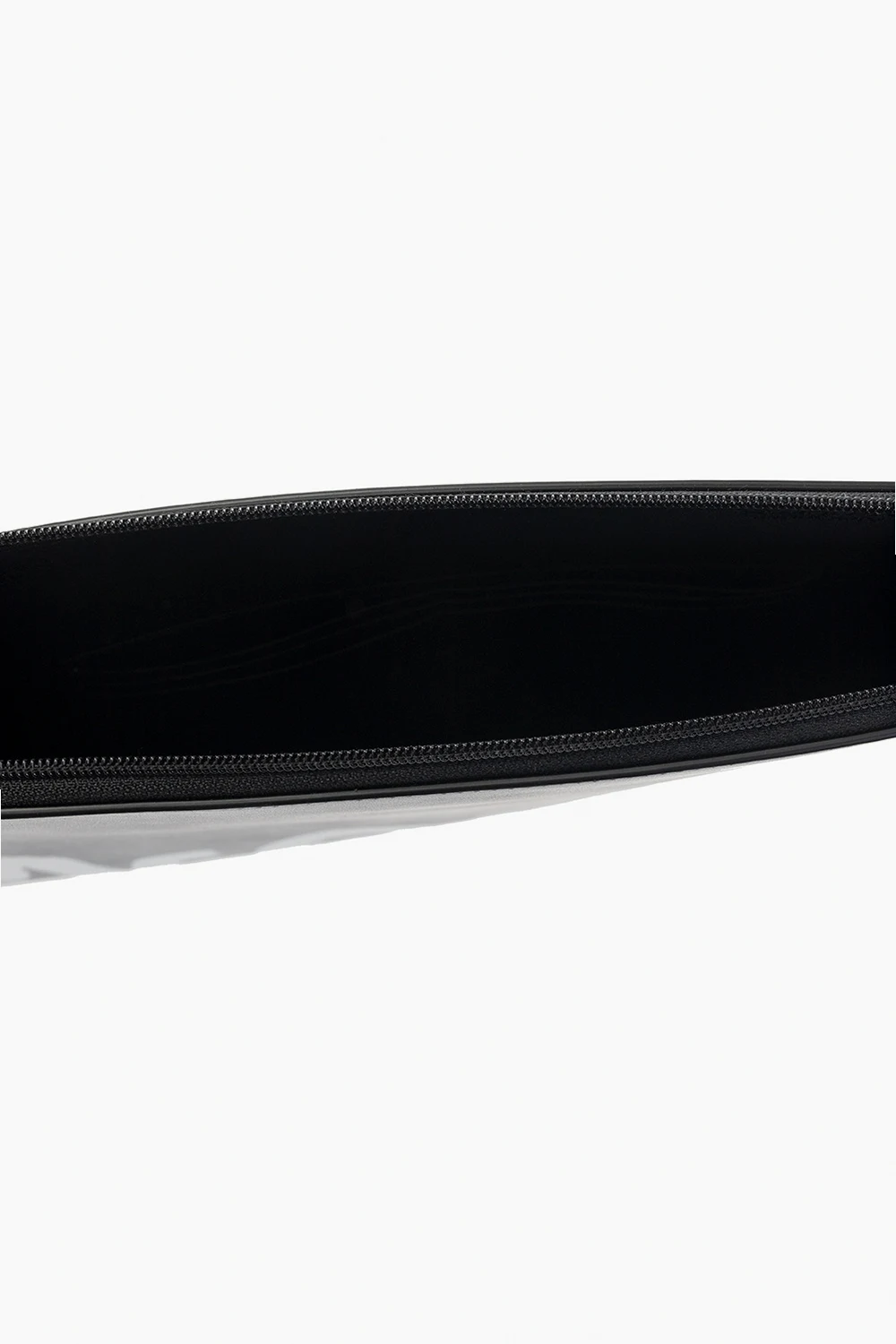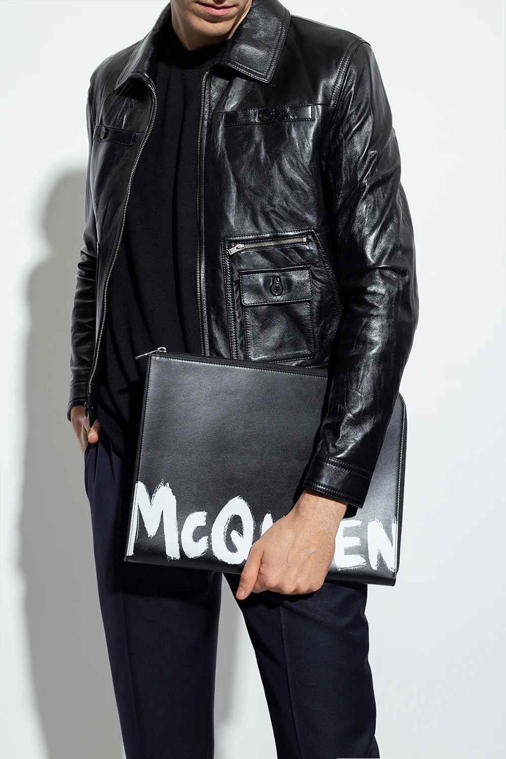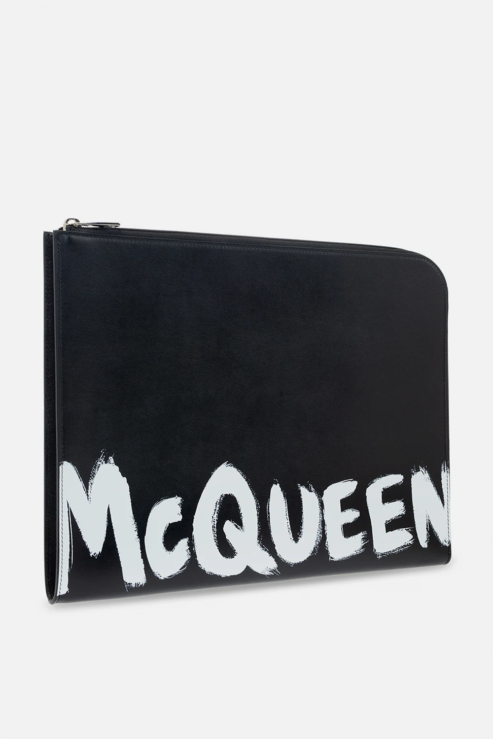 Czarne etui na dokumenty Alexander McQueen. Wykonane z cielęcej skóry. Zamykane na zamek. Z przodu nadrukowane logo w kolorze białym. Wewnątrz komora, wsuwana kieszeń i sześć miejsc na karty. Metalowe elementy w kolorze srebrnym.