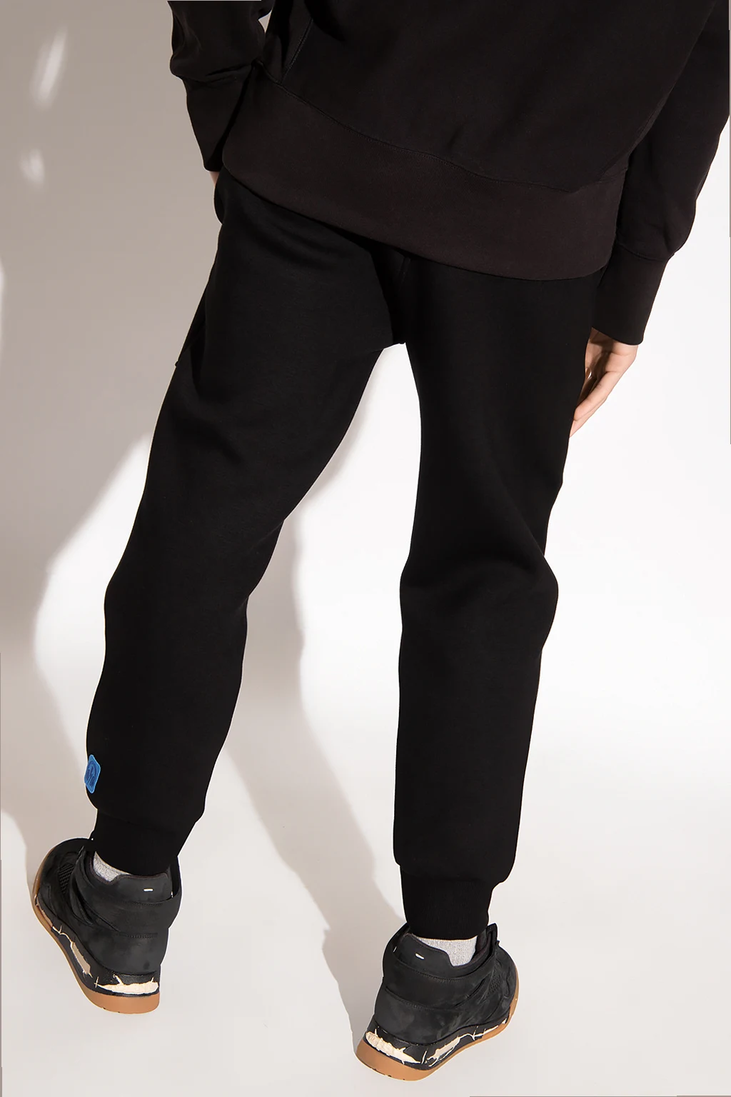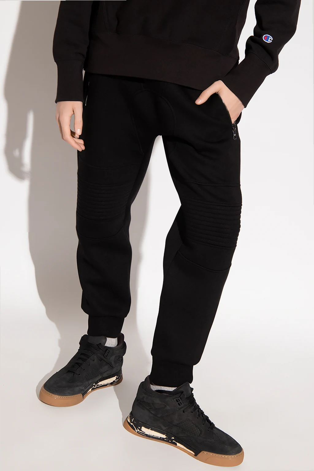 Czarne spodnie z przeszyciami Neil Barrett. W pasie ściągane trokami. Trzy kieszenie zapinane na zamek, jedna z tyłu. Nogawki zakończone ściągaczem.