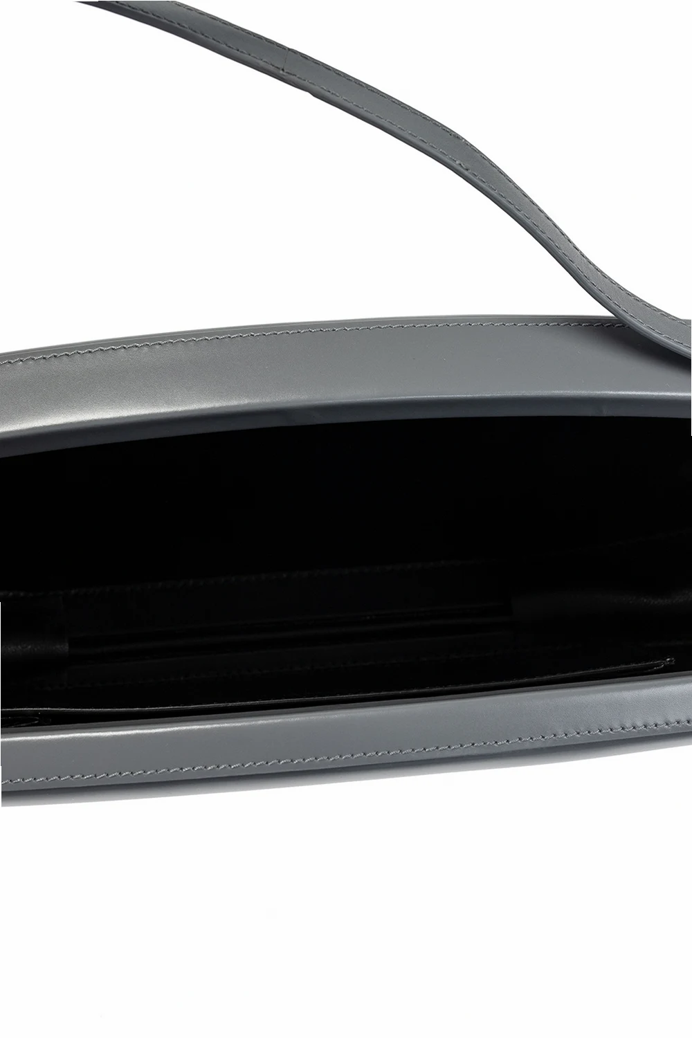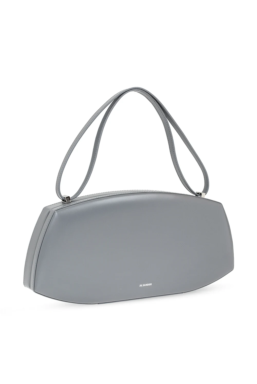 Szara torba do ręki Jil Sander. Wykonana ze skóry cielęcej. Zamykana na magnetyczne zapięcie. Ozdobiona wytłoczonym wzorem z logo w kolorze srebrnym. Pas do ręki. Wewnątrz komora oraz wsuwana kieszeń. Metalowe wykończenie w kolorze srebrnym.