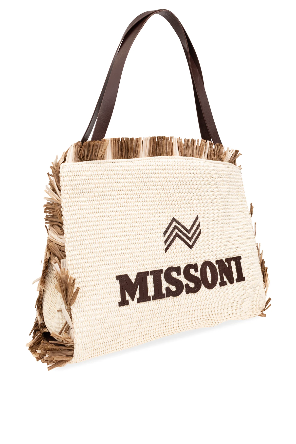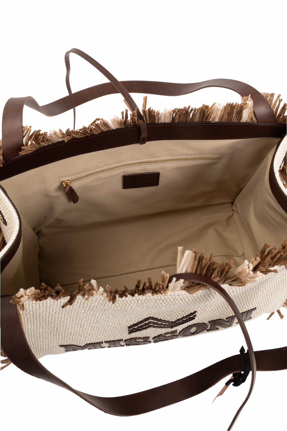 Na froncie torby dumnie prezentuje się logo Missoni , będące synonimem luksusu i prestiżu, umieszczone na naszywce w kontrastującym kolorze, co dodaje całości charakteru. Urok torby podkreślają frędzle otaczające jej boki i górną krawędź, wprowadzając element swobodnej elegancji.