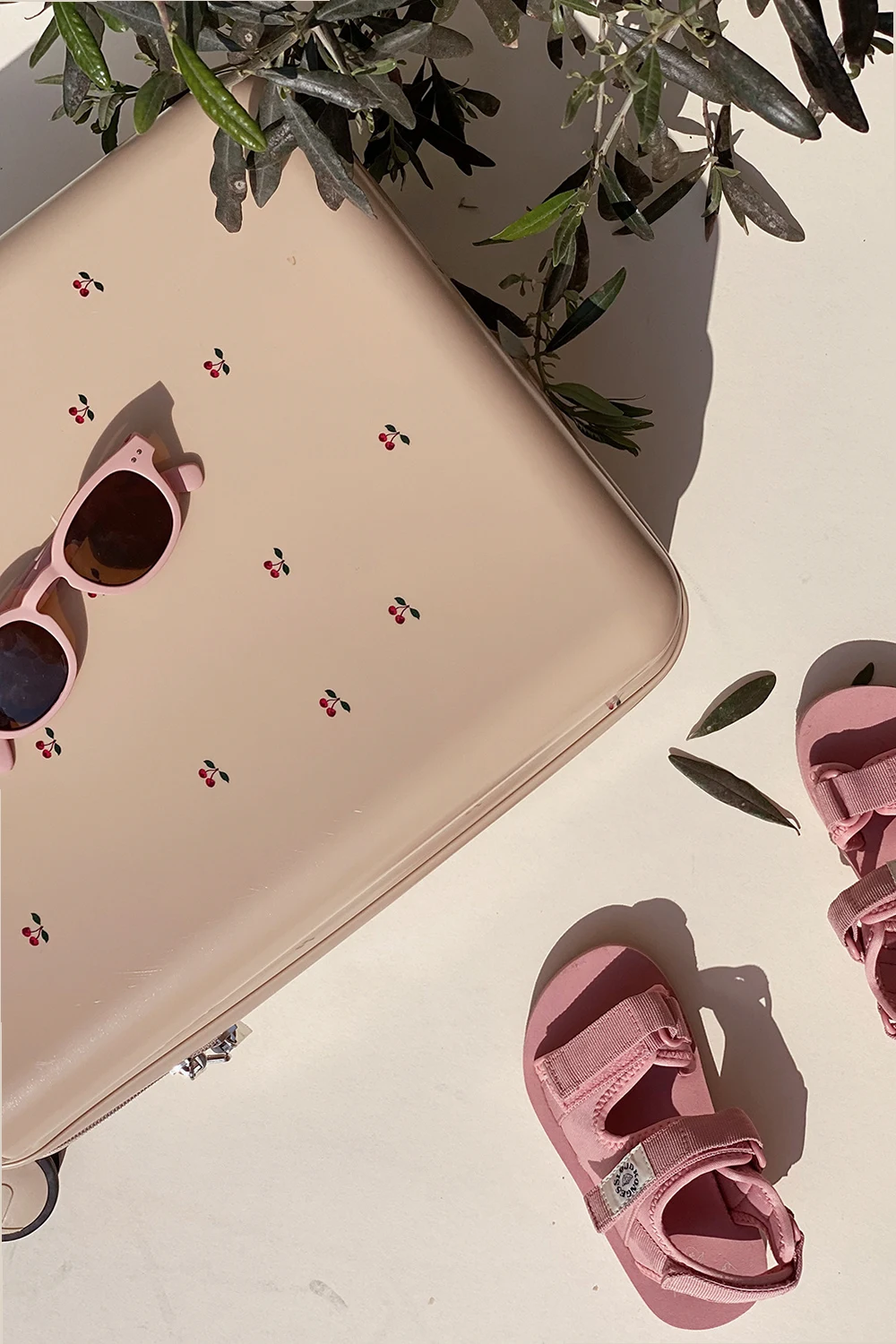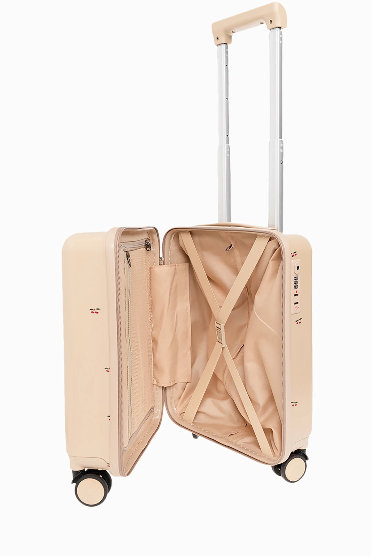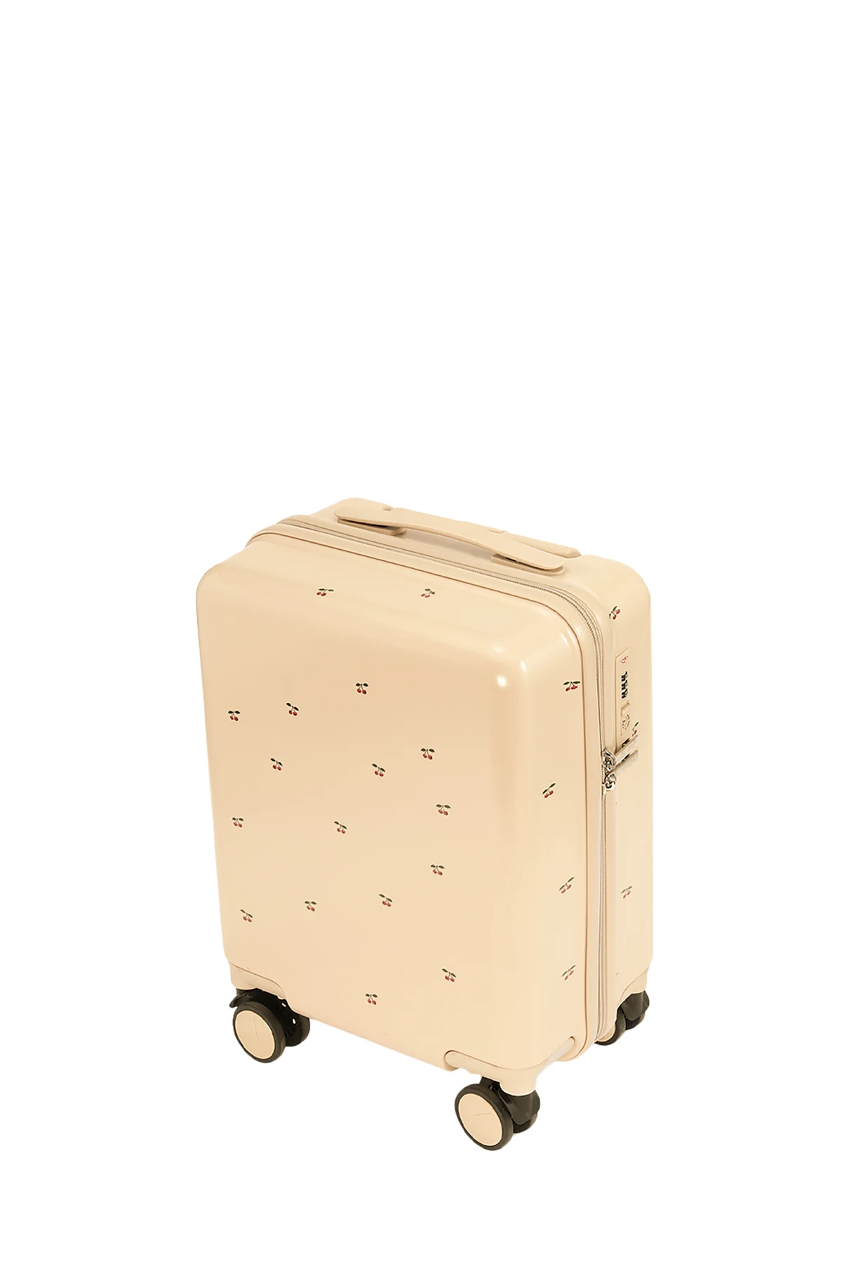 Beżowa walizka Konges Slojd. Zapinana na dwubiegunowy zamek. Ozdobiona wzorem z wiśniami. Posiada podwójne koła obrotowe o 360 stopni i zatwierdzonej wbudowaną blokadę ‘TSA LOCK®’. Półokrągły uchwyt oraz regulowana, aluminiowa, 4-stopniowa rączka teleskopowa. Wewnątrz dwie komory oraz kieszeń siateczkowa zamykana na zamek. Metalowe wykończenie w kolorze beżowym.