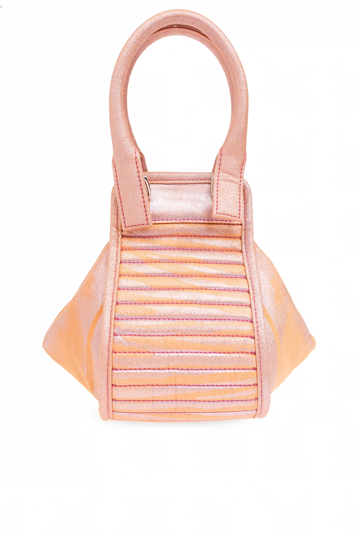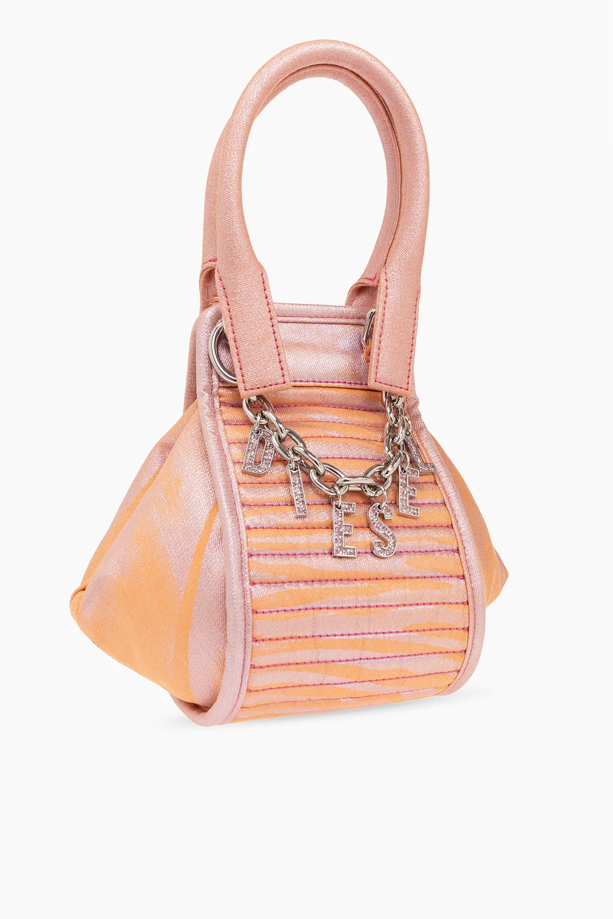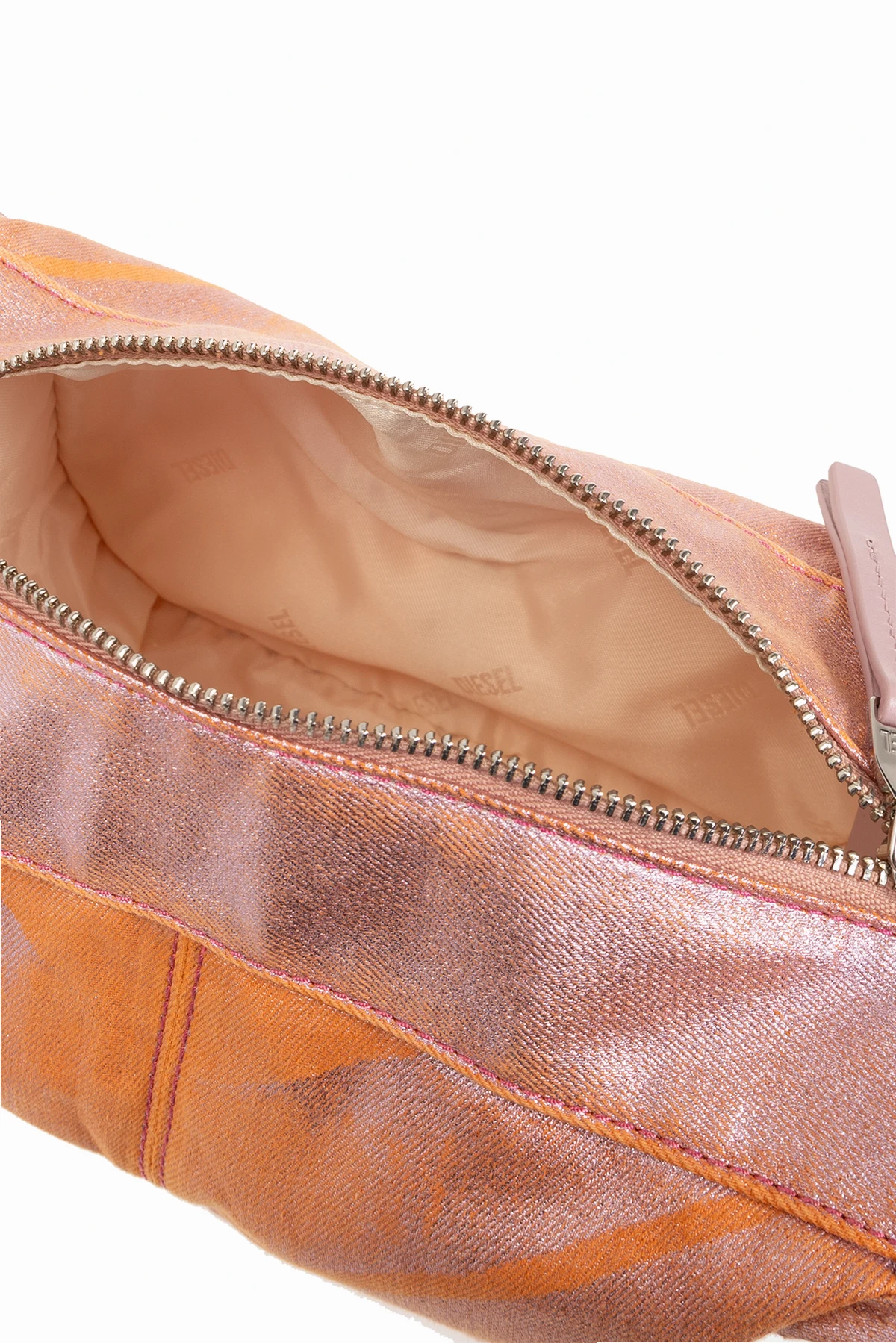 Różowo-pomarańczowa, jeansowa torba na ramię ‘D-VINA-XS’ Diesel. Zamykana na zatrzaski i zamek. Ozdobiona przetarciami, przebarwieniami i pikowaniem nadającymi efekt ‘vintage’. Częściowo pokryta połyskującą powłoką. Z przodu łańcuch z logo wysadzany połyskującymi kryształami. Dwie półokrągłe rączki oraz odpinany pas na ramię. Wewnątrz komora. Metalowe wykończenie w kolorze srebrnym.