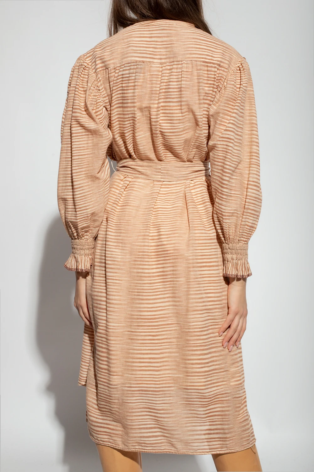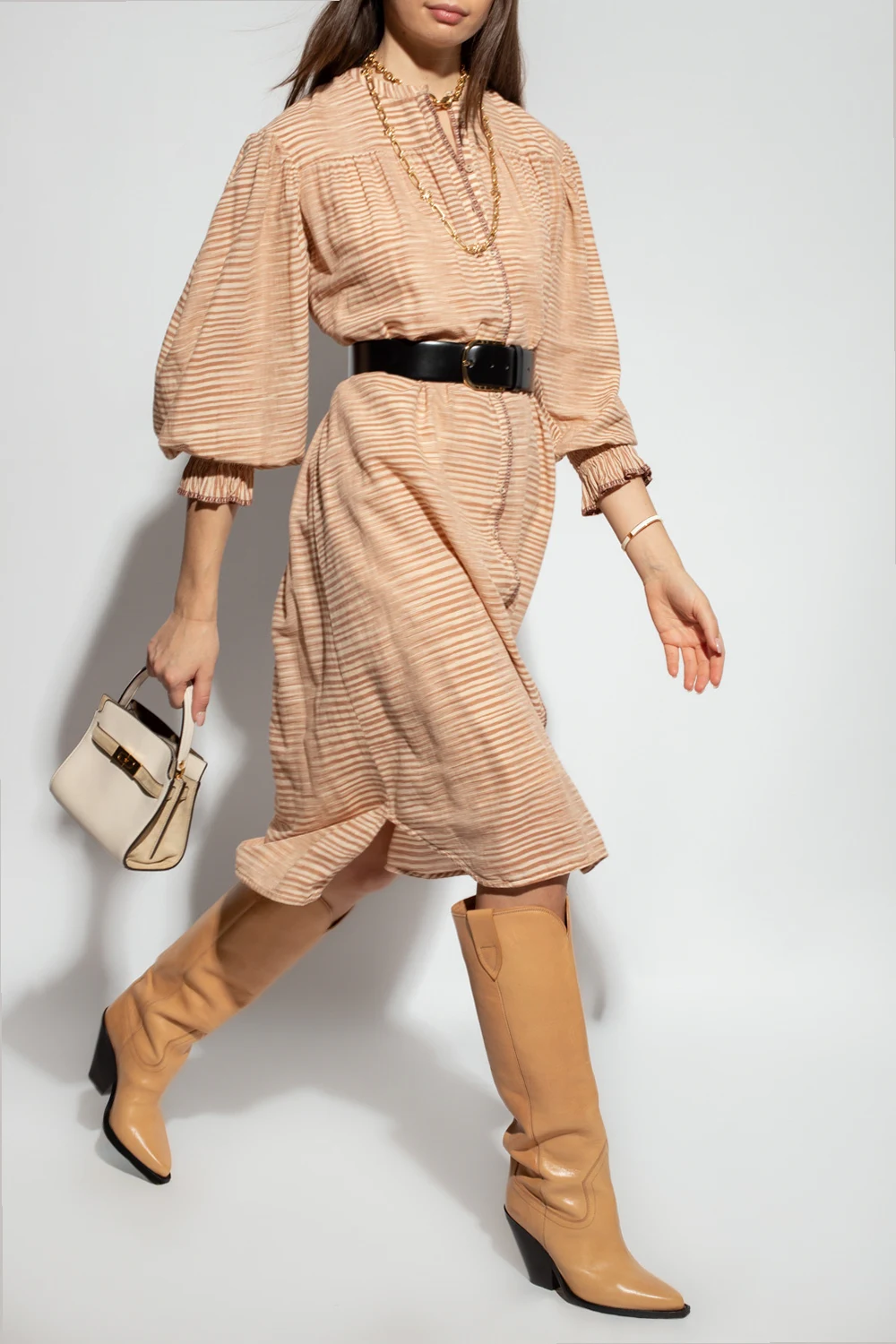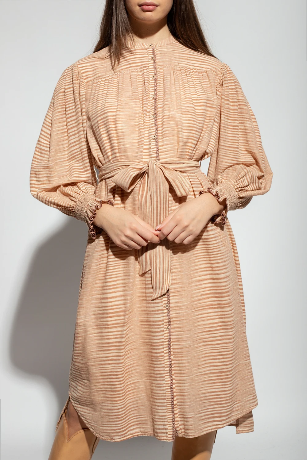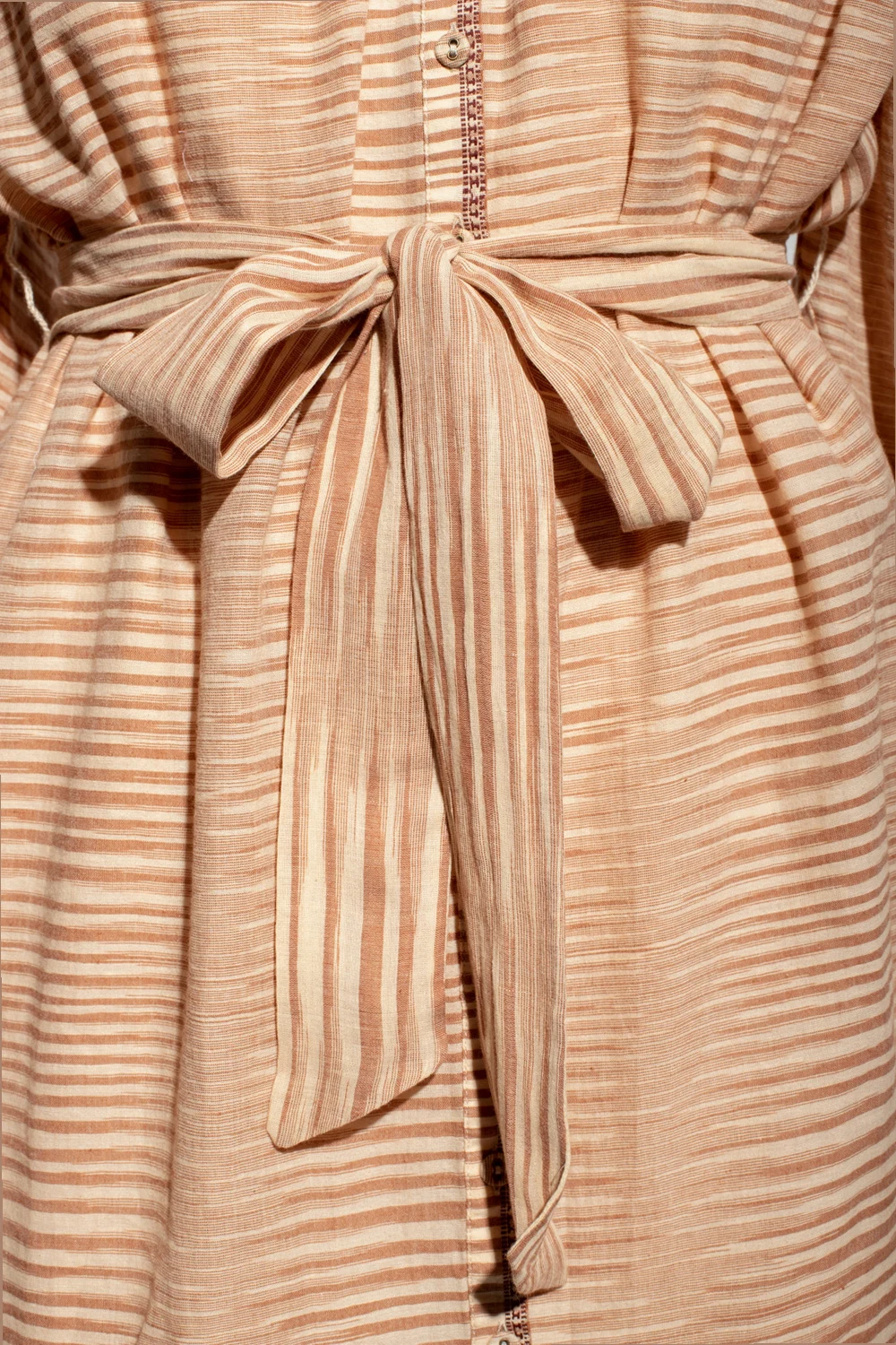 Beżowo-jasnobrązowa sukienka, model ‘Fiora’ Ulla Johnson. Wykonana z bawełny. Ozdobiona wzorem w pasy. Zapinana na guziki i wiązana pasem. Z przodu dekoracyjne marszczenia. Długie, bufiaste rękawy ze ściągaczem wykończonym dekoracyjnym haftem.