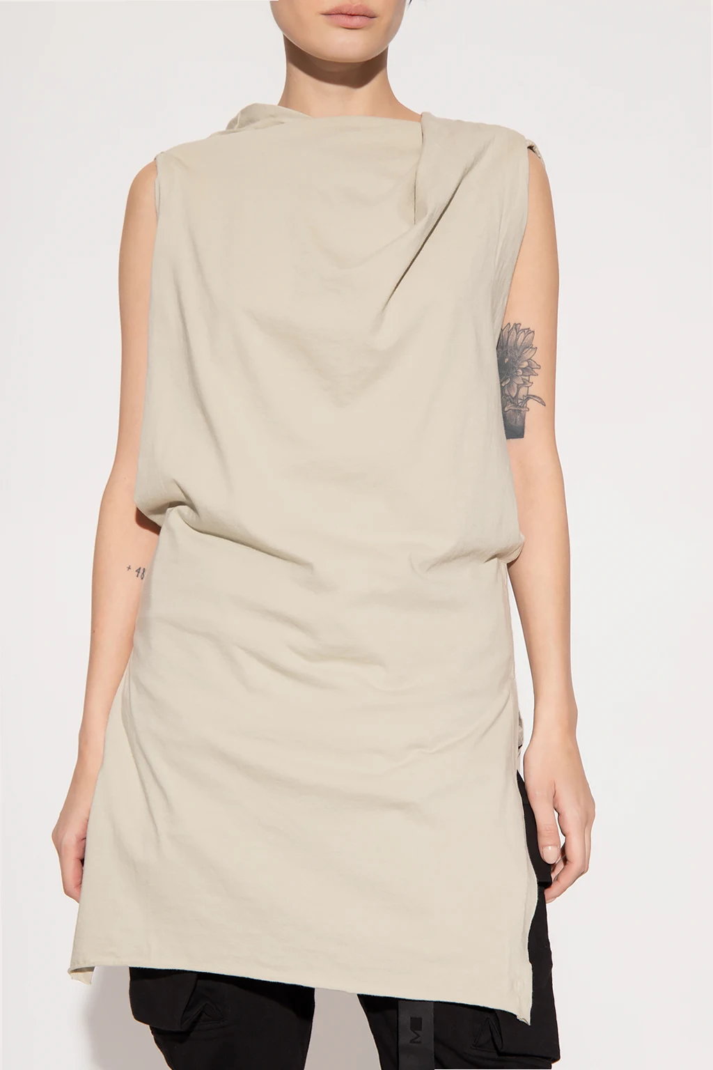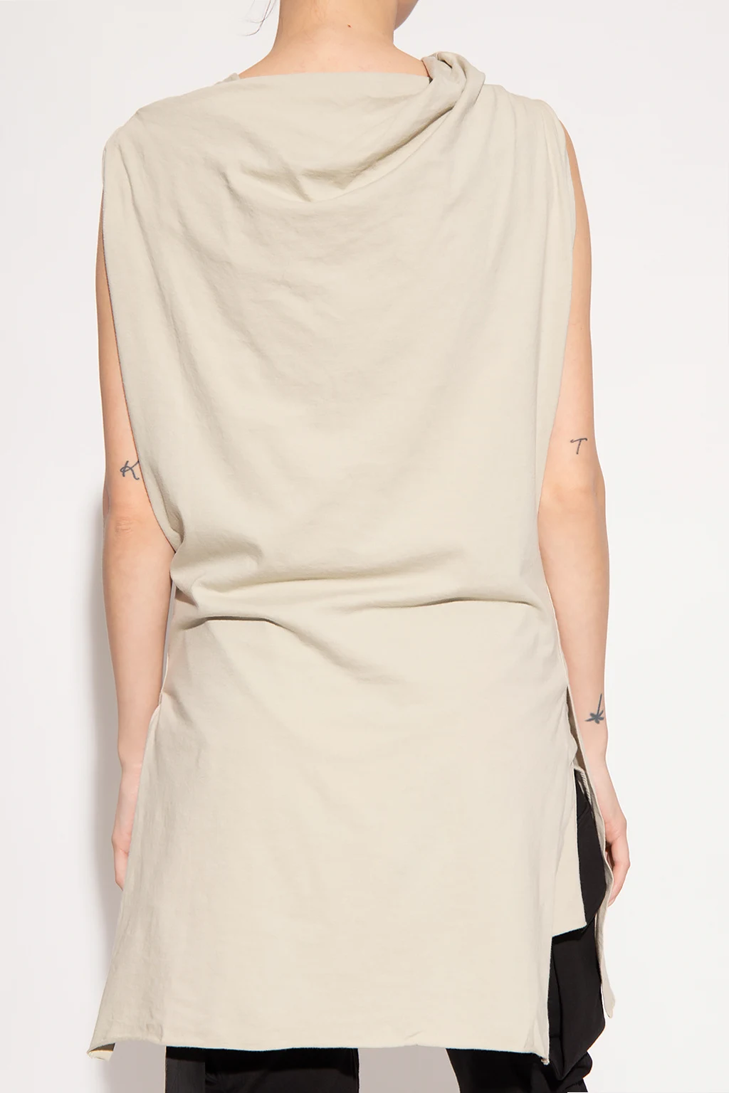 Beżowa sukienka bez rękawów Rick Owens DRKSHDW. Wykonana z bawełny. Dekoracyjne drapowanie. Na dole podwójne rozcięcie. Dekoracyjna aplikacja z logo w kolorze czarnym.