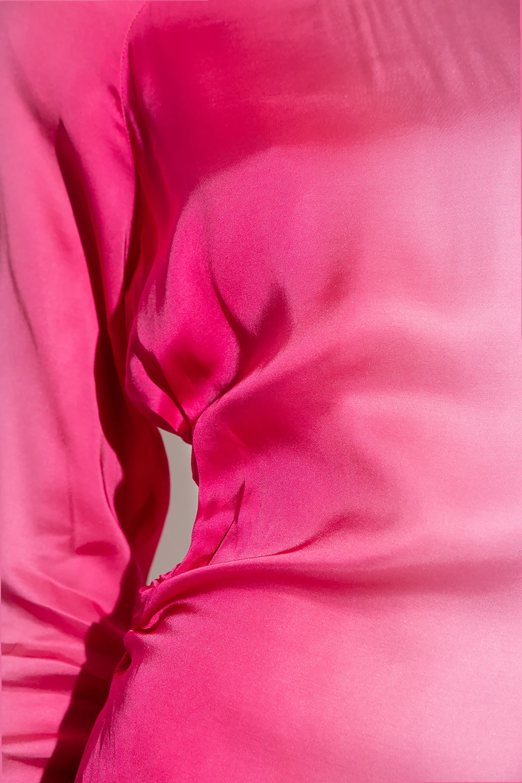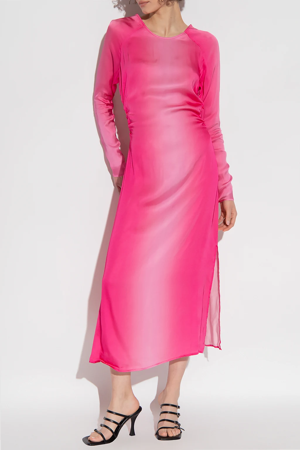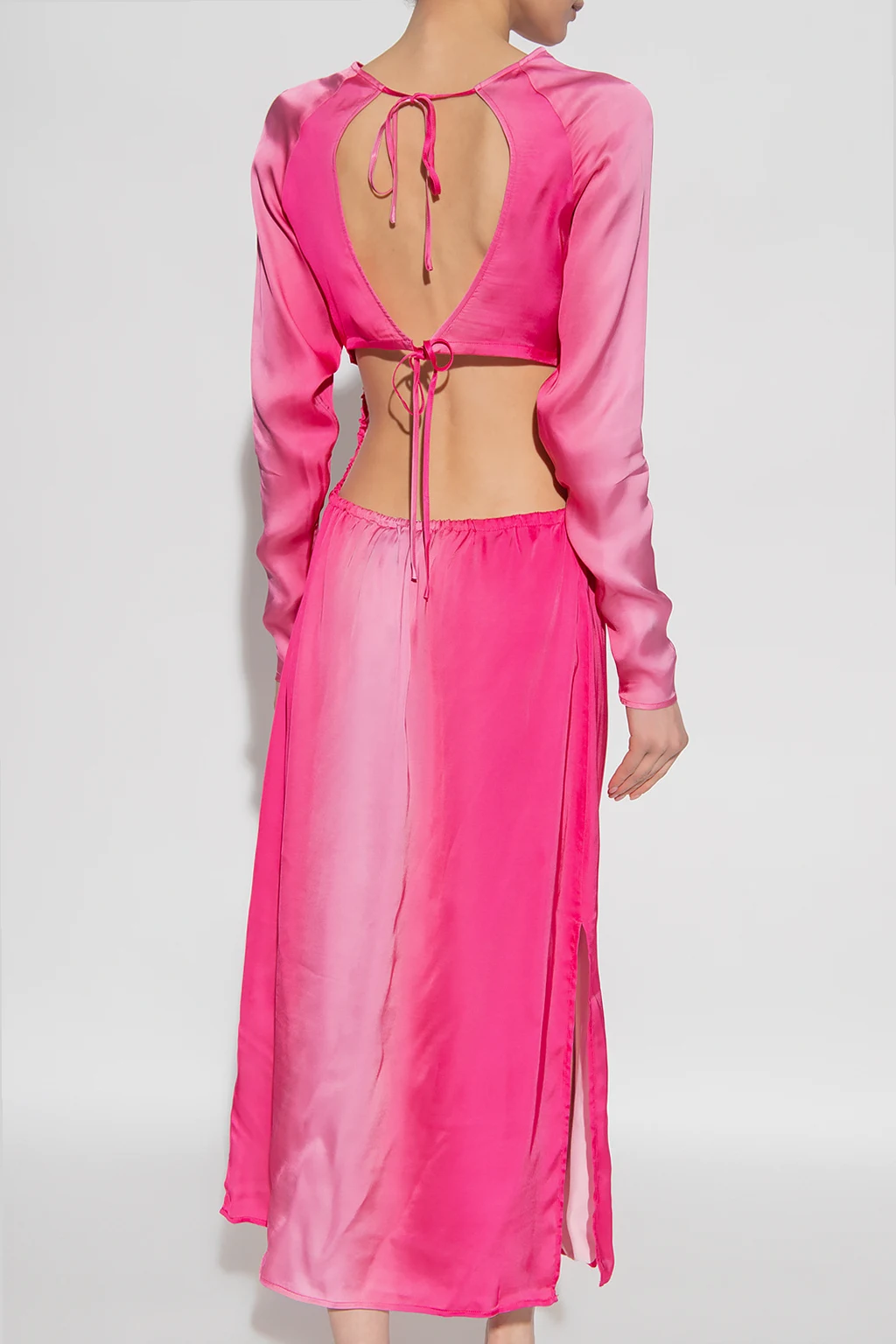Różowa sukienka, model ‘Ava’ Birgitte Herskind. Wiązana z tyłu trokami. Okrągły dekolt. Długie rękawy z wszytym zamkiem. Odkryte plecy. Po bokach rozcięcie.