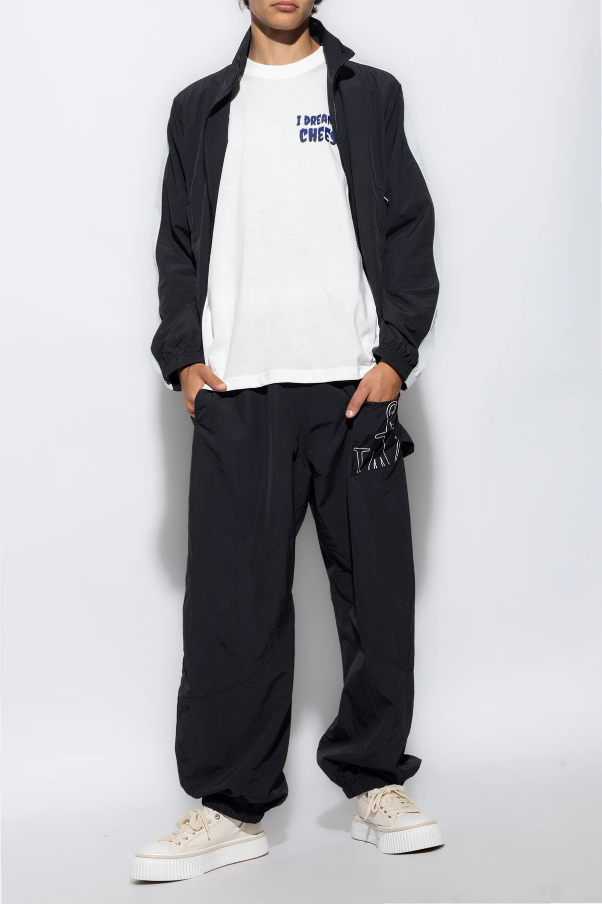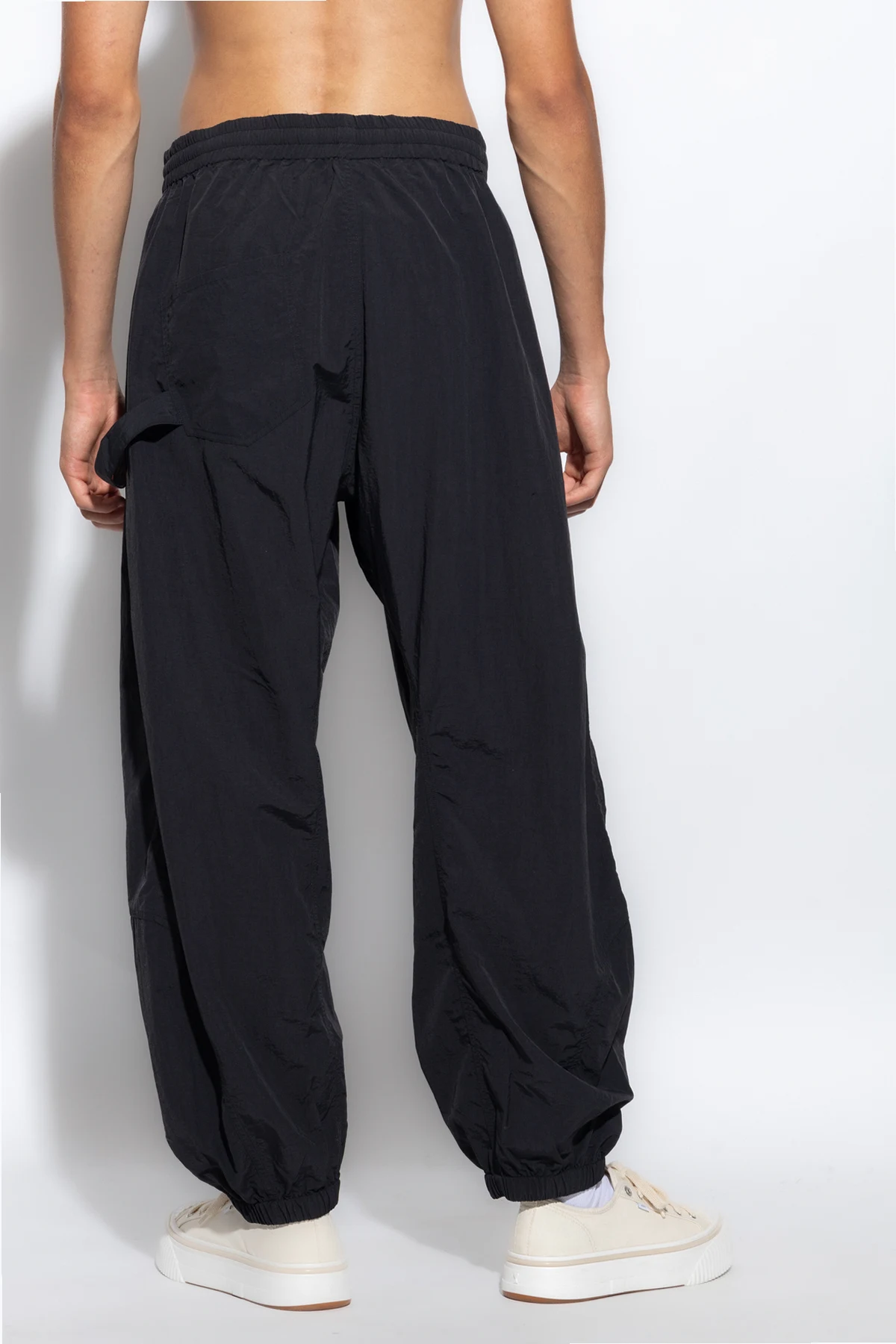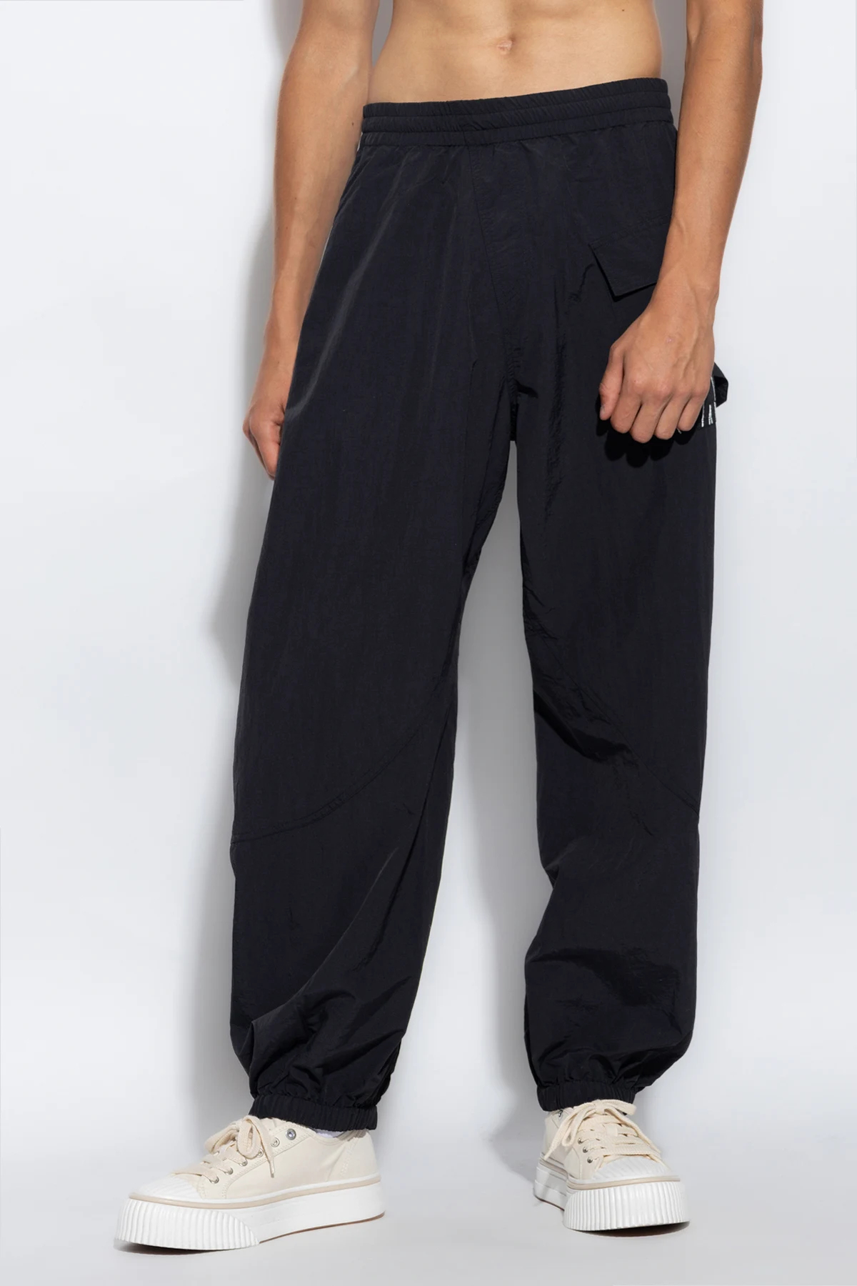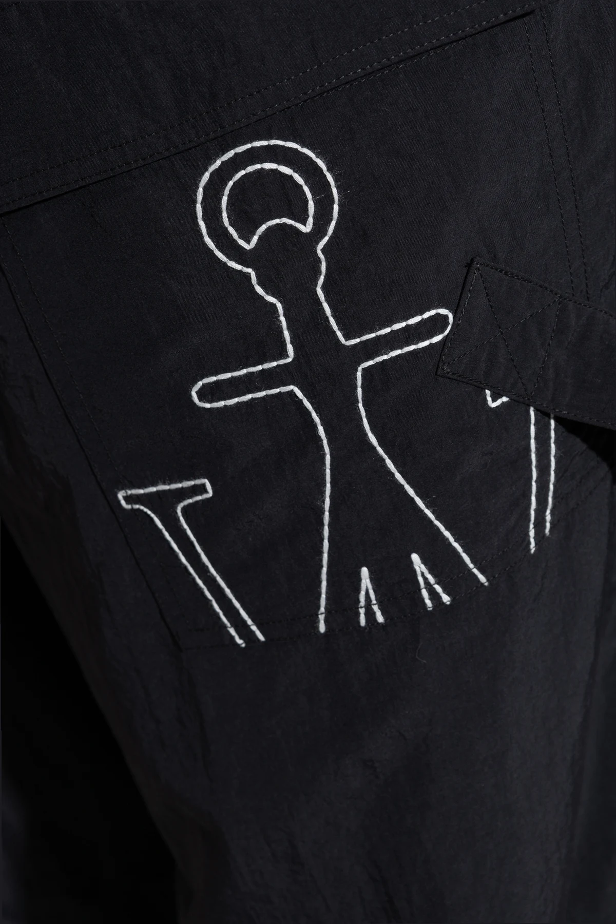 Czarne spodnie ortalionowe o luźnym kroju JW Anderson. W pasie wszyta guma ściągana trokami. Z przodu asymetrycznie naszyta kieszeń z patką ozdobiona wyszytym białą nicią logo. Dwie kieszenie wsuwane. Długie nogawki zakończone ściągaczem.