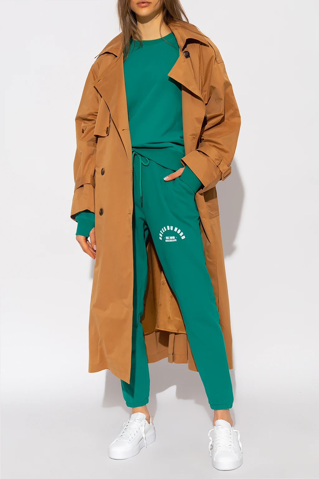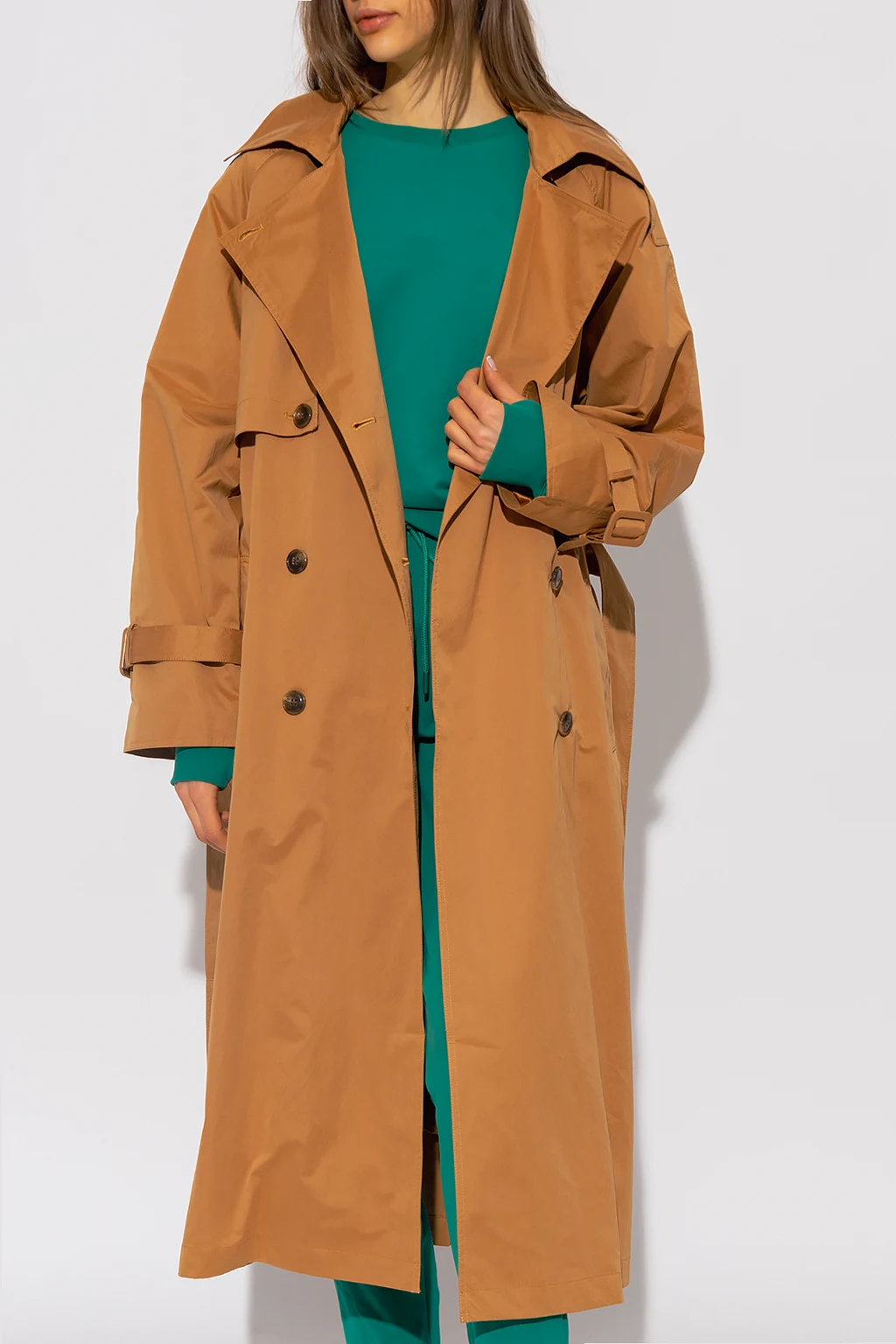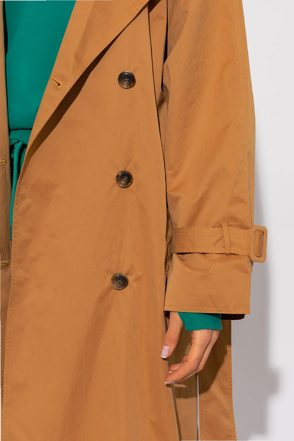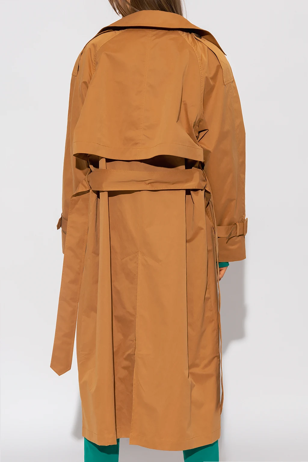 Brązowy, dwurzędowy trencz, model ‘Totem’ Notes Du Nord. Zapinany na guziki oraz wiązany pasem w talii. Naramienniki zapinane na guziki. Dwie wsuwane kieszenie. Długie rękawy z paskami z klamrą. Z tyłu wysokie wycięcie z zapięciem na guzik.