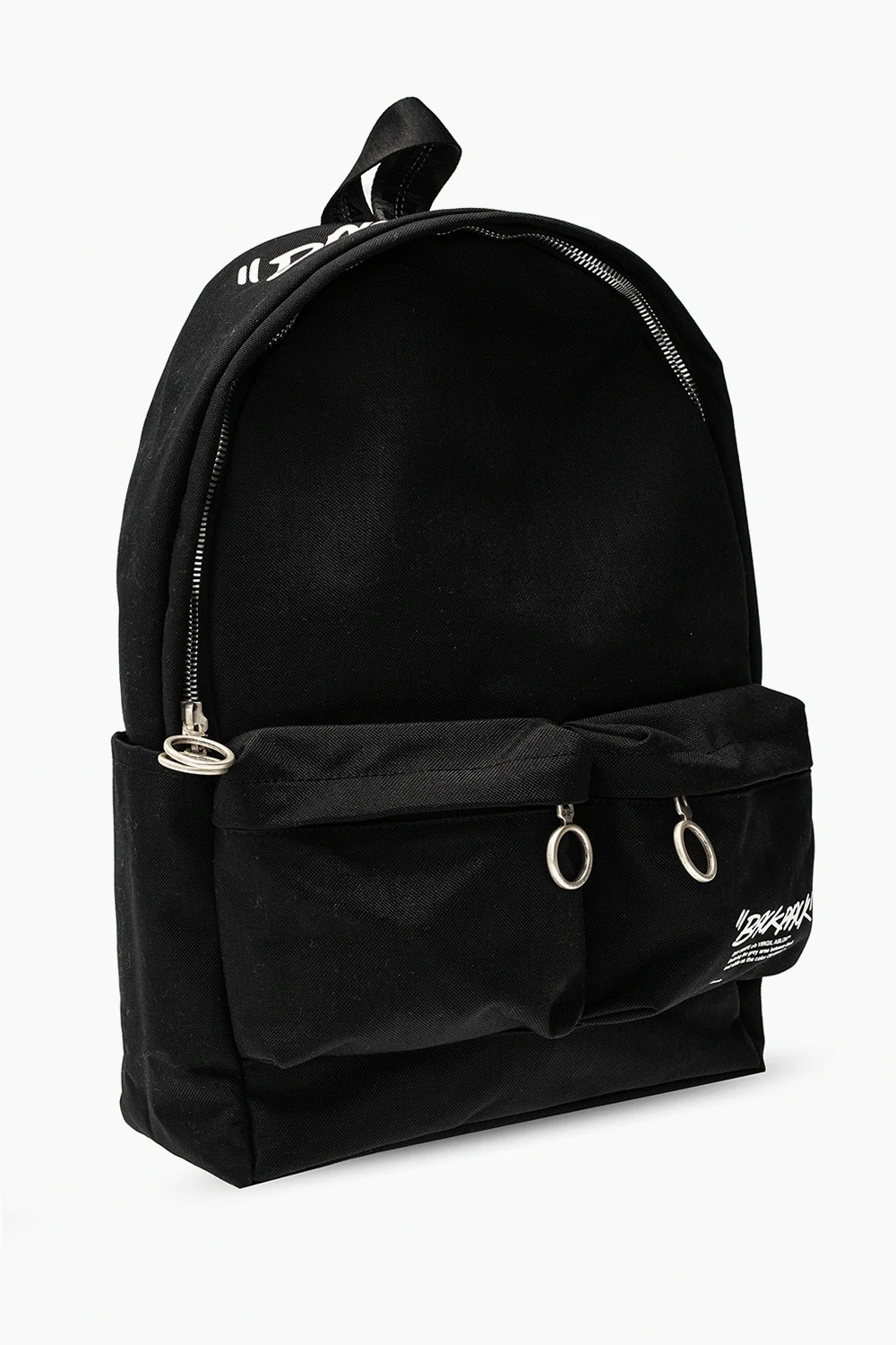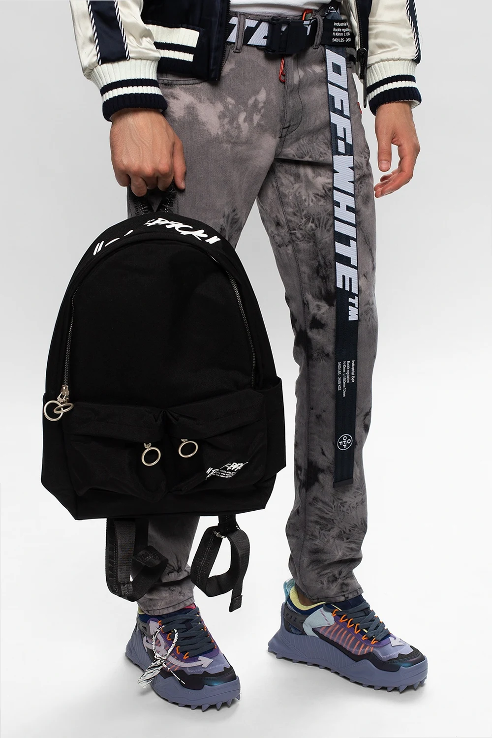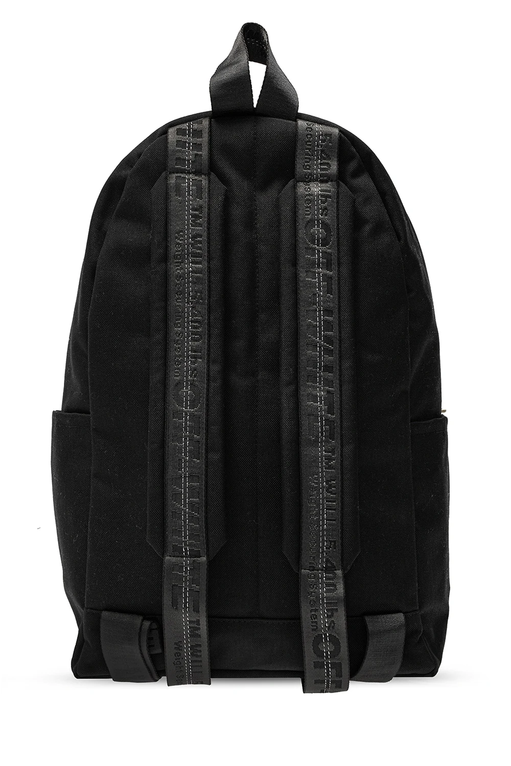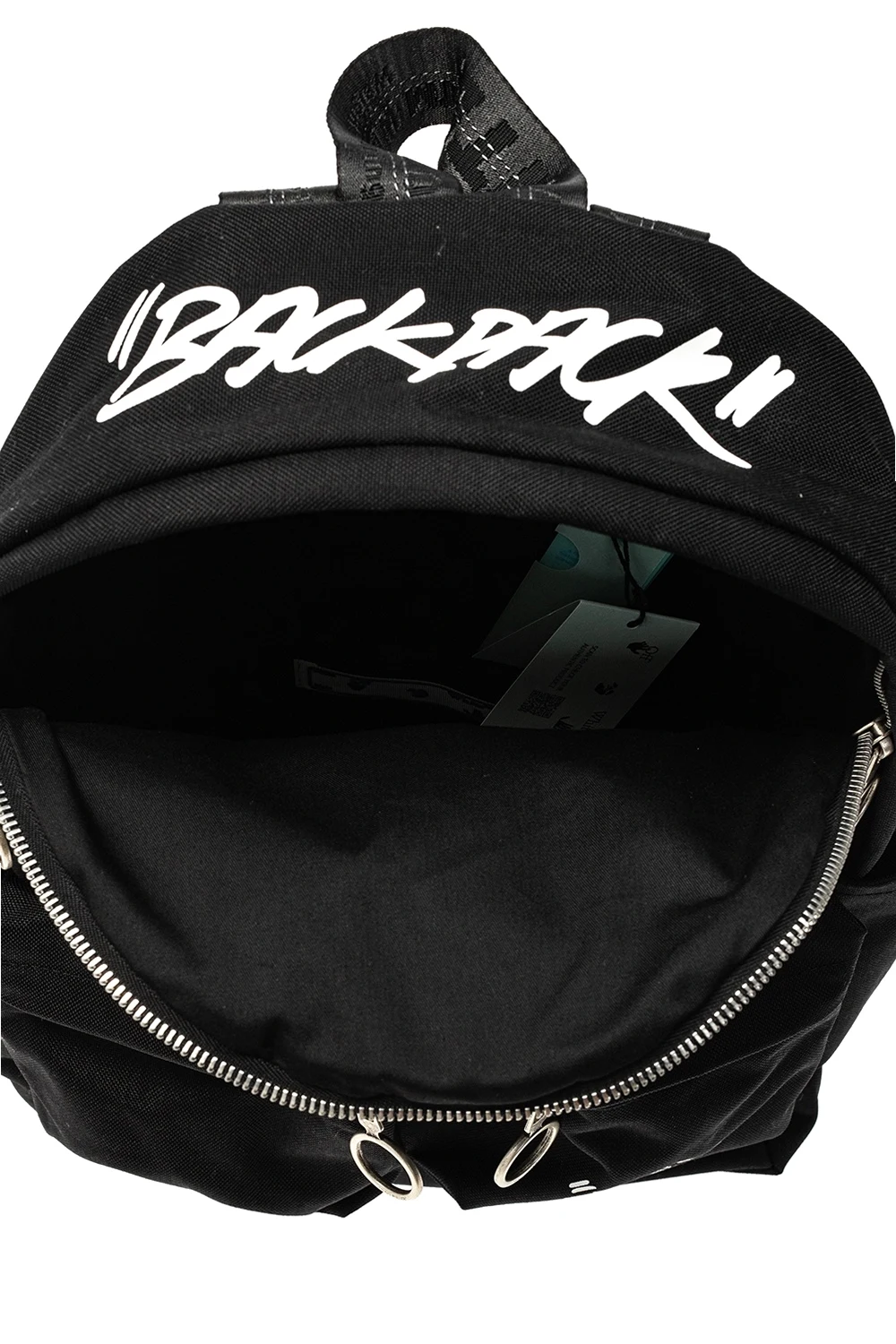 Czarny plecak Off-White. Zapinany na dwubiegunowy zamek. Ozdobiony nadrukowanym wzorem z logo w kolorze białym. Z przodu dwie kieszenie zapinane na zamki. Półokrągła rączka. Szelki z wyszytym logo z możliwością regulacji długości. Wewnątrz komora oraz kieszeń zapinana na rzep. Metalowe wykończenie w kolorze postarzanego srebra.