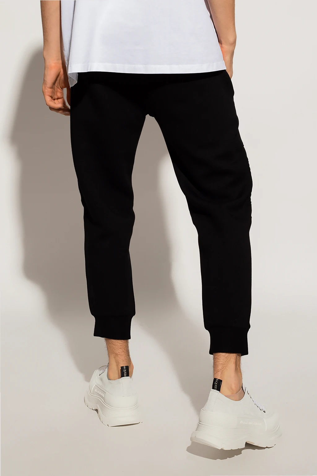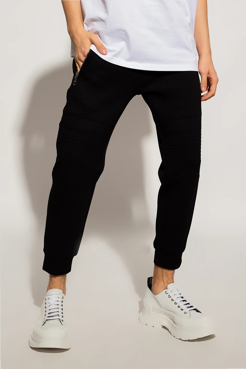 Czarne spodnie dresowe Neil Barrett. W pasie wszyta guma ściągana trokami. Ozdobne przeszycia i prążkowania. Trzy kieszenie zapinane na zamek: dwie z przodu i jedna z tyłu. Długie nogawki zakończone ściągaczem, na jednej nadrukowane logo w kolorze czarnym.