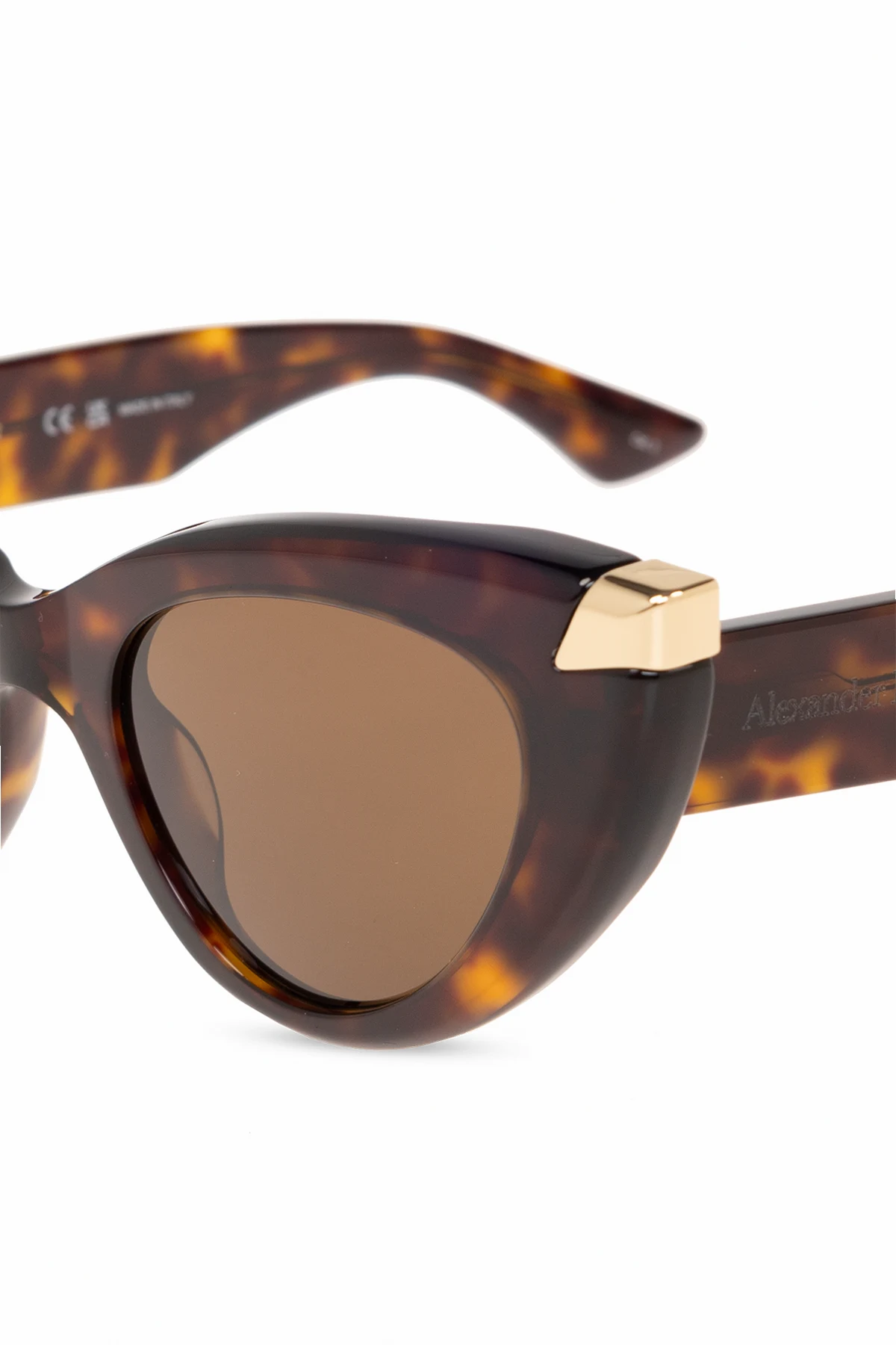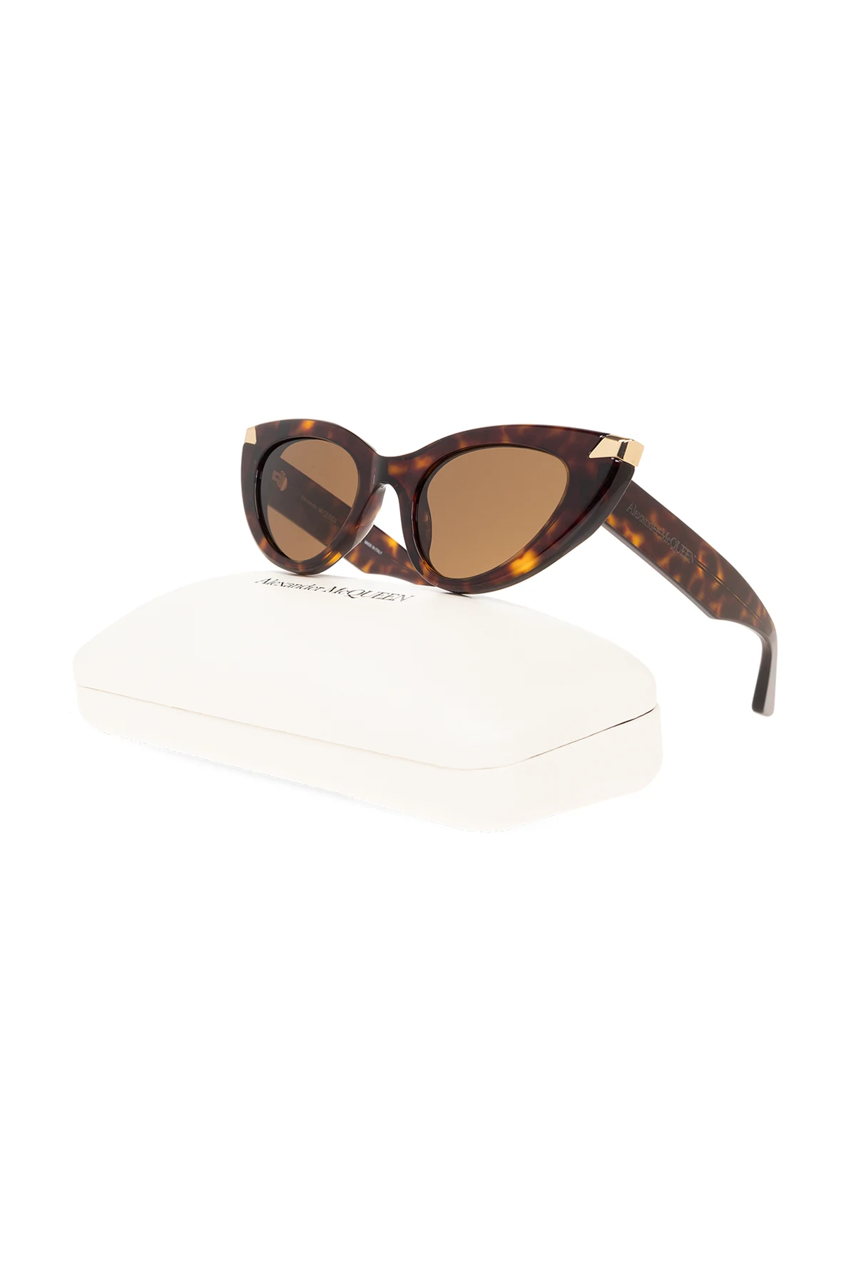 Ciemnobrązowe szylkretowe okulary przeciwsłoneczne Alexander McQueen. Oprawki w kształcie kociego oka. Zauszniki ozdobione wygrawerowanym logo. Metalowe detale w kolorze złotym. Brązowe soczewki z ochroną przed promieniowaniem UV (kat. 3). Dołączone etui.
