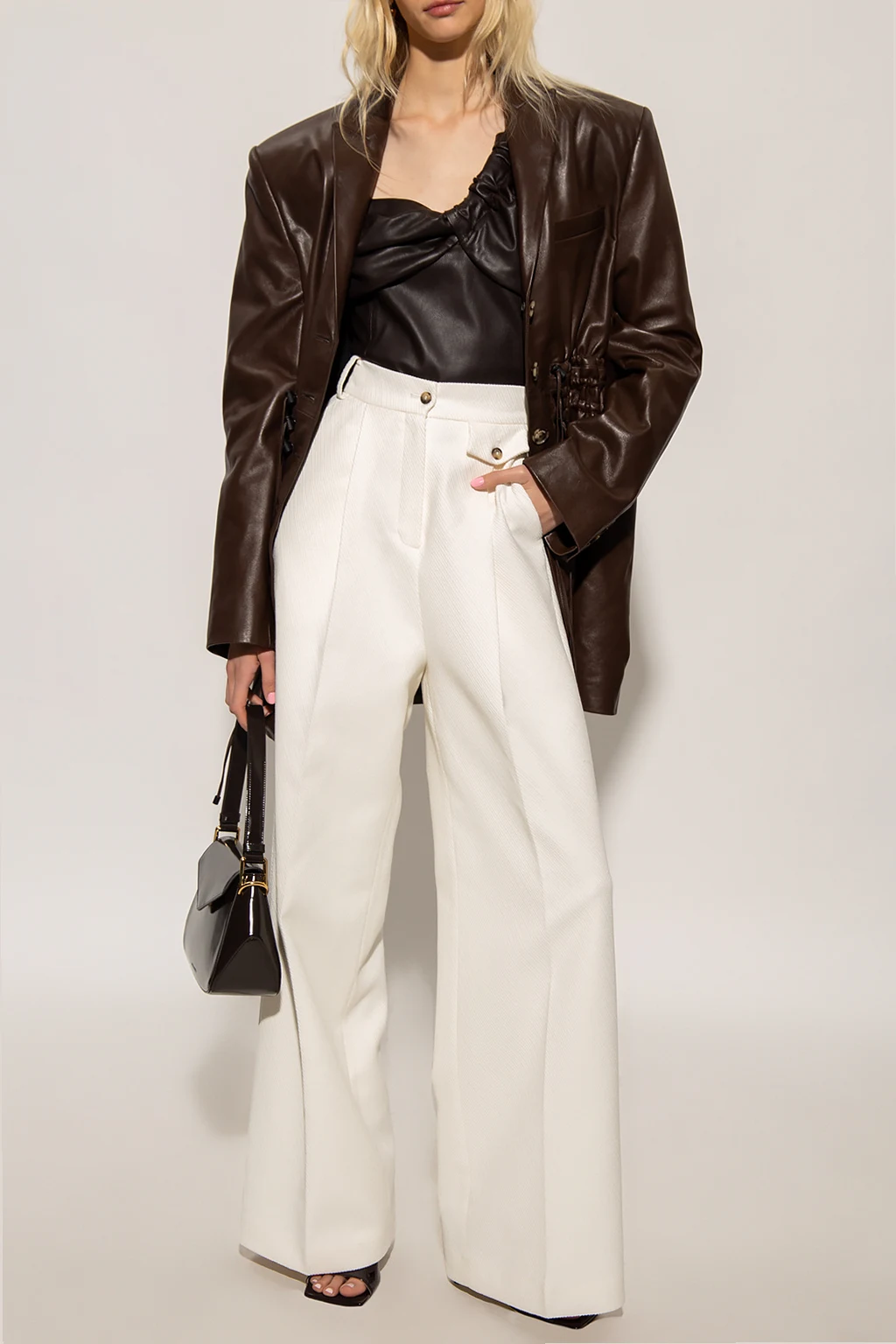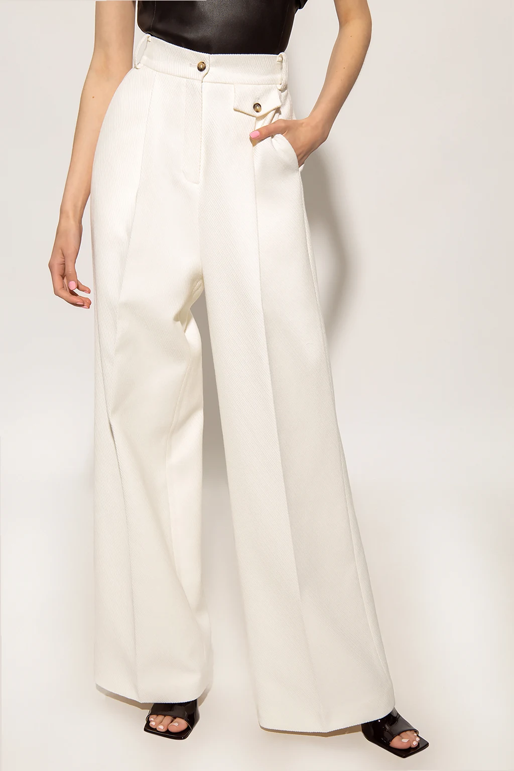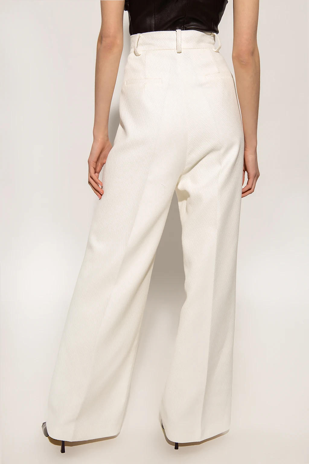 Białe spodnie z wysokim stanem, model ‘Jafr’ The Mannei. Wykonane z mieszanki bawełny o specjalnej fakturze. Zapinane na guzik oraz zamek. Z przodu ozdobione patką z guzikiem. Cztery wsuwane kieszenie. Długie, szerokie nogawki w kant.