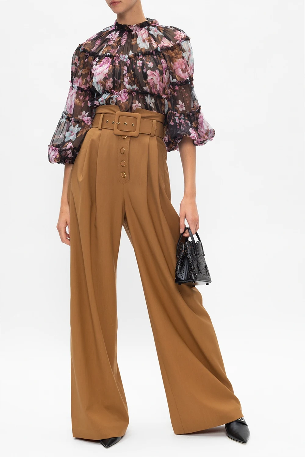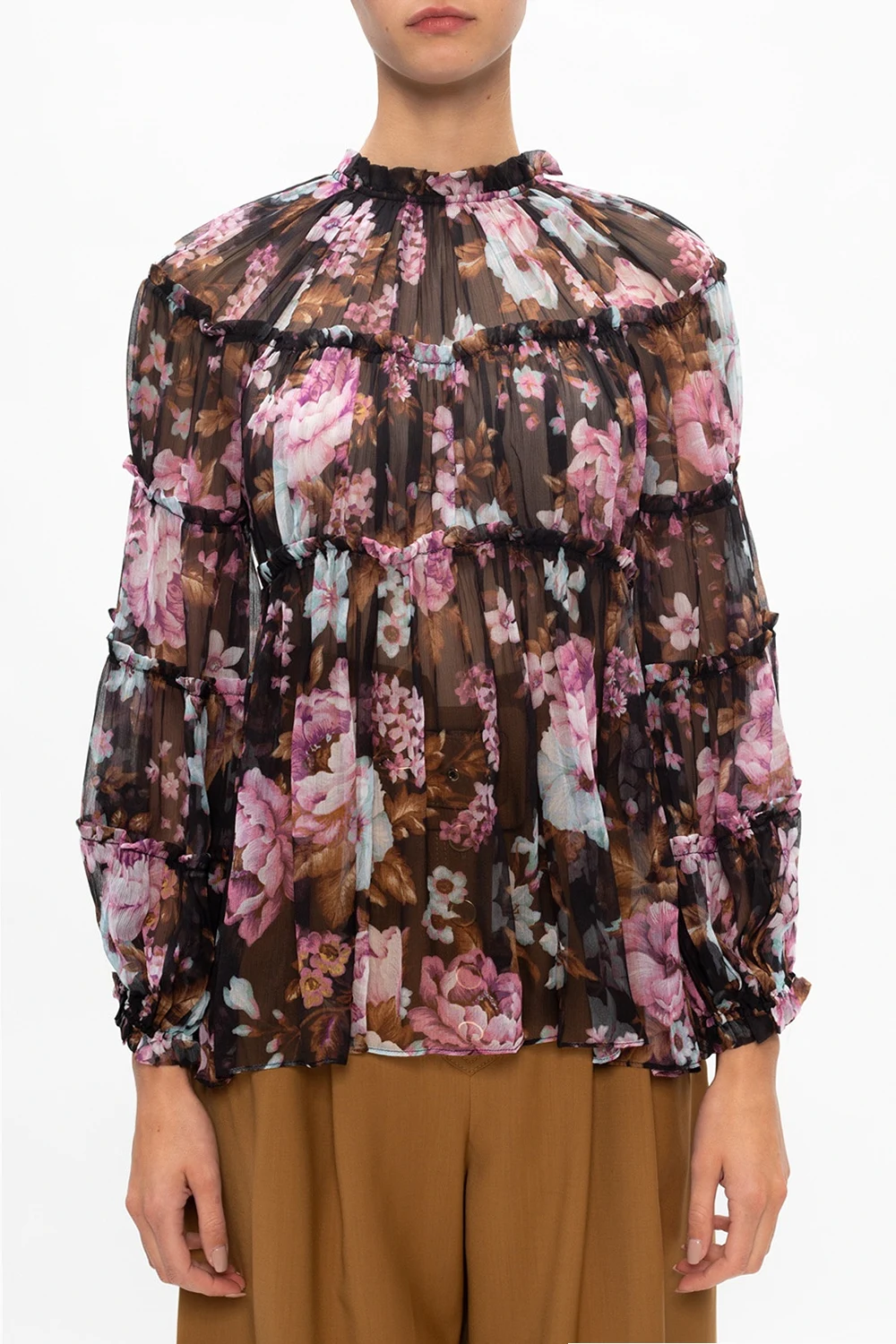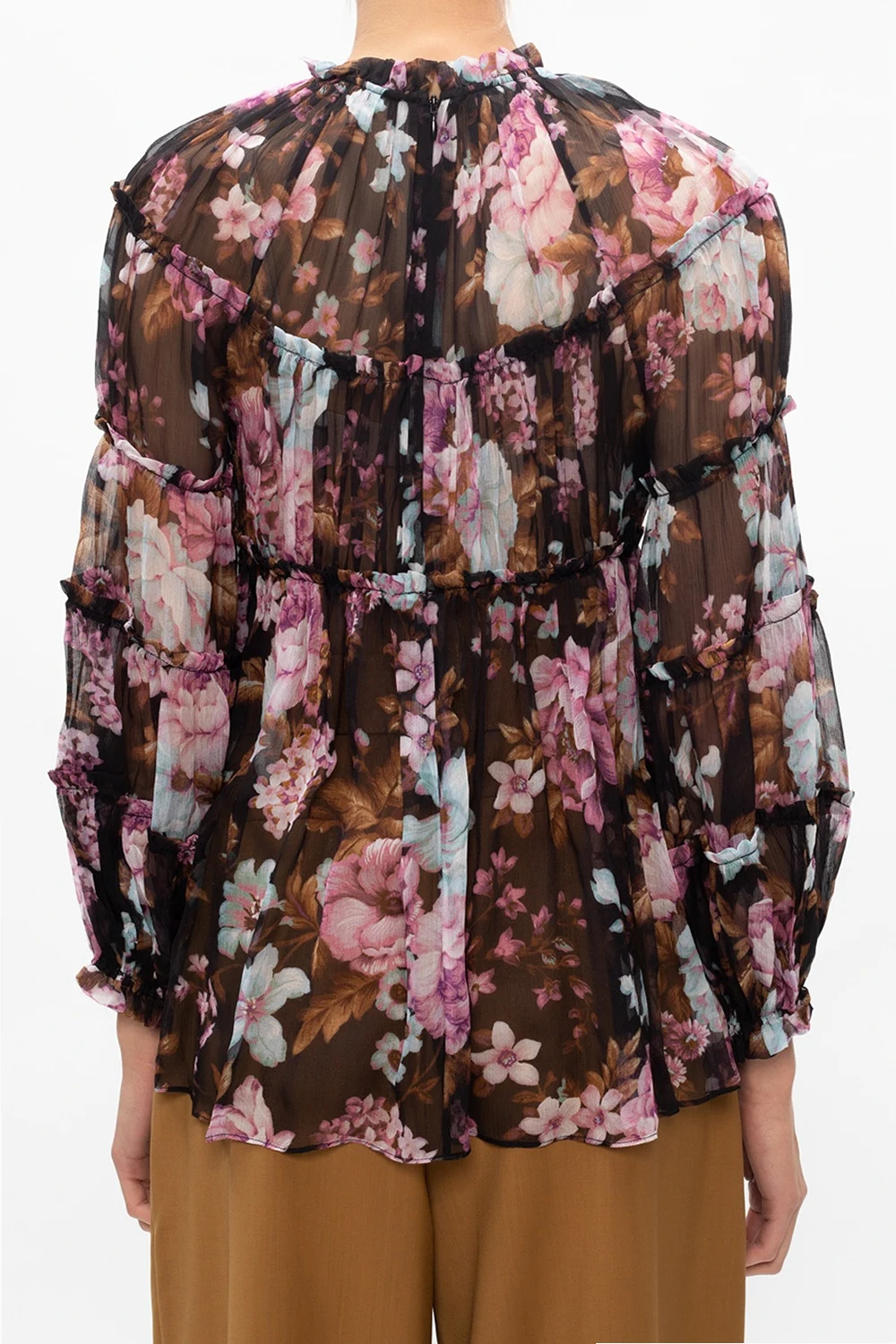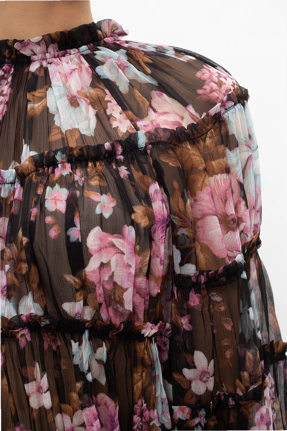 Czarny, jedwabny top Zimmermann. Zapinany z tyłu na zamek. Ozdobiony kolorowym nadrukiem z motywem kwiatowym. Długie rękawy.