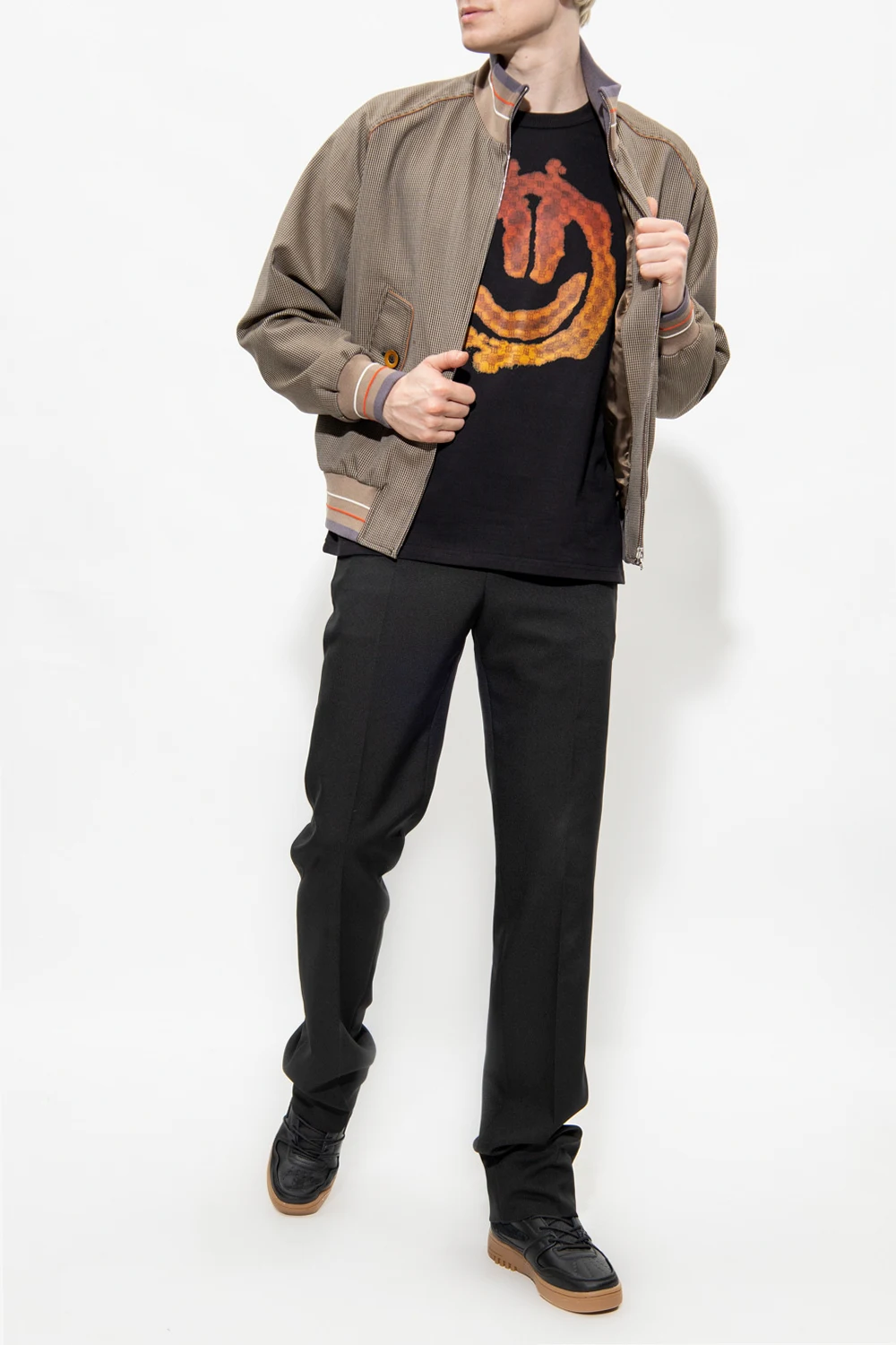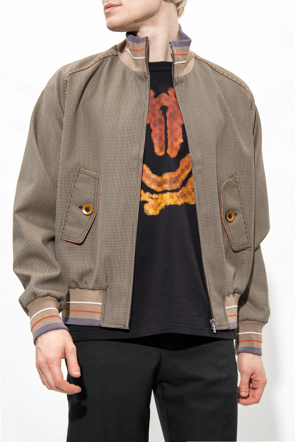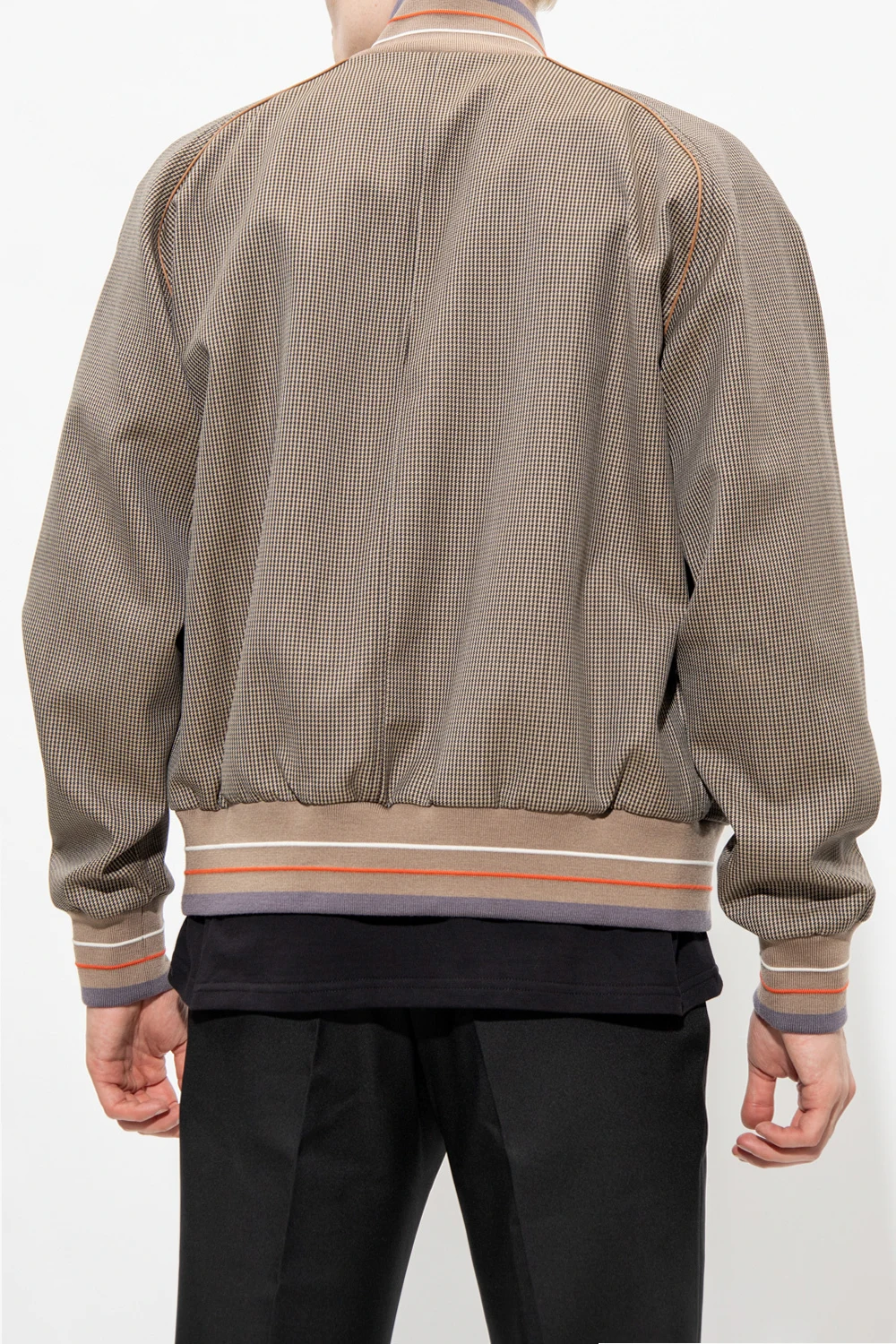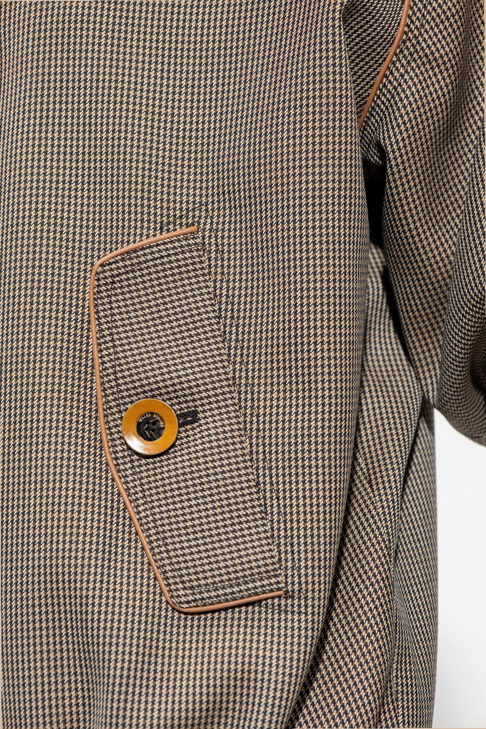 Beżowo-czarna, kurtka ze stójką, model ‘Wisdom’ Wales Bonner. Wykonana z wełny dziewiczej z certyfikatem GOTS. Zapinana na zamek. Ozdobiona wzorem w pepitkę. Z przodu dwie kieszenie z patką zapinaną na guzik. Kołnierz, długie rękawy i dół kurtki zakończone beżowo-szarym ściągaczem z biało-czerwonym wzorem w prążki.