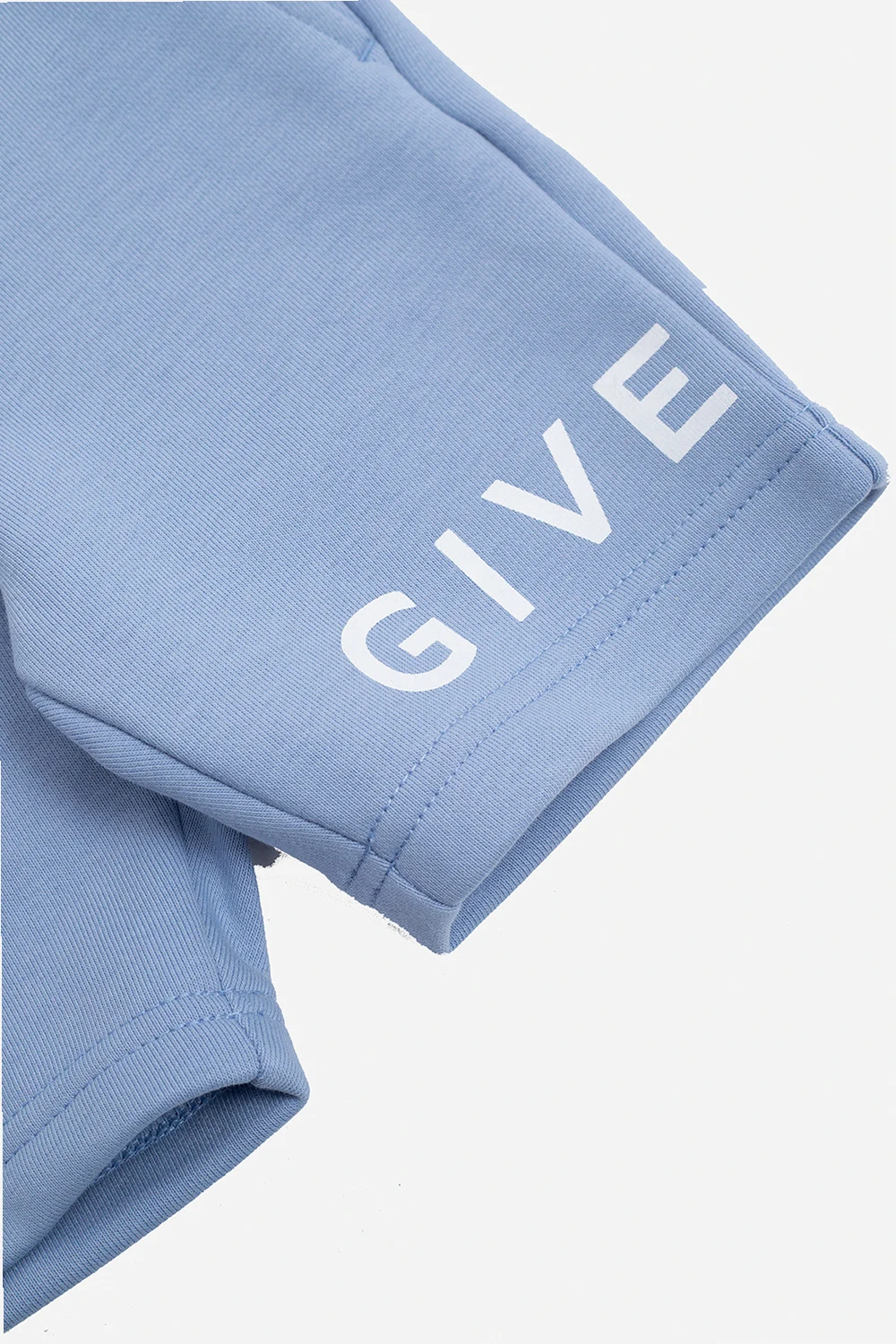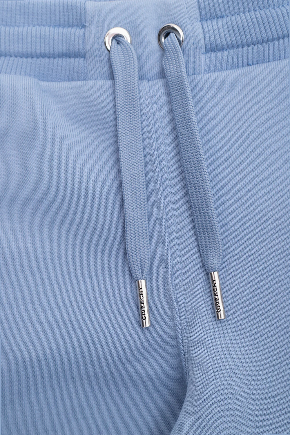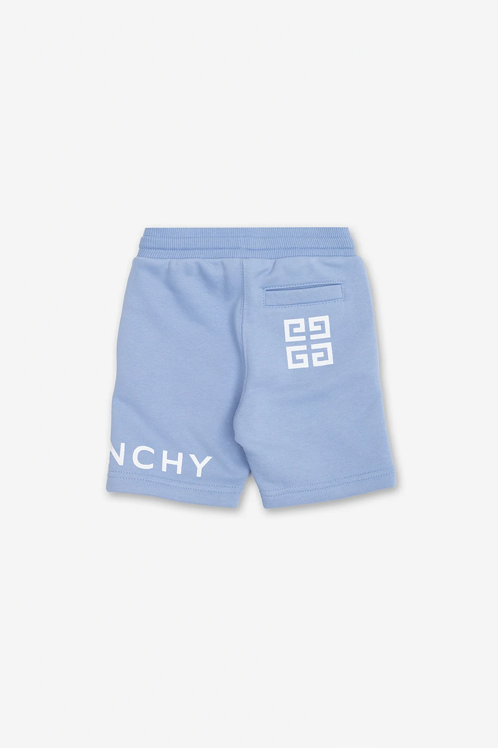 Jasnoniebieskie szorty Givenchy Kids. Wykonane z bawełny. W pasie wszyta guma ściągana trokami. Ozdobione nadrukowanym logo oraz motywem ‘4G’ w kolorze białym. Trzy wsuwane kieszenie.