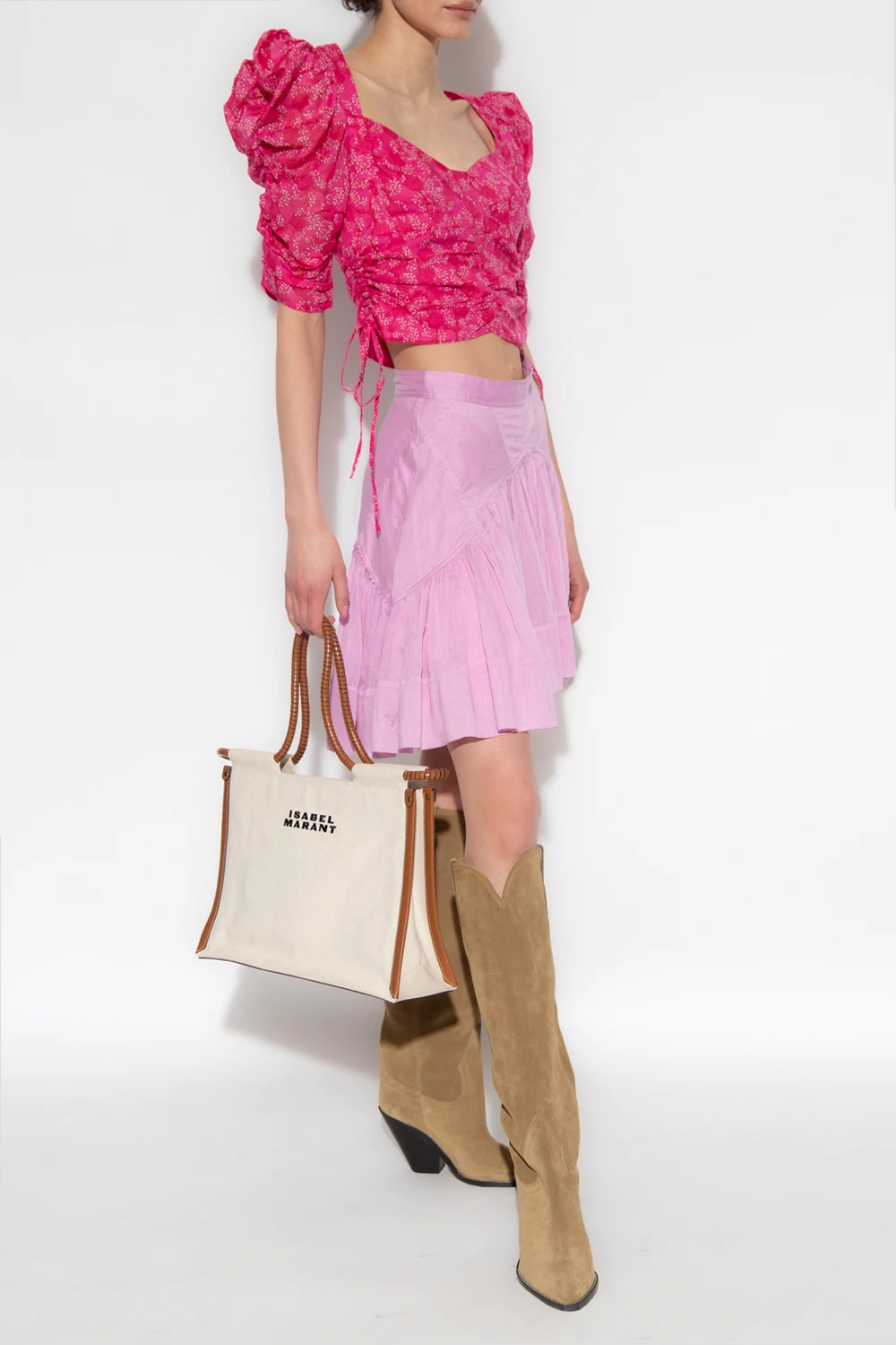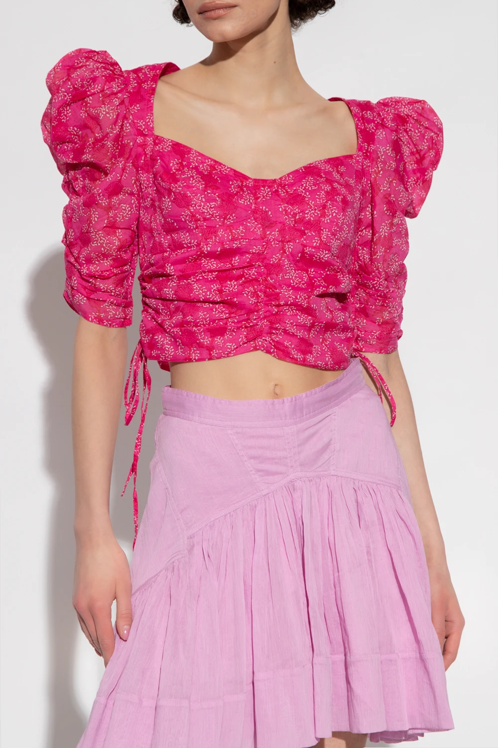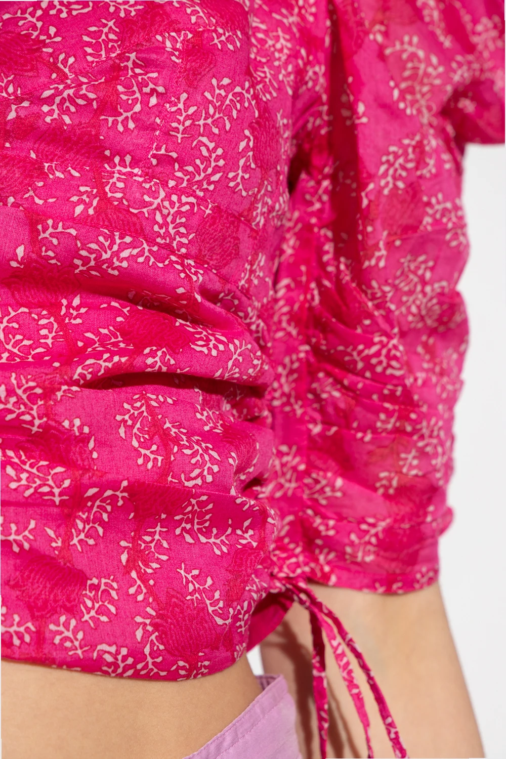 Różowo-biały top, model ‘Galaor’ Marant Etoile. Wykonany z bawełny. Z tyłu zapinany na zamek. Ozdobiony wzorem z motywem roślinnym. Po bokach dekoracyjnie ściągany trokami. Krótkie, bufiaste rękawy.