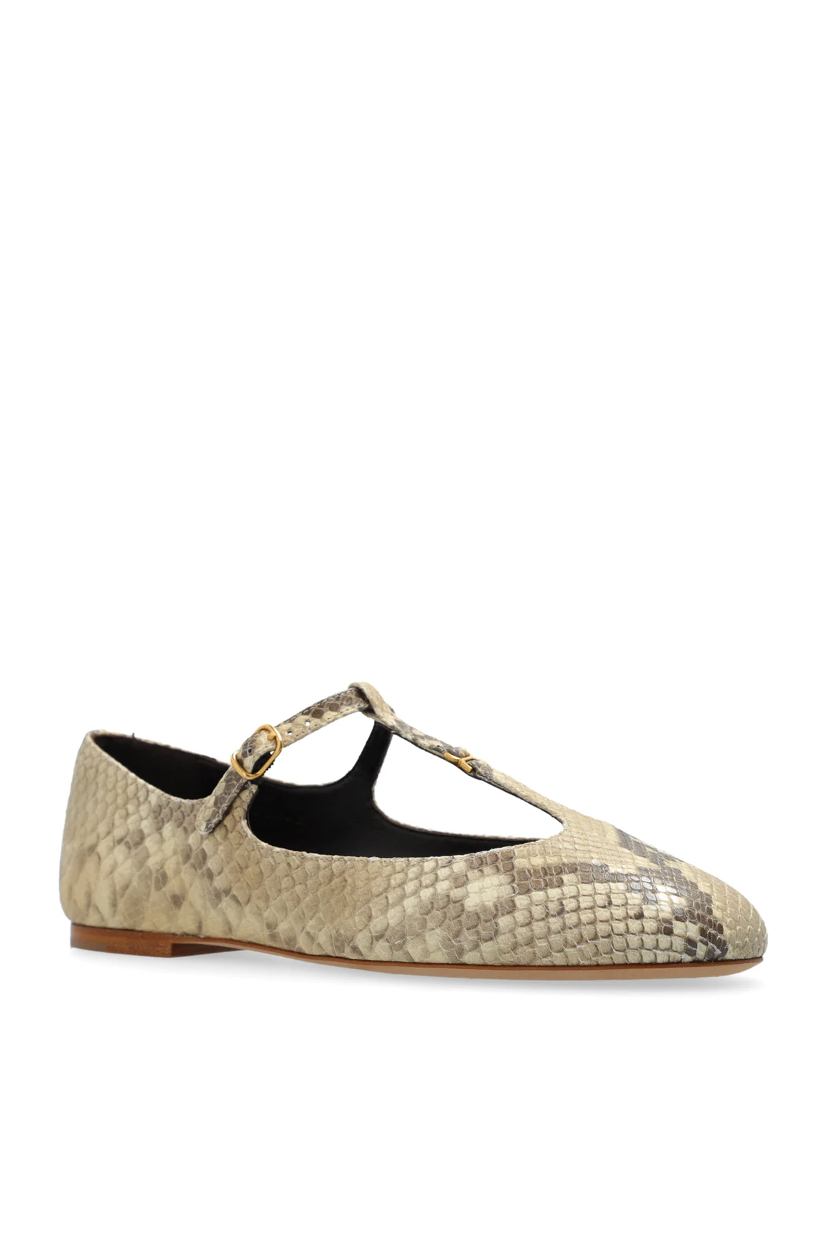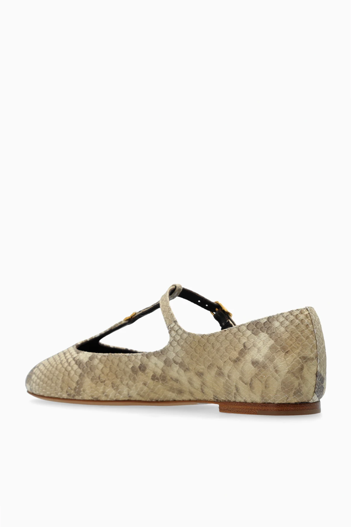 Przedstawiamy Państwu skórzane baleriny ‘Marcie’ od renomowanego projektanta Chloé , które są kwintesencją kobiecości połączonej z wyrafinowanym stylem. Wykonane z najwyższej jakości skóry, te beżowe baleriny urzekają wzorem imitującym skórę węża, dzięki czemu zyskują niepowtarzalny charakter. Zaokrąglony przód buta gwarantuje elegancki wygląd, natomiast pasek z subtelną, złotą klamrą przesuwający się przez śródstopie dodaje im szczyptę luksusu.