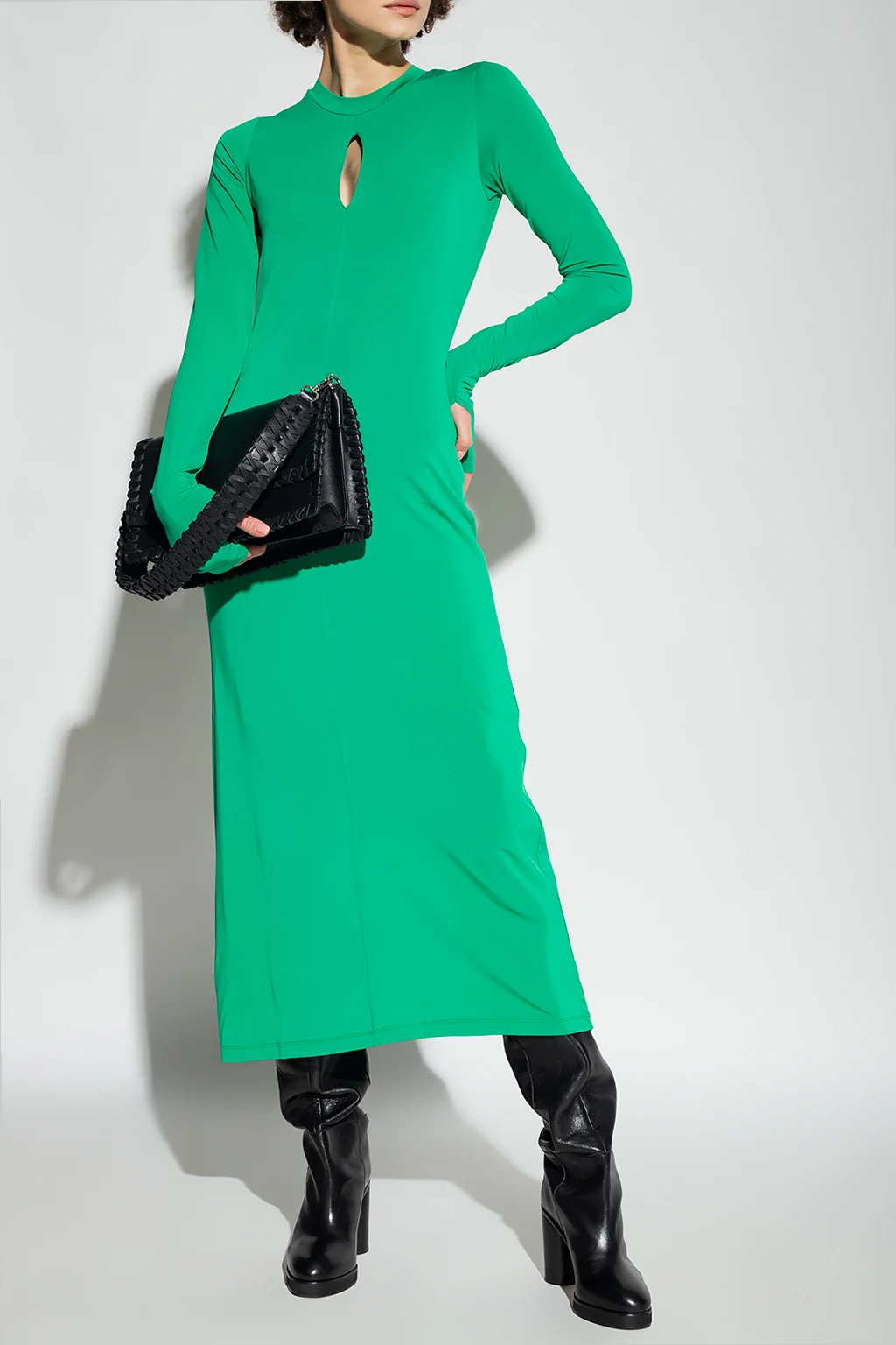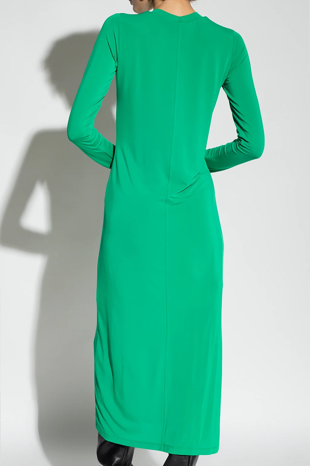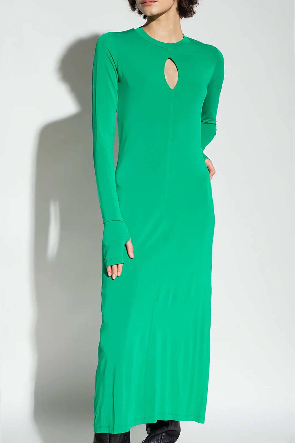 Zielona sukienka Birgitte Herskind. Dekoracyjne przeszycie oraz wycięcie. Okrągły dekolt wykończony ściągaczem. Długie rękawy.