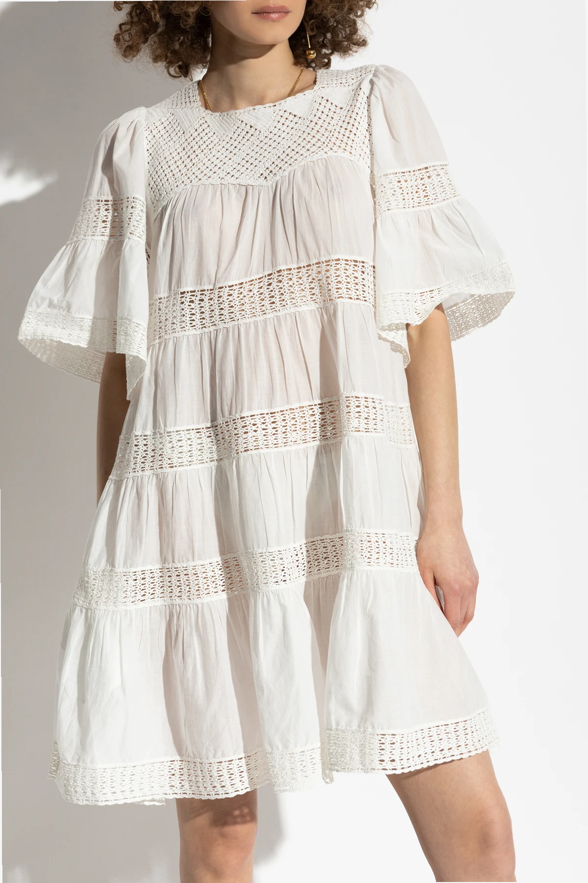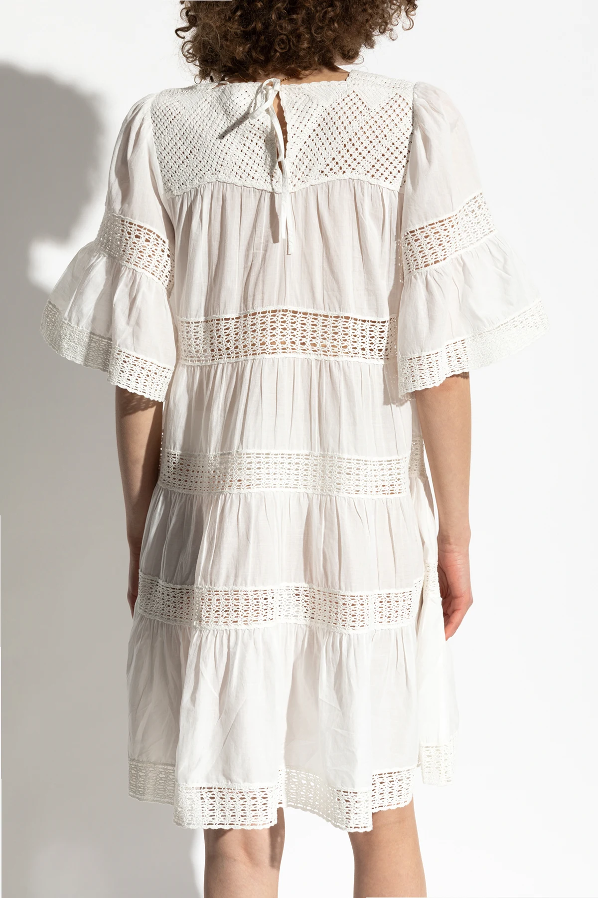 Charakterystyczne szerokie rękawy o długości 3/4 oraz okrągły dekolt nadają sukience unikalnego charakteru. Poziome pasy z ażurowymi wstawkami dodają jej lekkości i finezji. Sukienka sięga przed kolano, co nadaje jej świeżości i letniego wdzięku. Dwie dyskretne kieszenie są praktycznym dodatkiem, zaś delikatne wiązanie na plecach stanowi subtelną ozdobę.