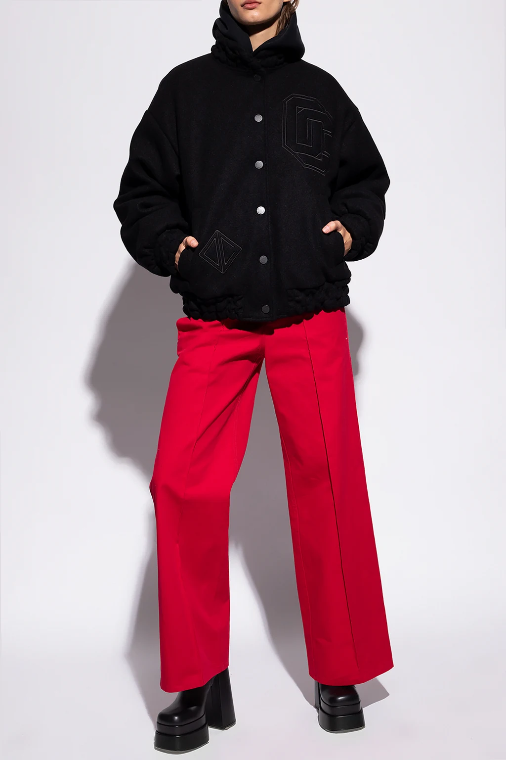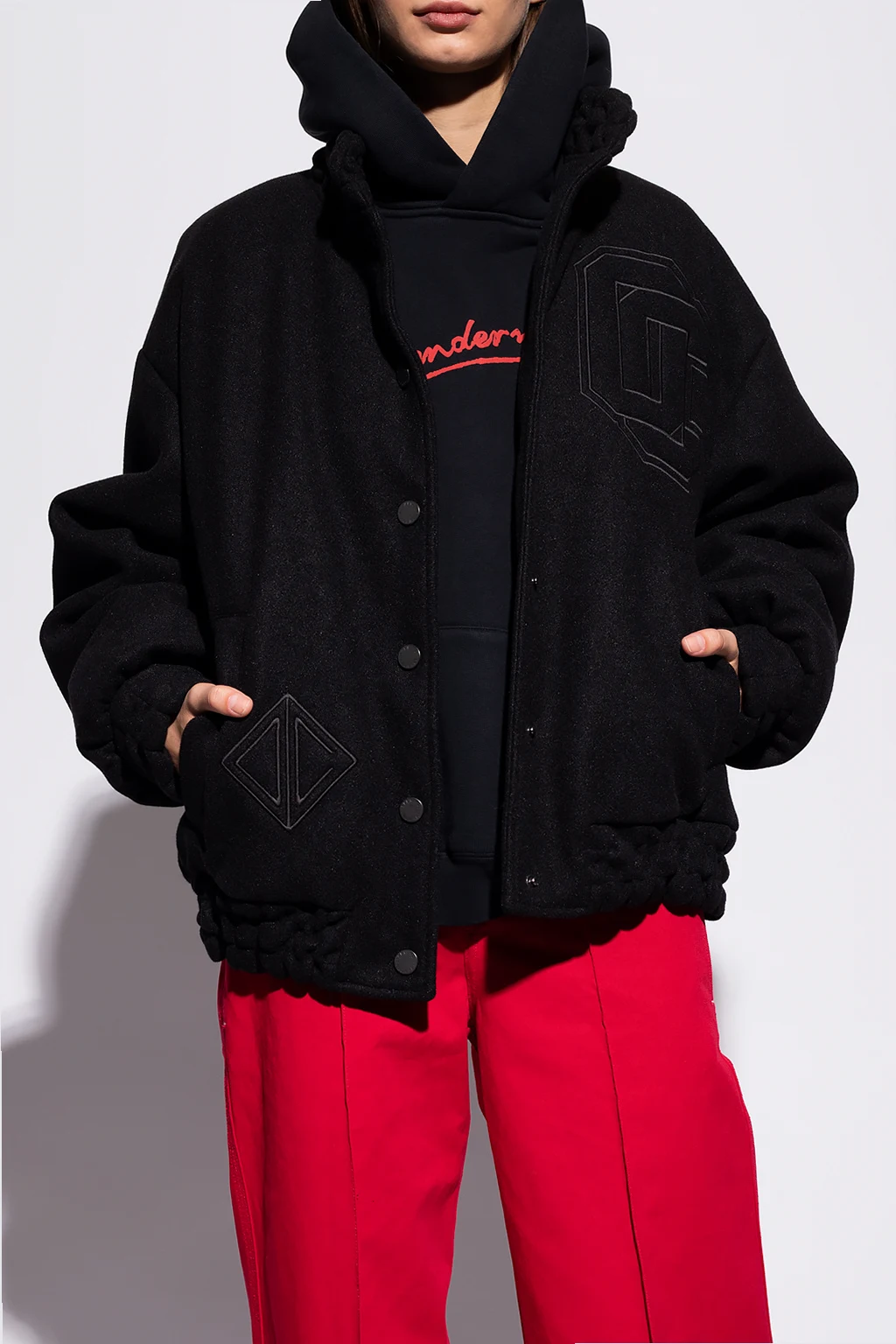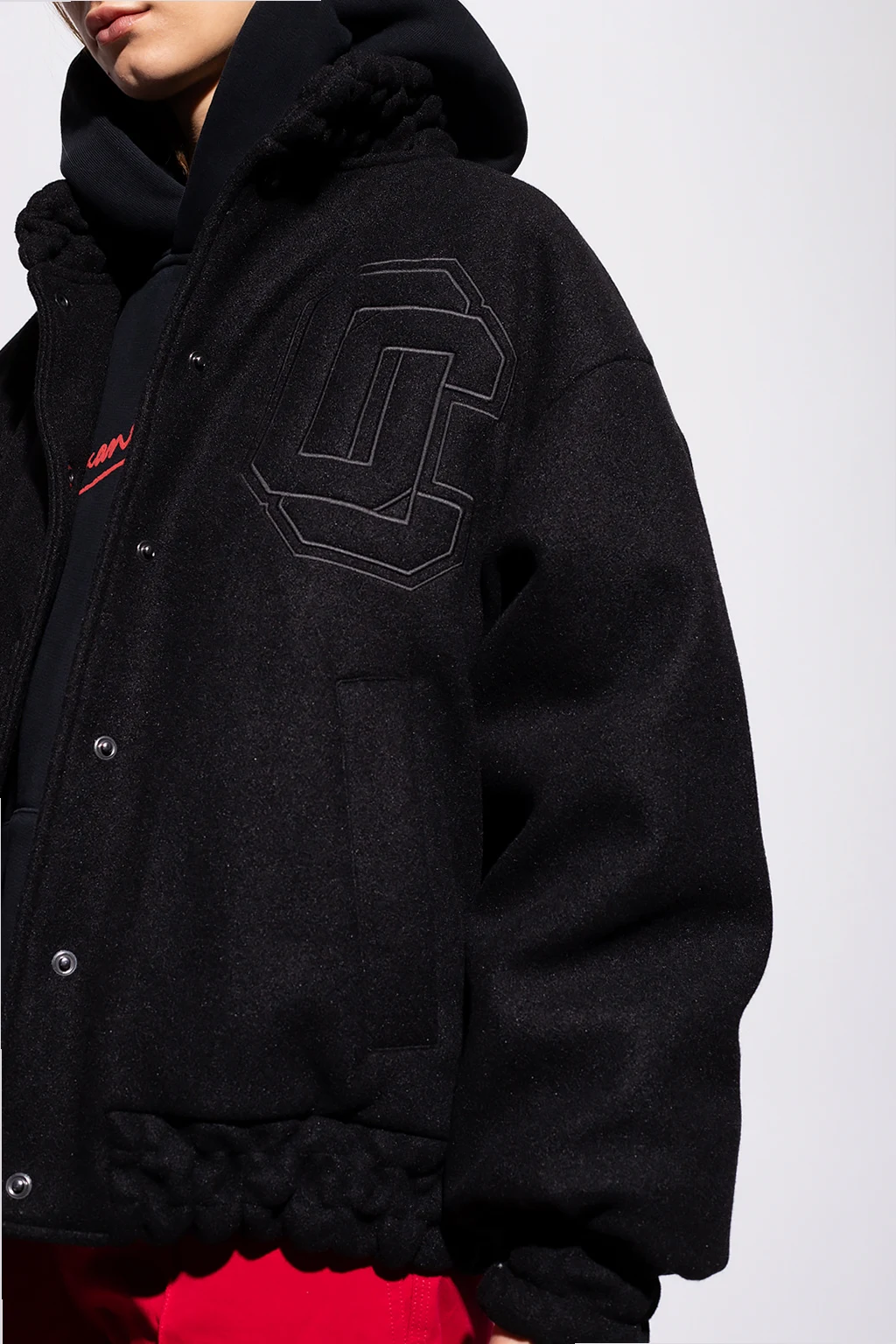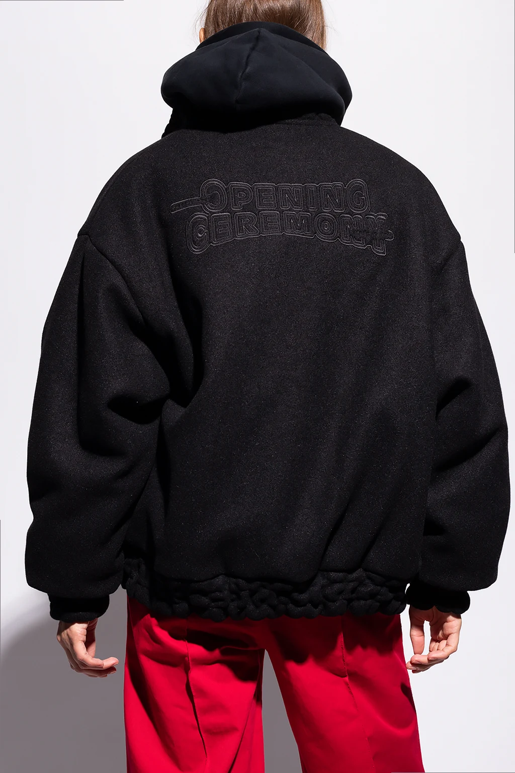 Czarna, ocieplana kurtka Opening Ceremony. Zapinana za zatrzaski. Ozdobiona wypukłymi naszywkami oraz logo. Dwie wsuwane kieszenie. Stójka, rękawy oraz dół wykończone ściągaczem.