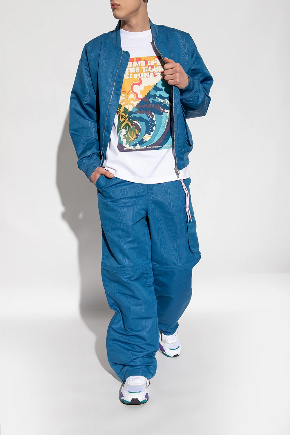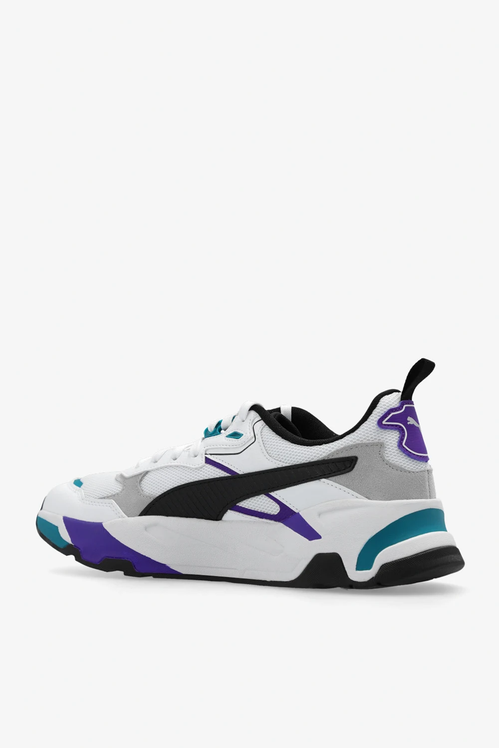 Biało-czarno-fioletowo-zielone, sznurowane buty sportowe, model ‘TRINITY’ Puma. Wykonane z materiału i materiału syntetycznego. Ozdobione charakterystycznym paskiem oraz aplikacją z logo. Biało-zielono-fioletowa, gumowa podeszwa.