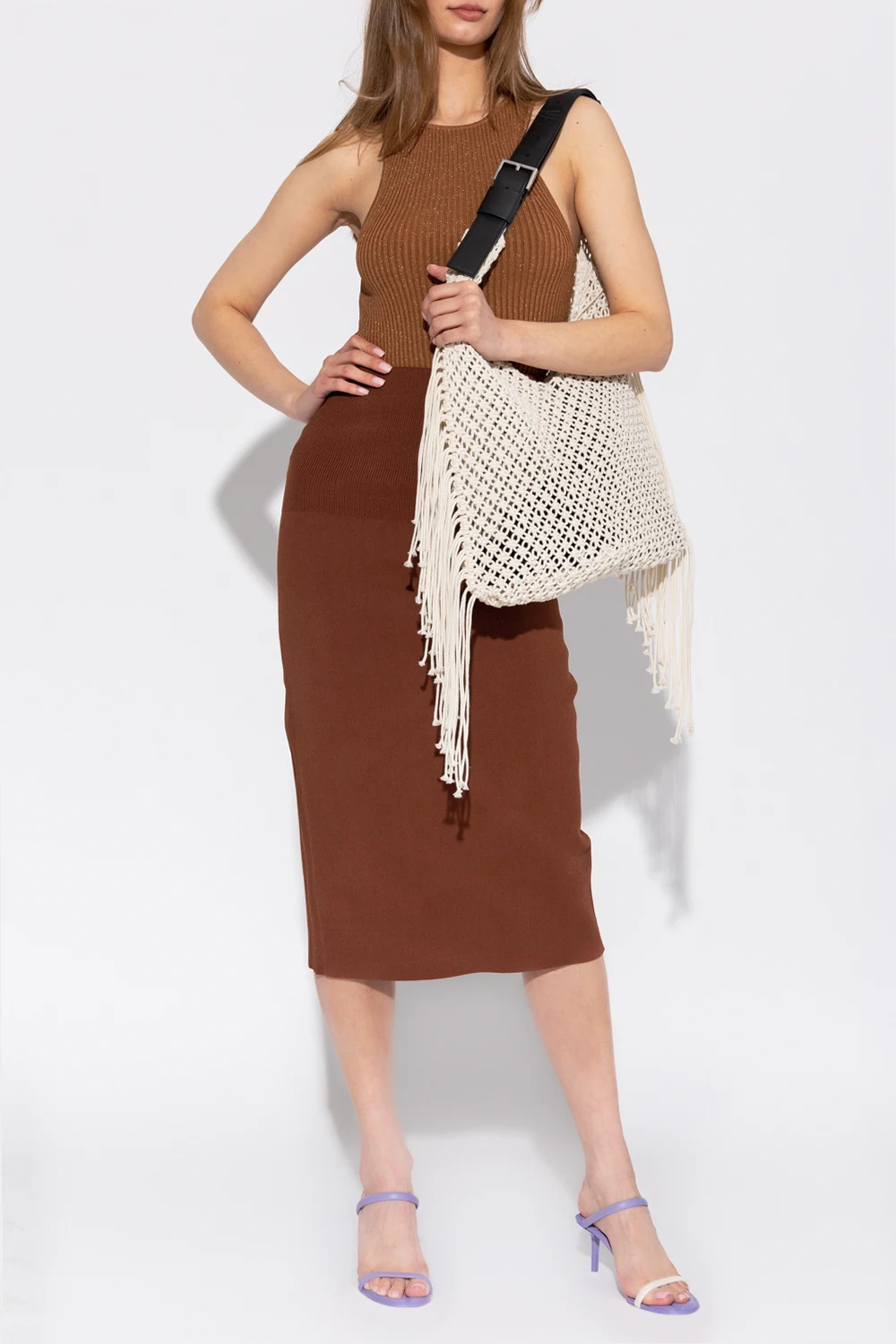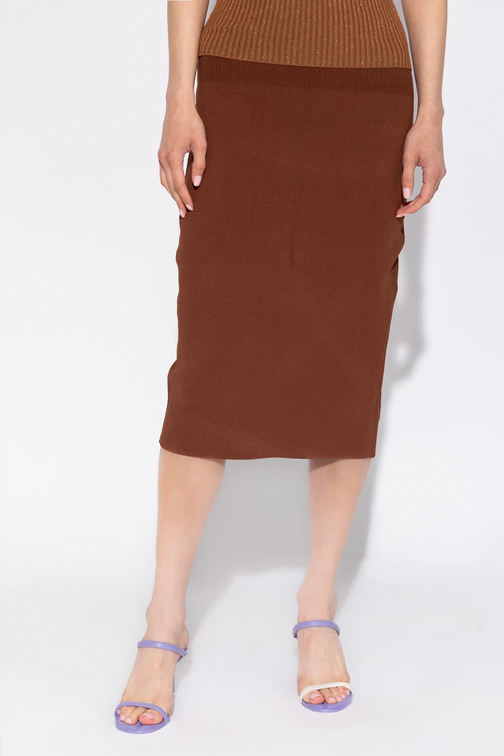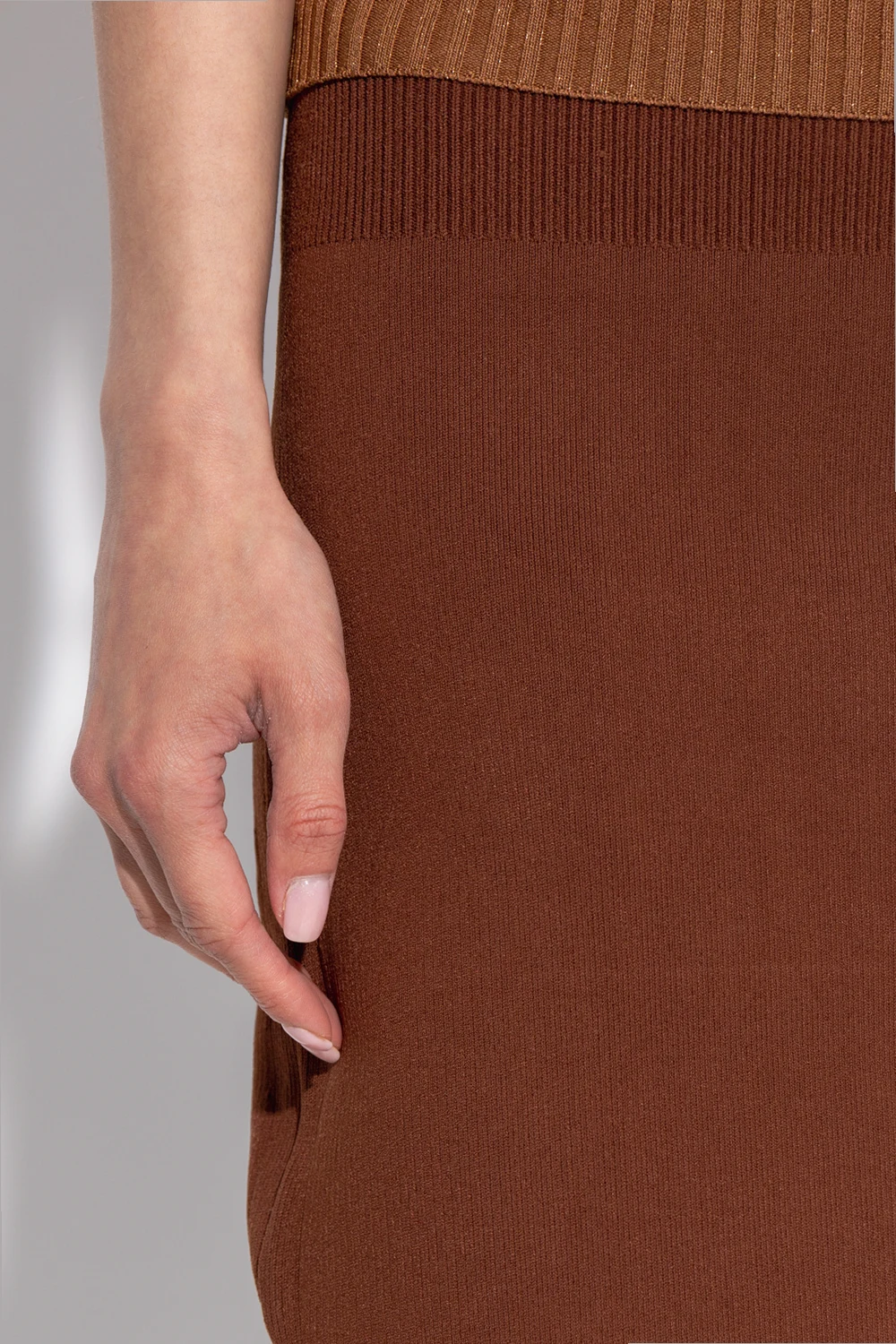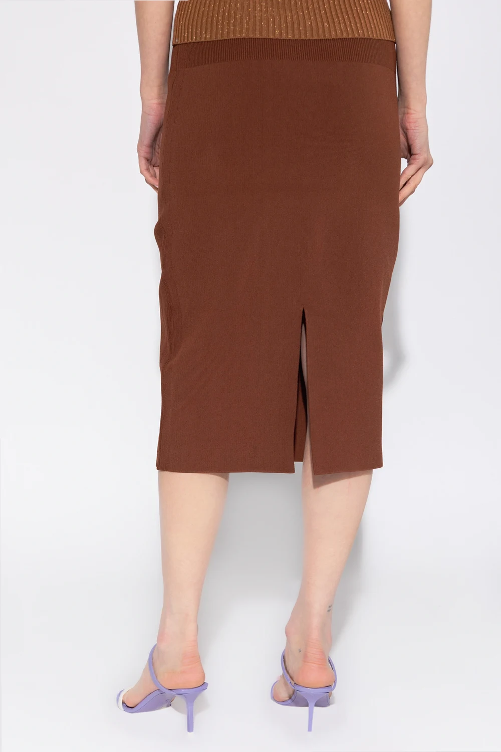 Brązowa, dopasowana, prążkowana spódnica Victoria Beckham, kolekcja ‘Body’. W pasie wszyta guma. Z tyłu pojedyncze rozcięcie.