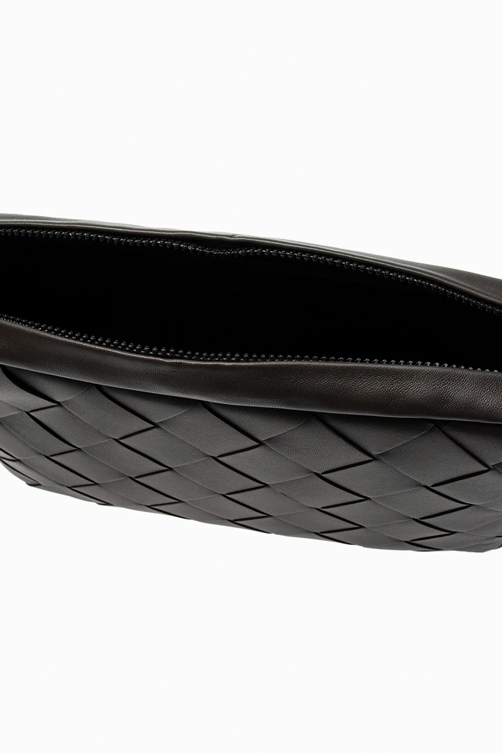 Ciemnobrązowe etui na dokumenty Bottega Veneta. Wykonana ze skóry jagnięcej. Zapinana na zamek. Charakterystyczna dla marki plecionka ‘Intrecciato’. Wewnątrz komora, wsuwana kieszeń oraz kieszeń zapinana na zatrzask.