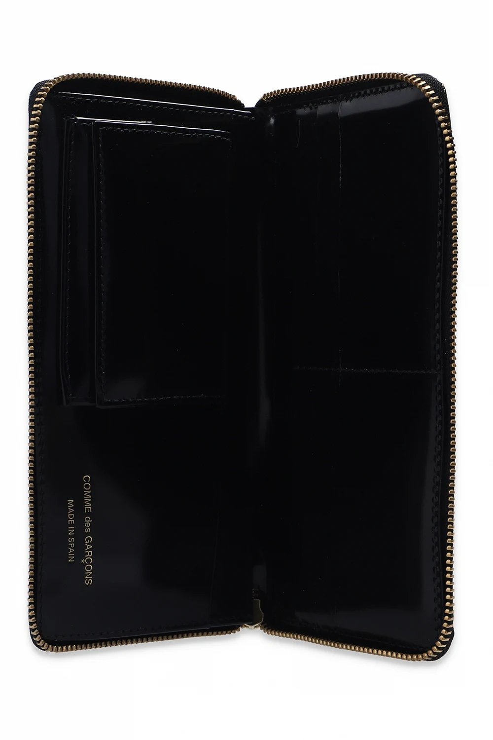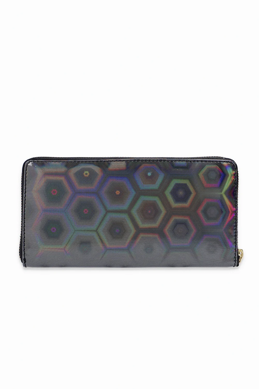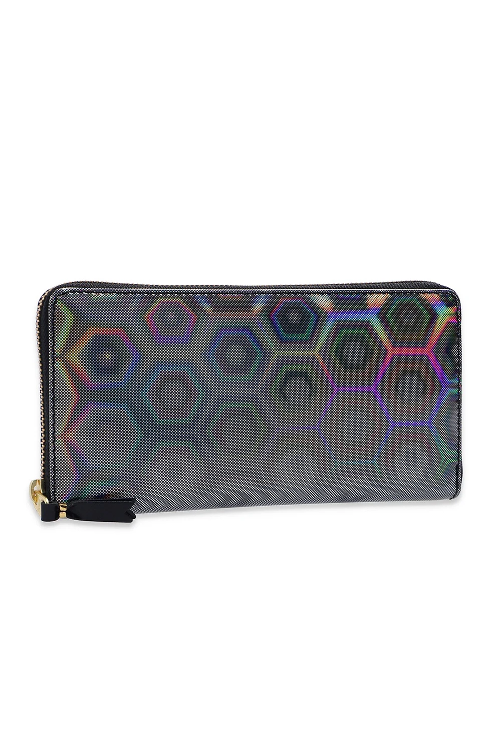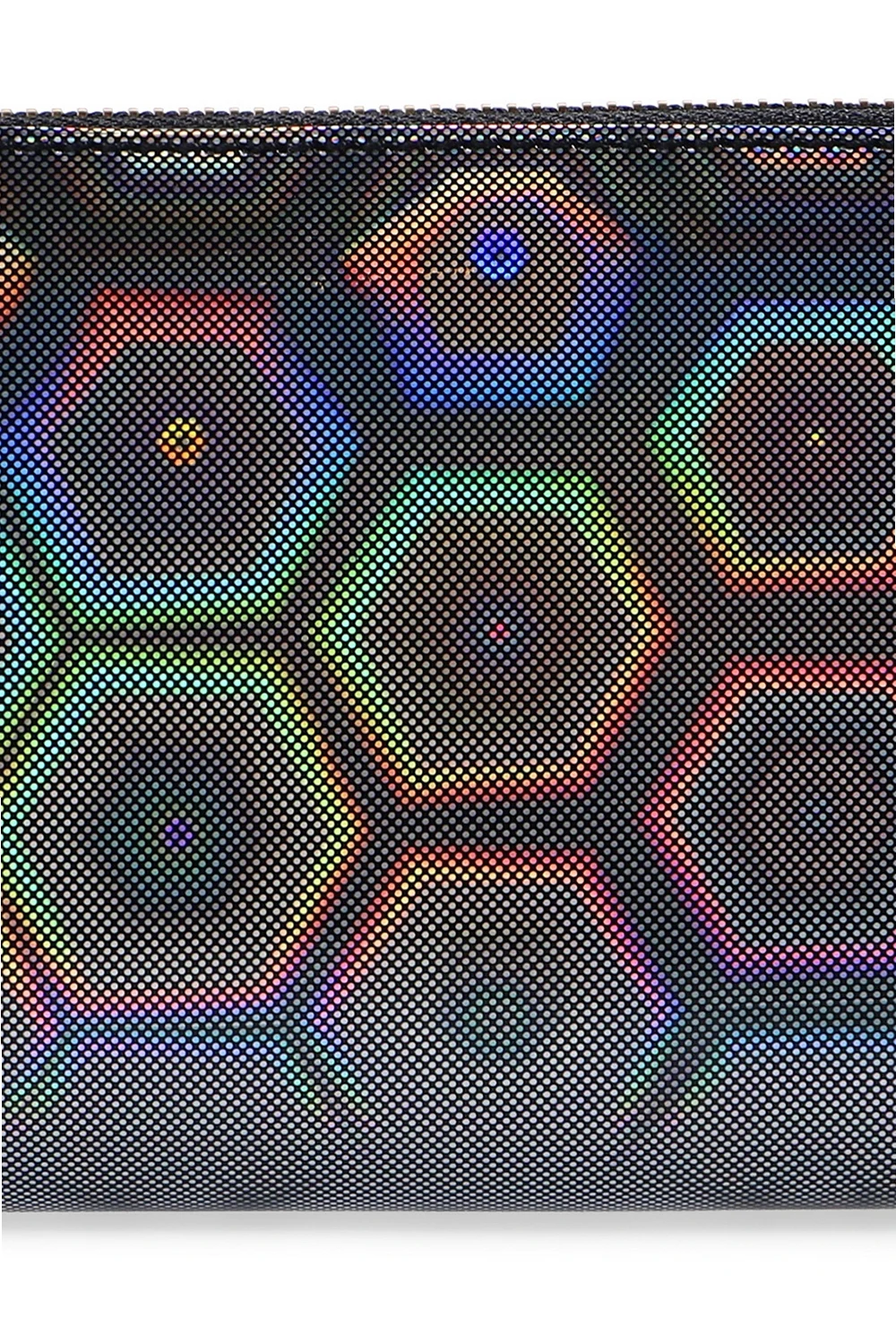 Czarny portfel z efektem holograficznym Comme des Garçons. Zamykany na zamek. Wewnątrz sześć miejsc na karty, trzy wsuwane kieszenie oraz komora na monety. Metalowe wykończenie w kolorze złotym.