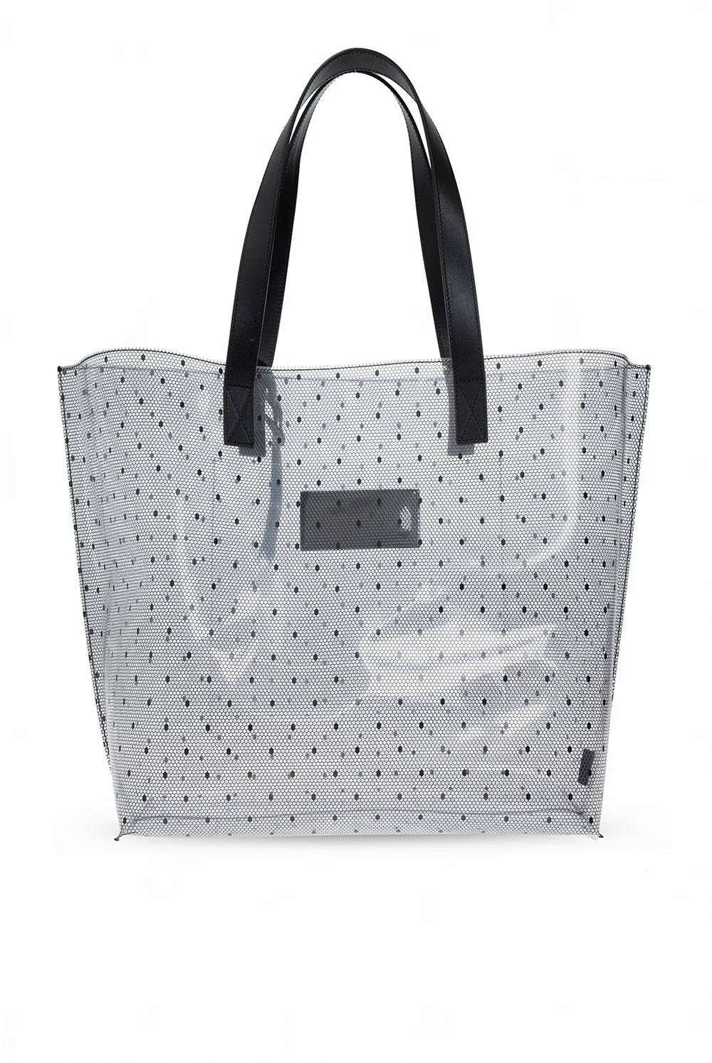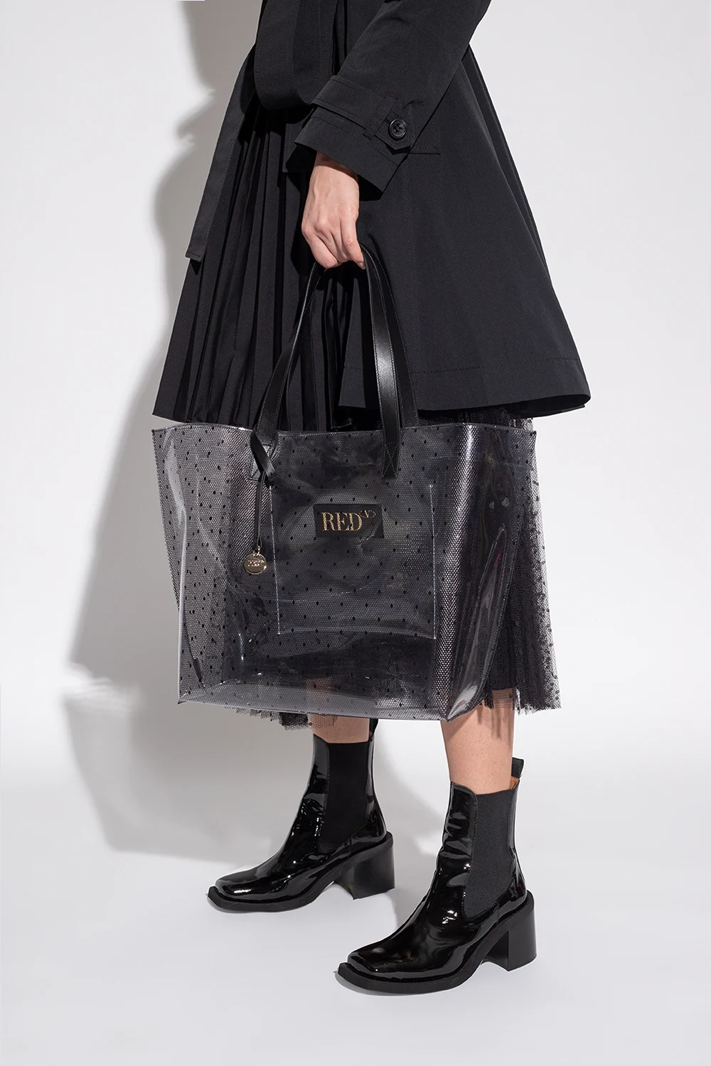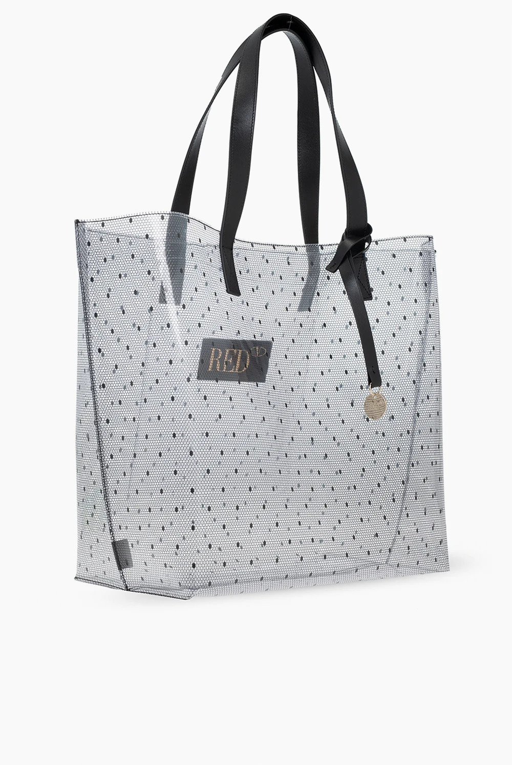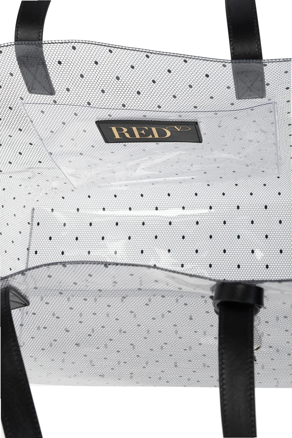 Transparentna torba typu ‘shopper’, model 'Joy2Go' Red Valentino. Wykończona czarną skórą. Ozdobiona charakterystycznym dla marki nadrukiem 'Point d'Esprit'. Dwa półokrągłe paski. Wewnątrz komora i wsuwana kieszeń.