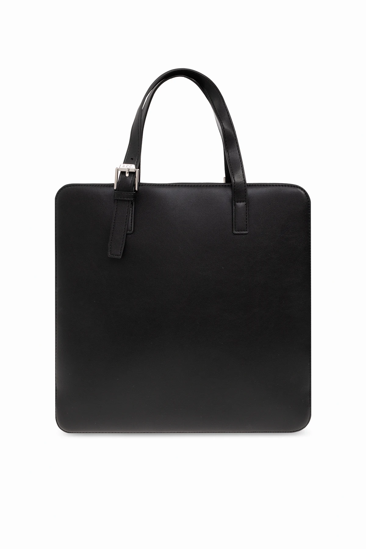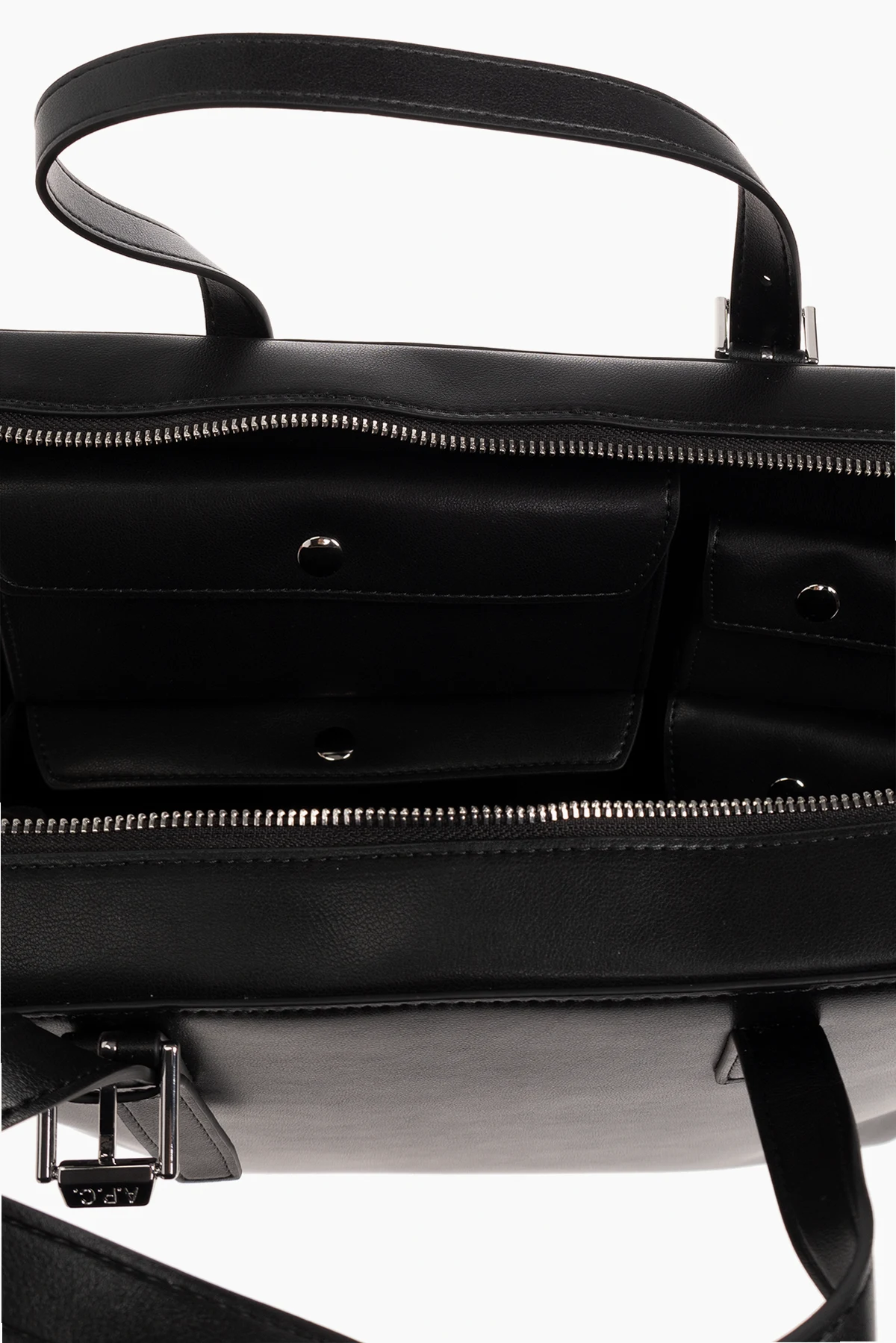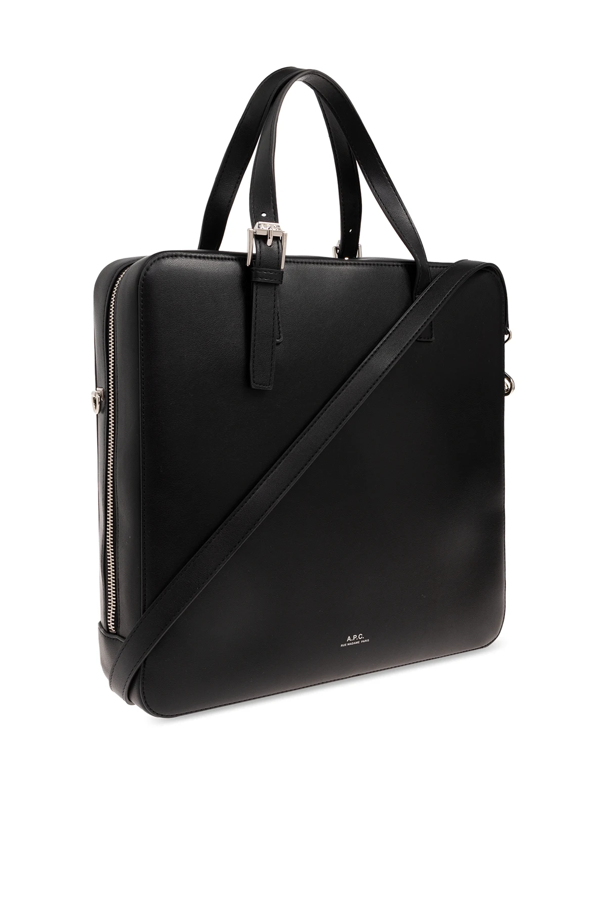 Czarna aktówka, model ‘Ninio’ A.P.C. Zamykana na dwubiegunowy zamek. Ozdobiona logo w kolorze srebrnym. Dwie półokrągłe rączki. Odpinany, regulowany pas na ramię. Wewnątrz komora z dwiema wsuwanymi kieszeniami oraz czterema zapinanymi na zatrzask.
