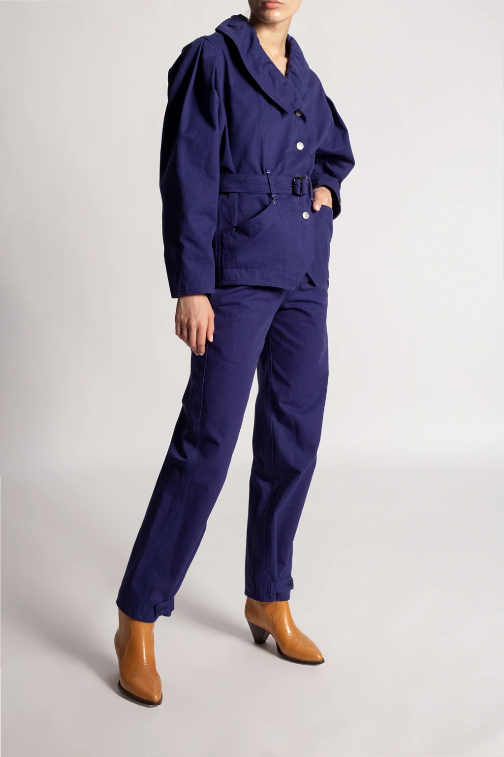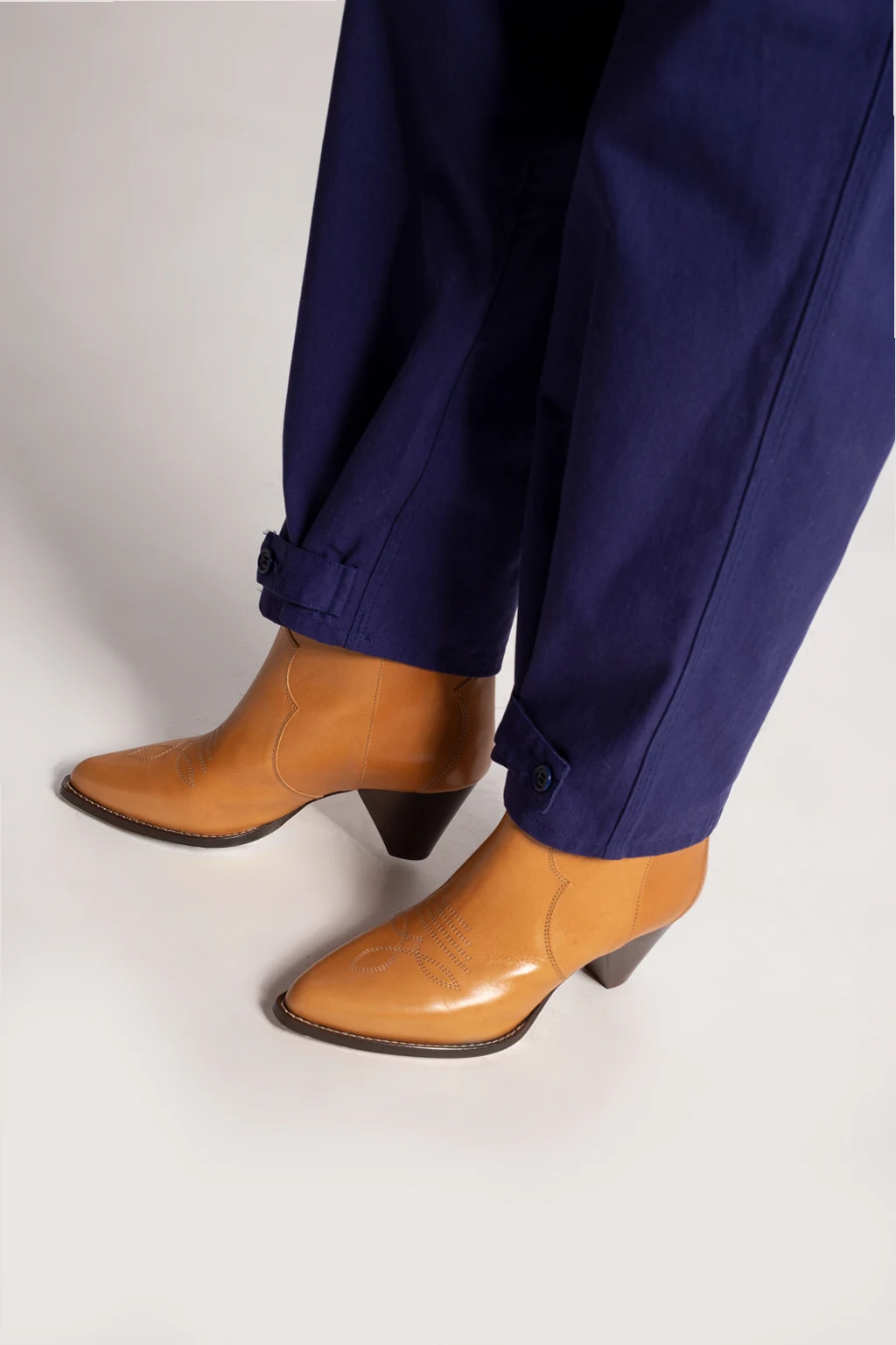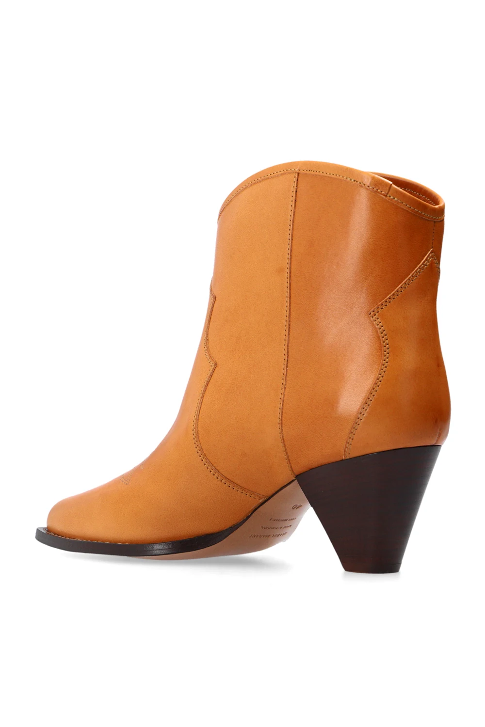 Brązowe kowbojki, model ‘Feminine Santia’ Isabel Marant. Wykonane ze skóry cielęcej. Ozdobione dekoracyjnym przeszyciem. Nosek w szpic. Beżowa, skórzana podeszwa.