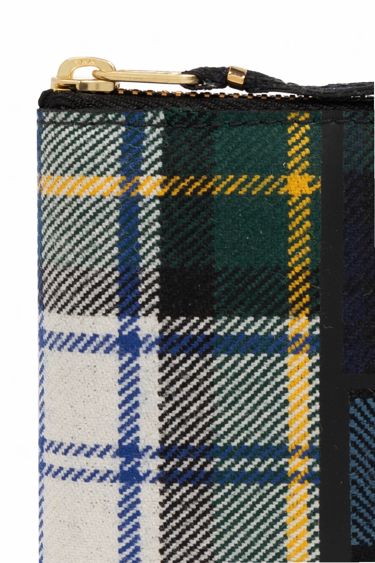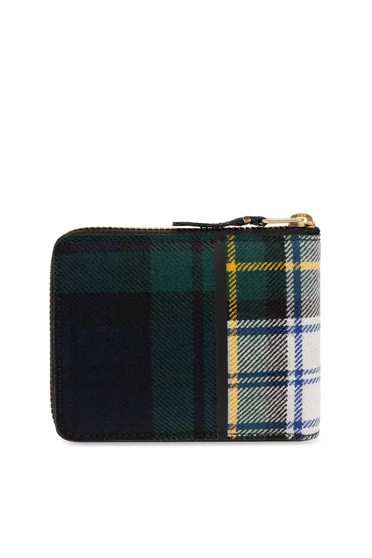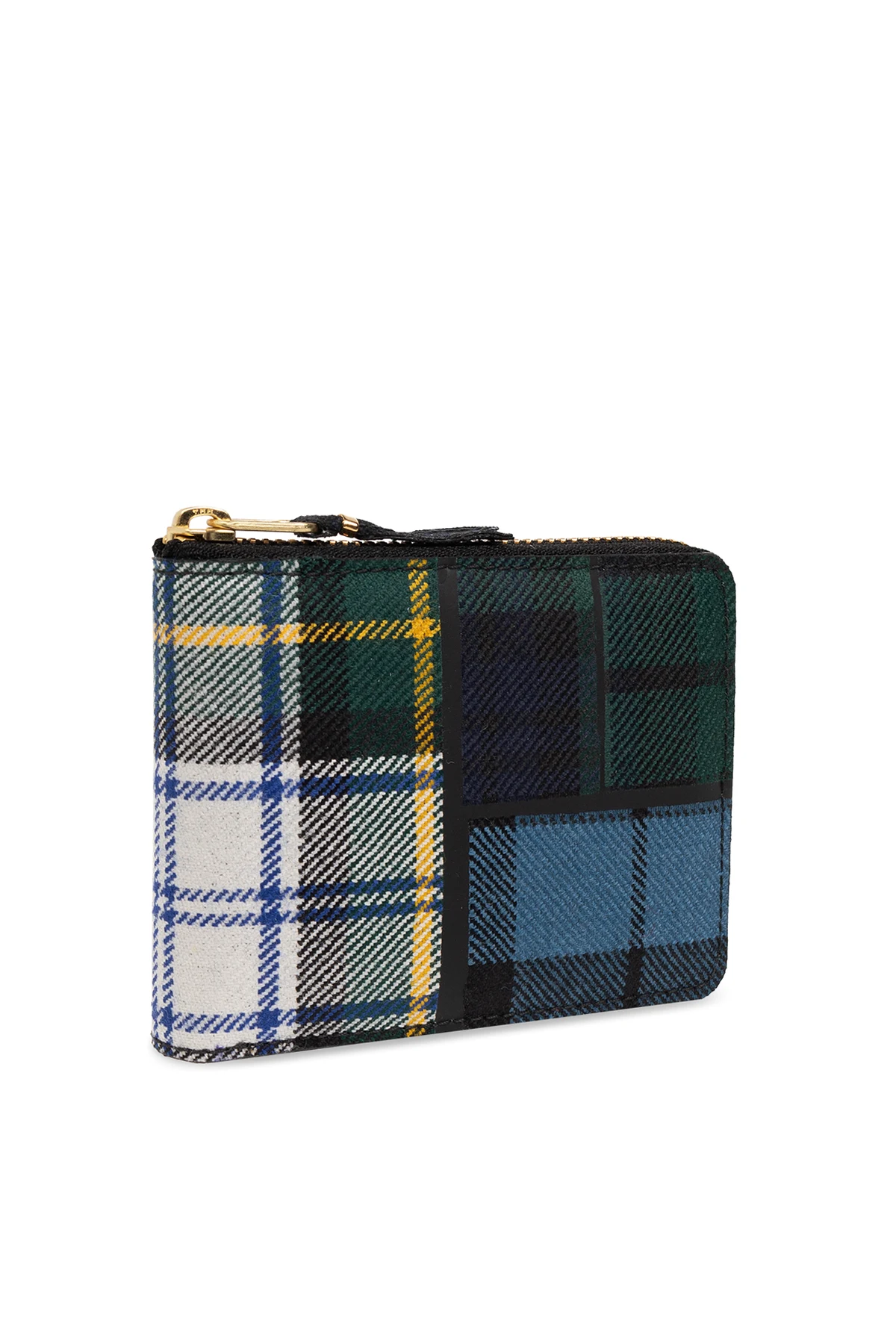 Zielono-biało-niebieski portfel Comme des Garcons. Wykonany z mieszanki wełny. Zamykany na zamek. Ozdobiony wzorem w kratę. Wewnątrz trzy miejsca na karty, kieszeń na banknoty oraz na monety. Metalowe wykończenie w kolorze złotym.