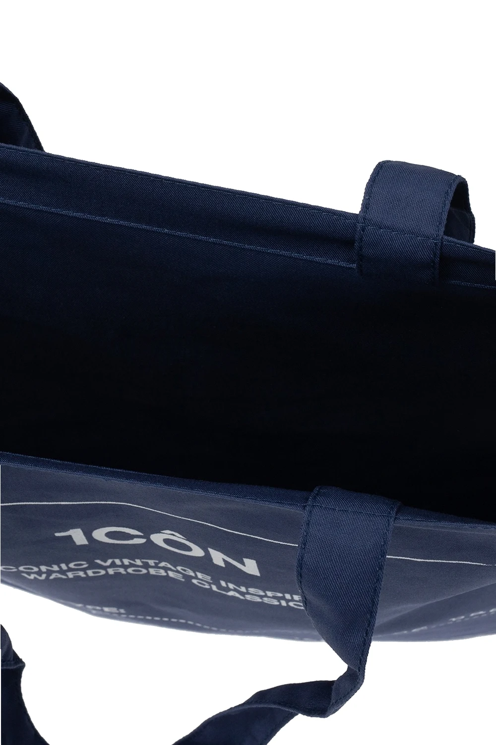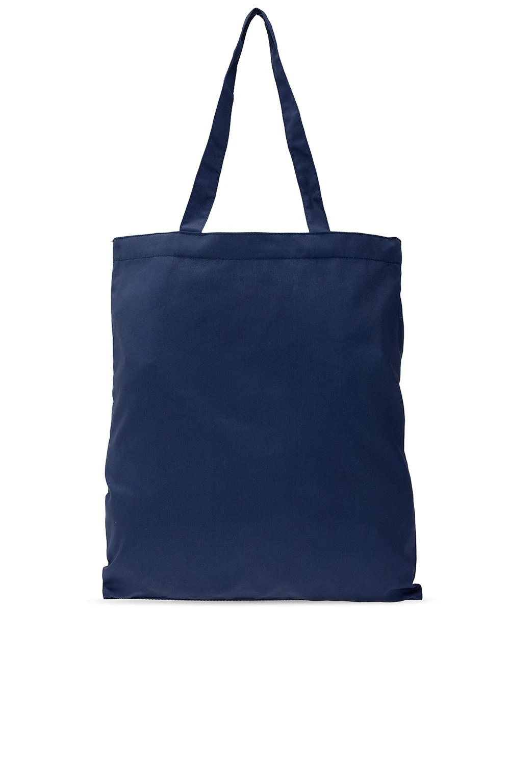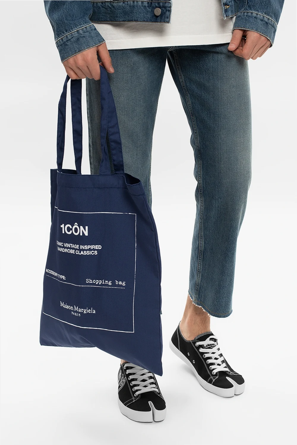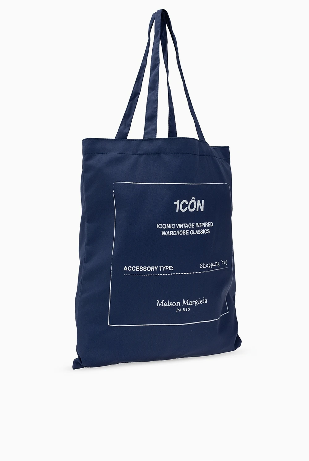 Granatowa torba bawełniana Maison Margiela. Ozdobiona nadrukowanym wzorem z logo w białym. Dwie półokrągłe rączki. Wewnątrz komora.
