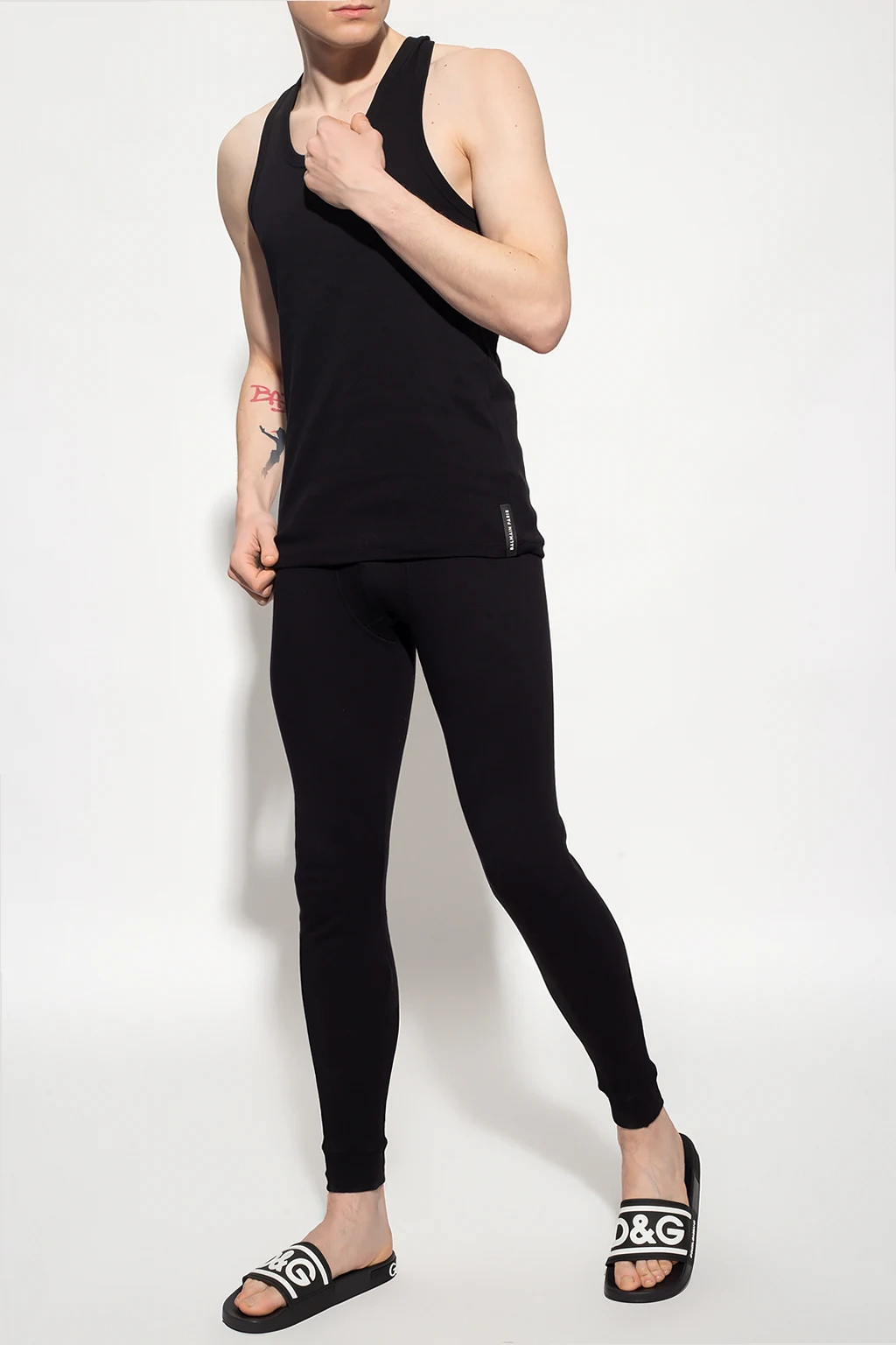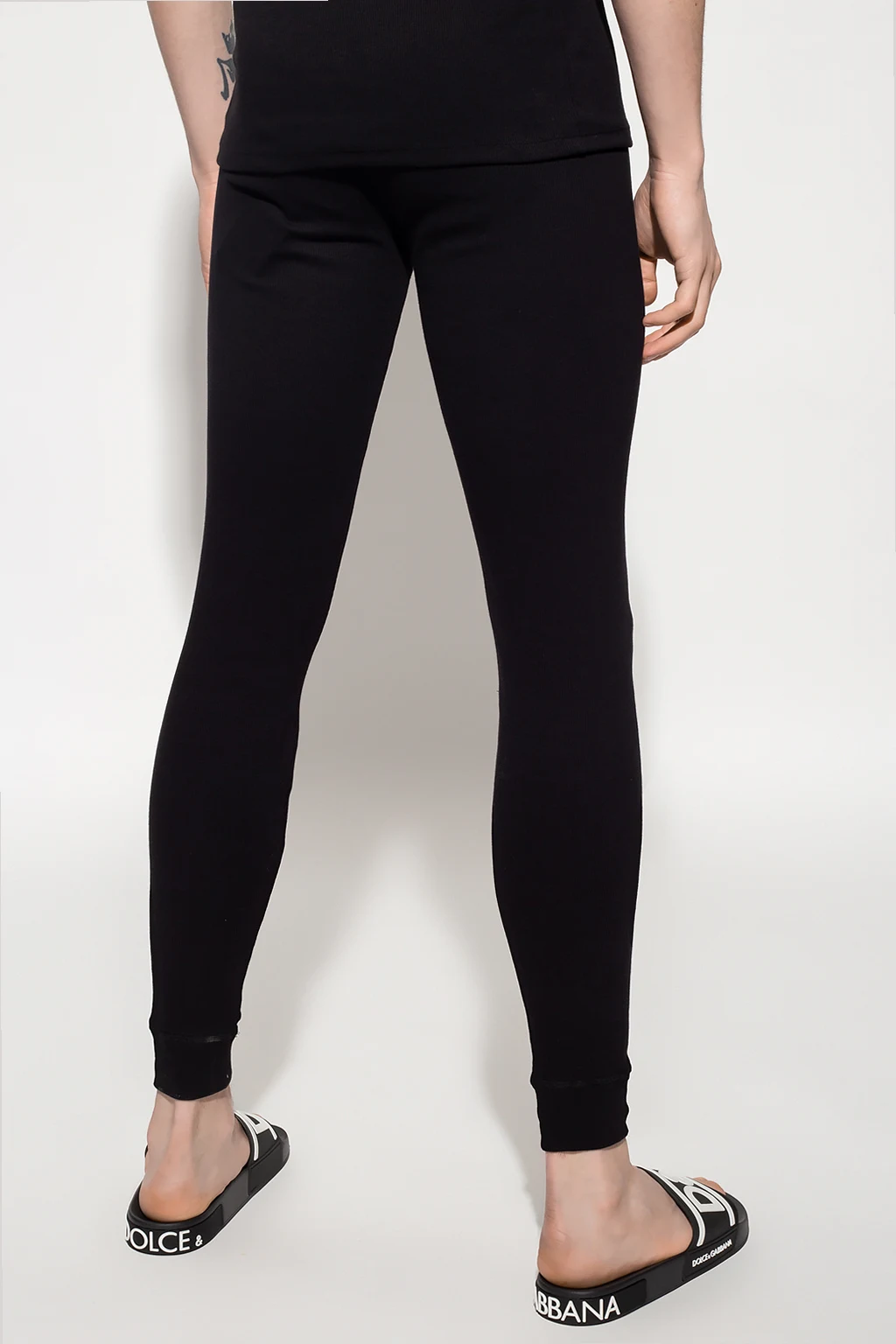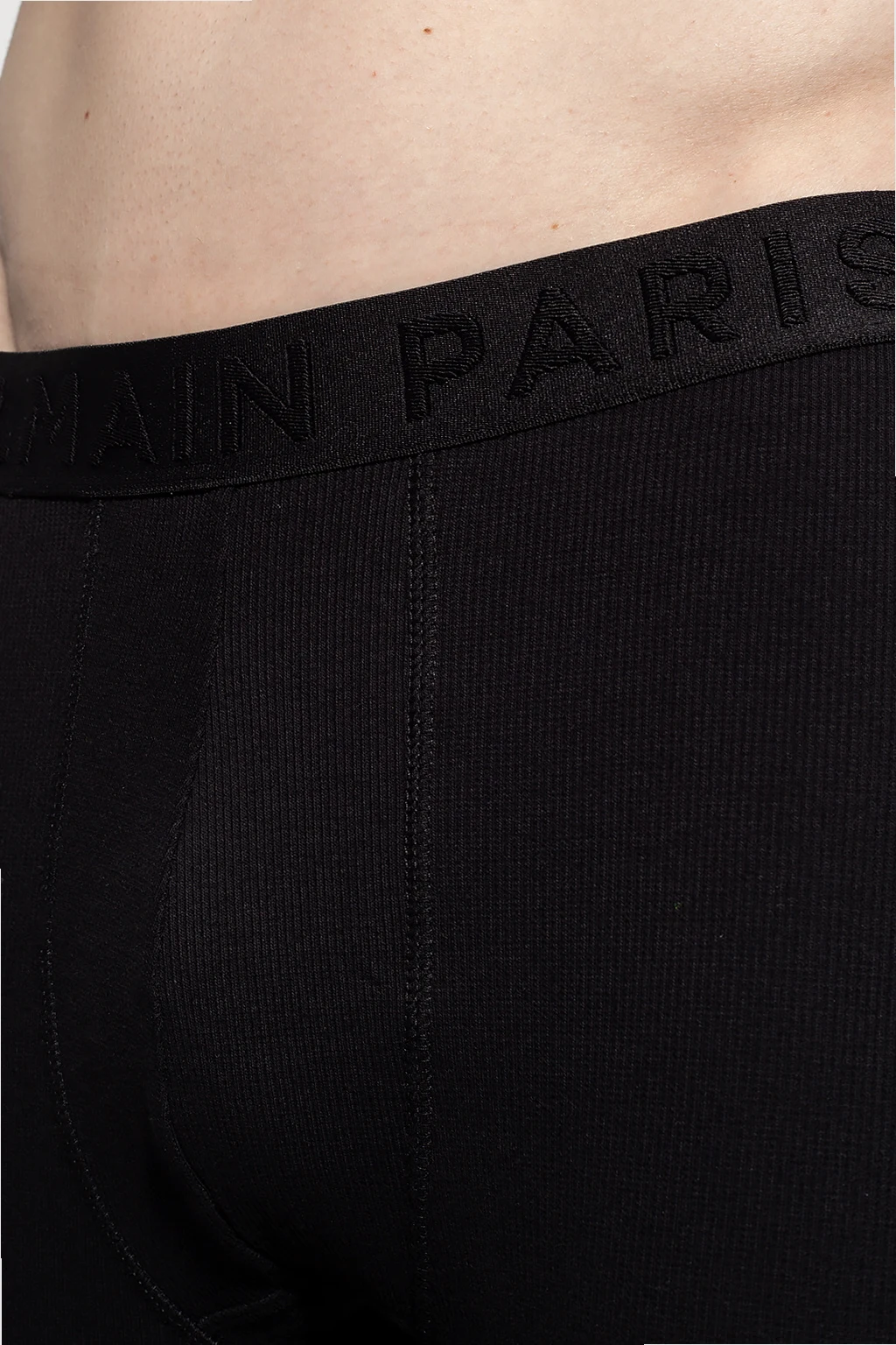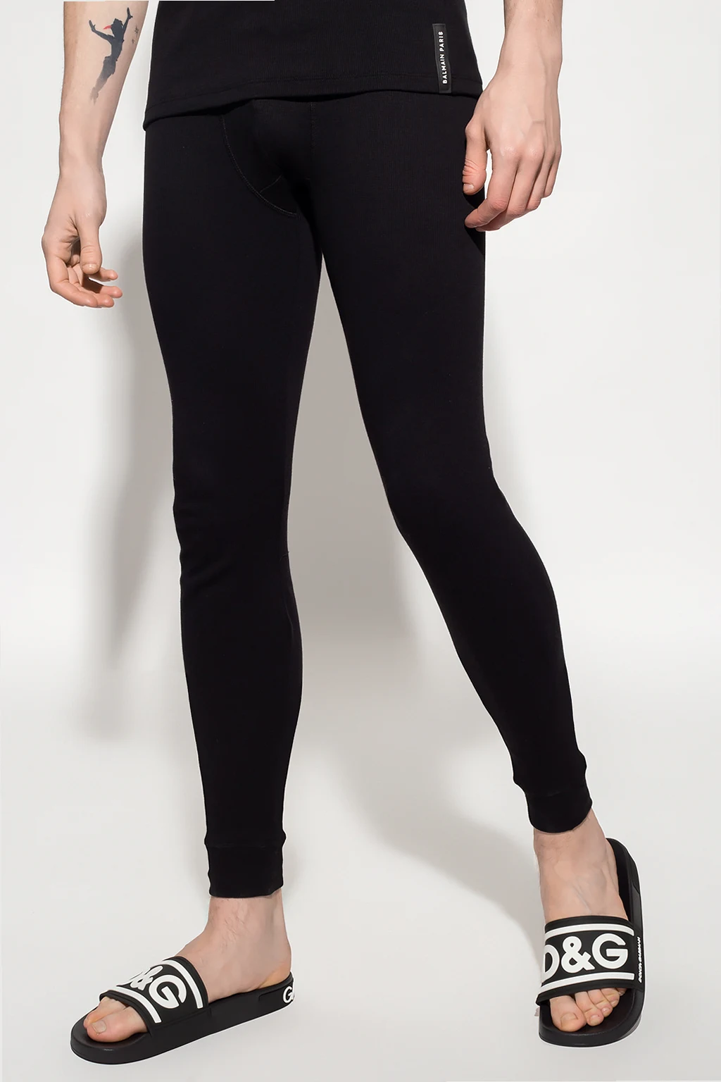 Czarne, prążkowane legginsy Balmain. Wykonane z bawełny. W pasie wszyta guma z logo. Długie nogawki zakończone ściągaczem.