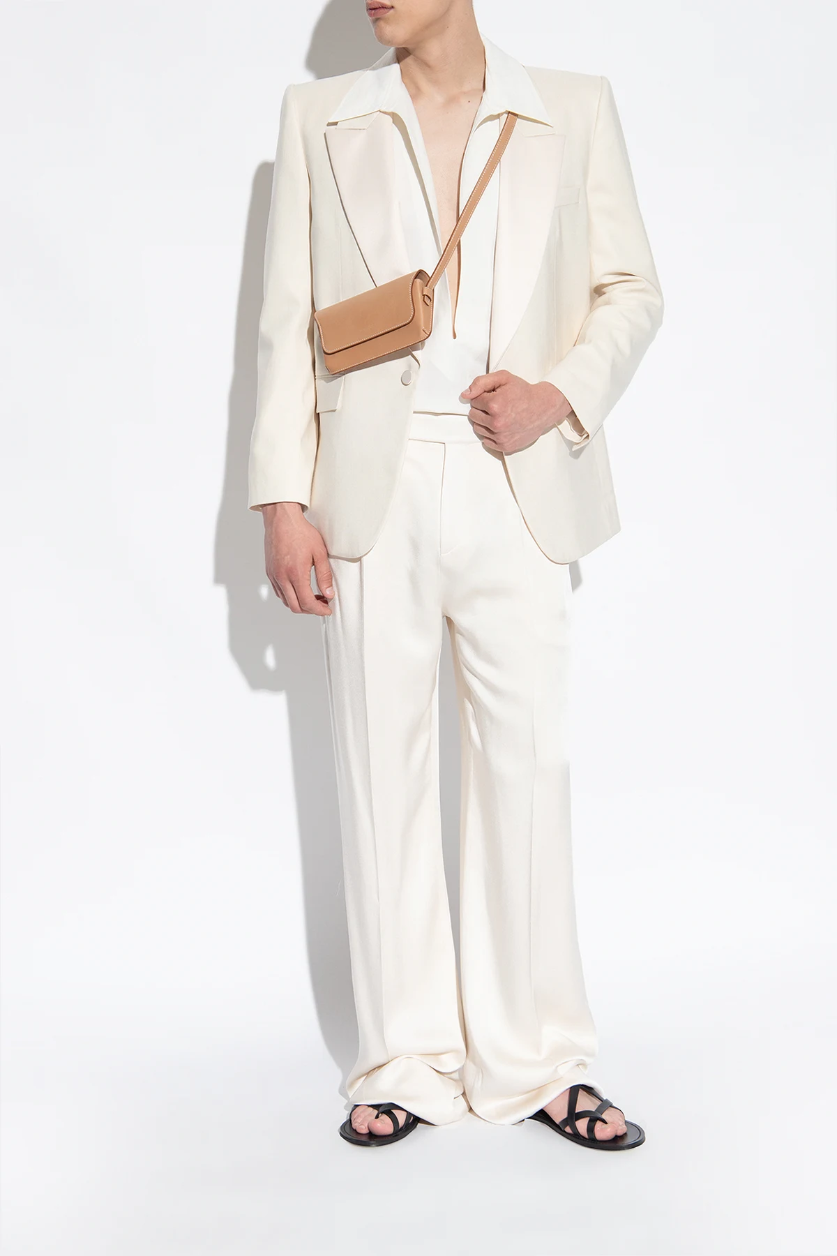 Czarne sandały, model ‘Santo’ Saint Laurent. Wykonane ze skóry. Zapinane wokół kostki na regulowany pasek z klamrą. Dekoracyjnie pleciony przód. Czarna, skórzana podeszwa.