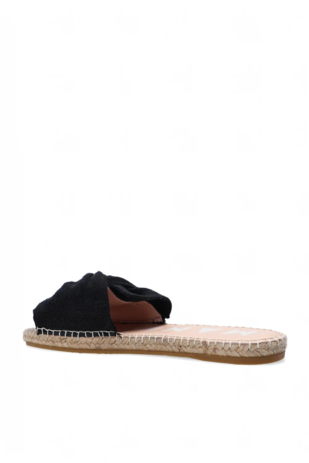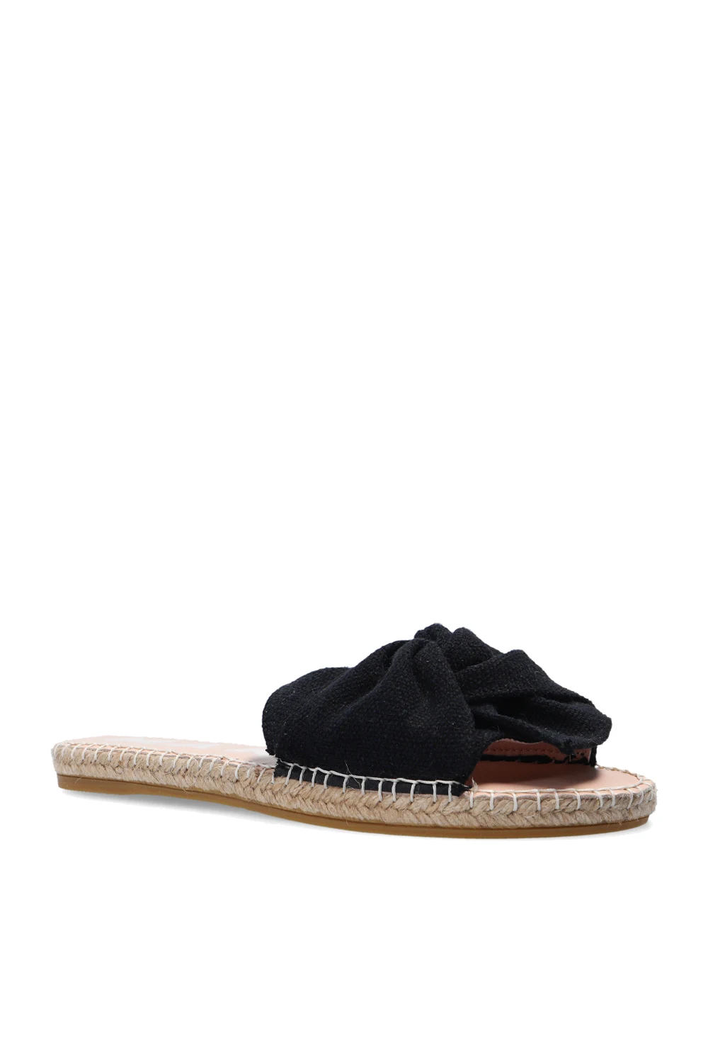 Czarne klapki, model ‘La Havana’ Manebi. Wykonane z organicznego lnu. Ozdobione kokardą. Platforma wykończona naturalną jutą w kolorze beżowym. Beżowa, gumowa podeszwa. Produkt 100% vegan.