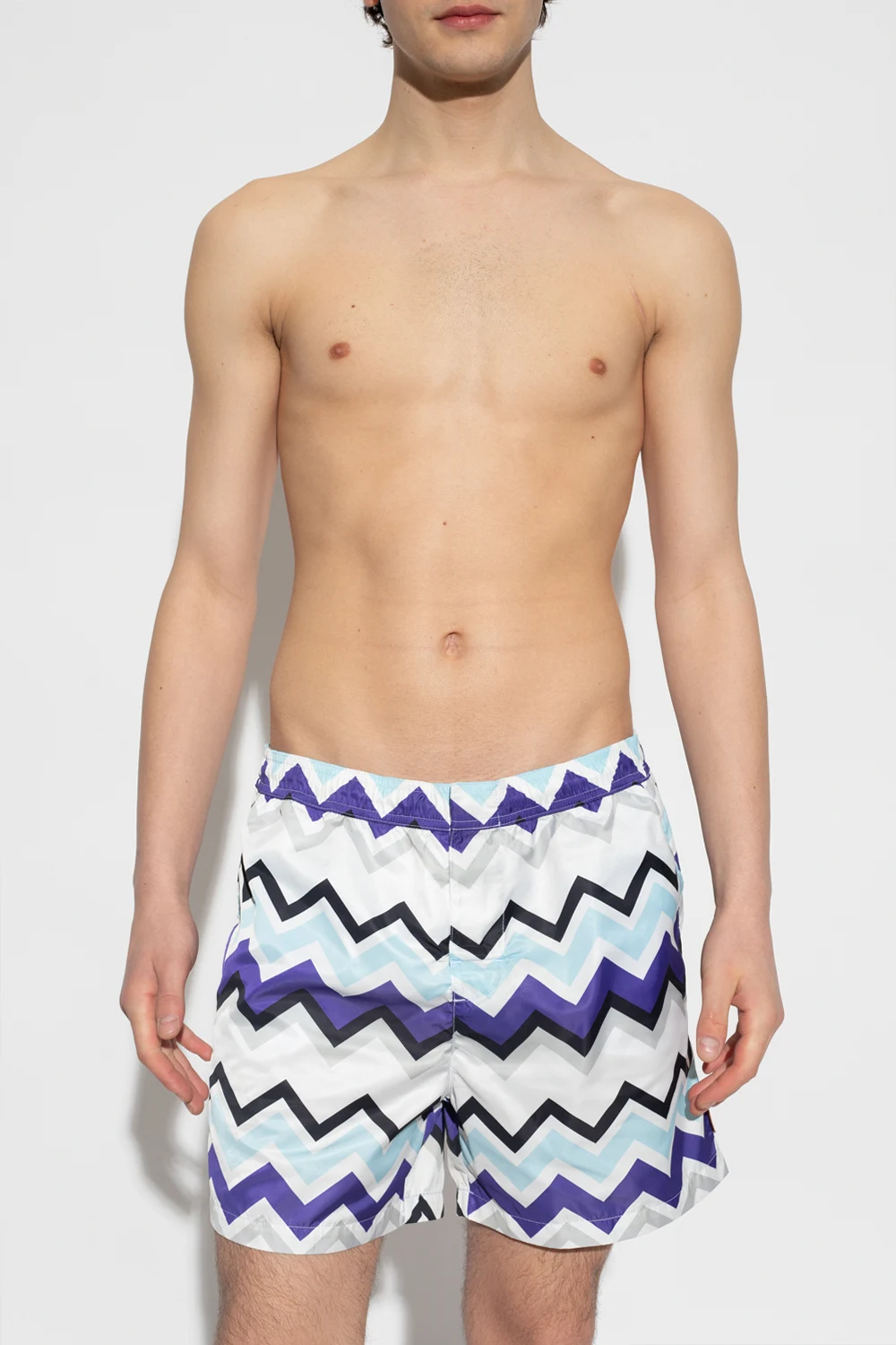 Kolorowe szorty kąpielowe Missoni. W pasie wszyta guma ściągana trokami. Zapinane na zatrzask i rzep. Ozdobione charakterystycznym dla marki wzorem z motywem zygzaków. Trzy kieszenie: dwie wsuwane z przodu i jedna z tyłu z patką zapinaną na rzep.