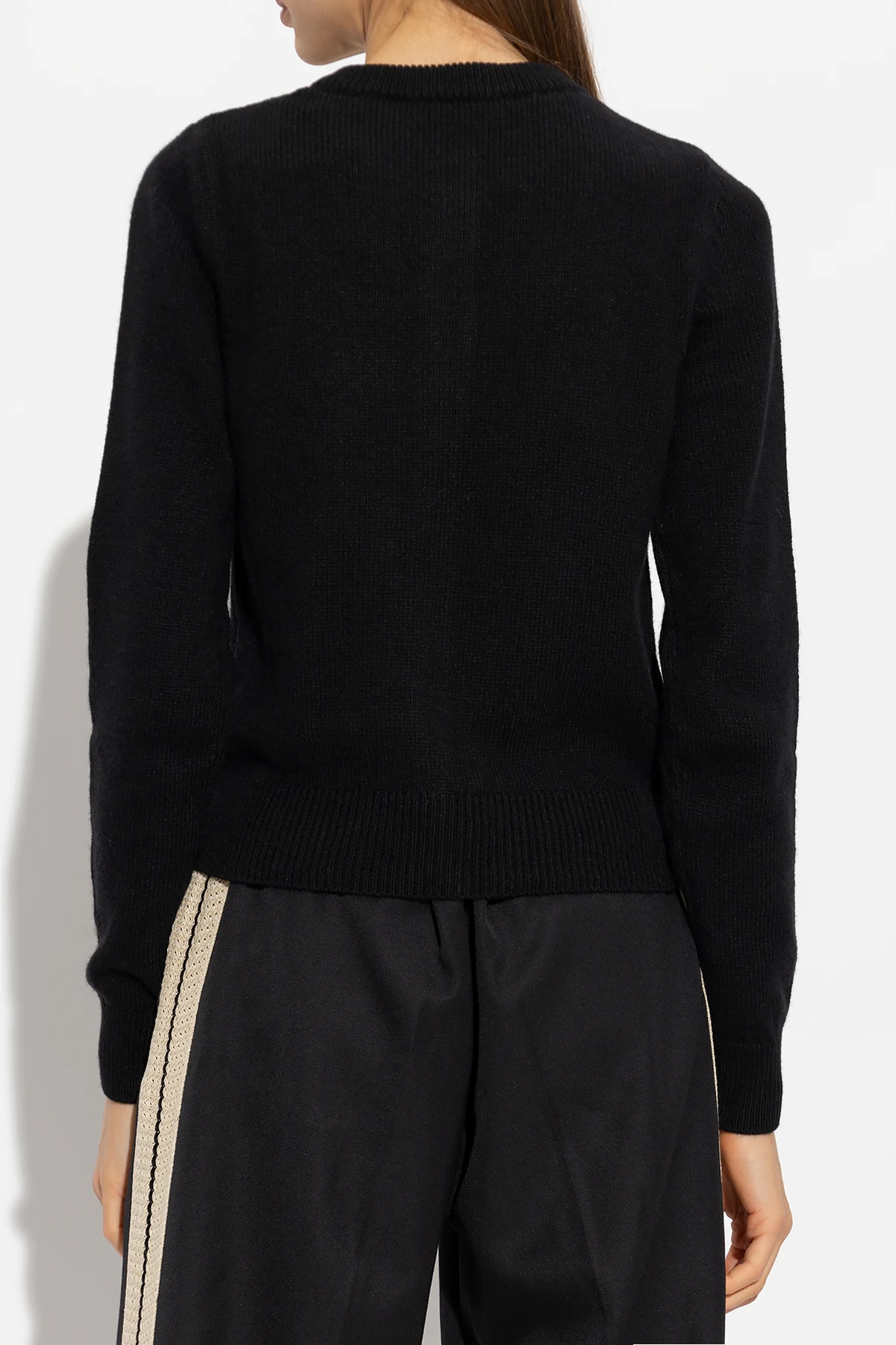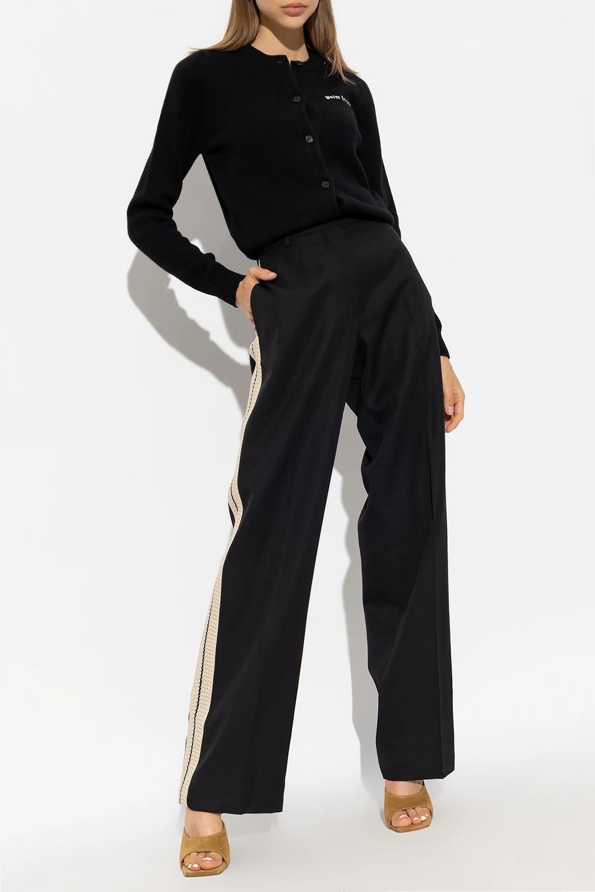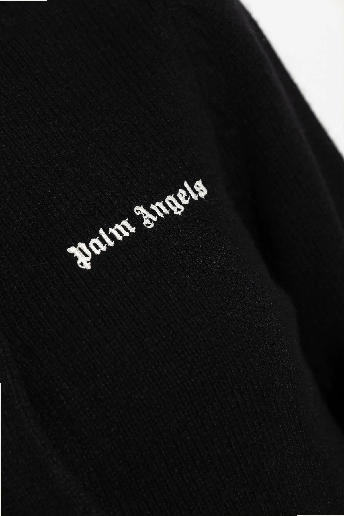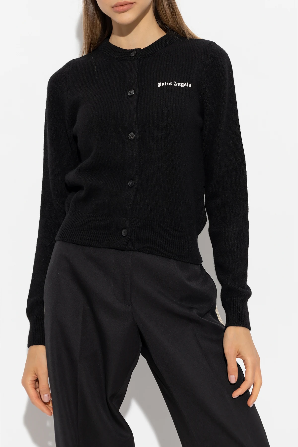 Czarny kardigan Palm Angels. Wykonany częściowo z wełny merino i kaszmiru. Zapinany z przodu na guziki. Ozdobiony wyszytym białą nicią logo. Okrągły dekolt, długie rękawy oraz dół wykończone ściągaczem.